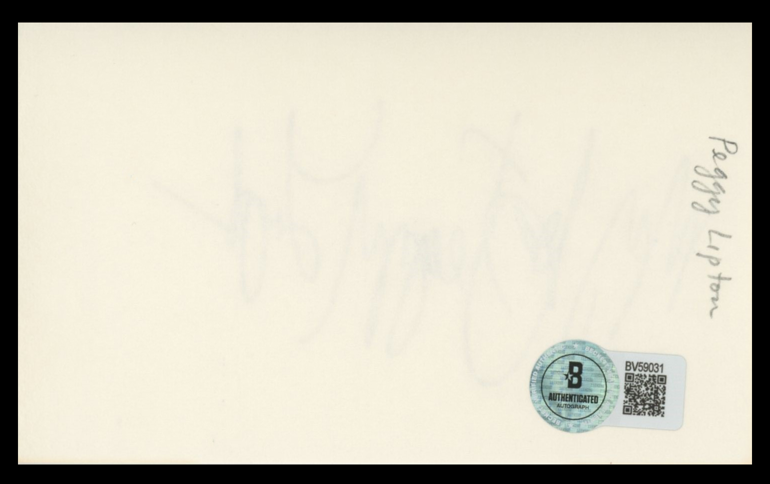 This Autographed 3x5 Index Card with the inscription of "My Best" has been Personally Signed by Peggy Lipton of The Mod Squad. This item is 100% Authentic to include a hologram by Beckett Authentication Services. This item will come with an affixed Beckett Authentication Services (BAS) authentication sticker, which includes a scannable QR code to verify authenticity. Please note that Beckett no longer provides serial-numbered COA cards, and the attached BAS sticker will serve as the complete authentication for this item. The authenticity can be verified on Beckett Authentication Services website.