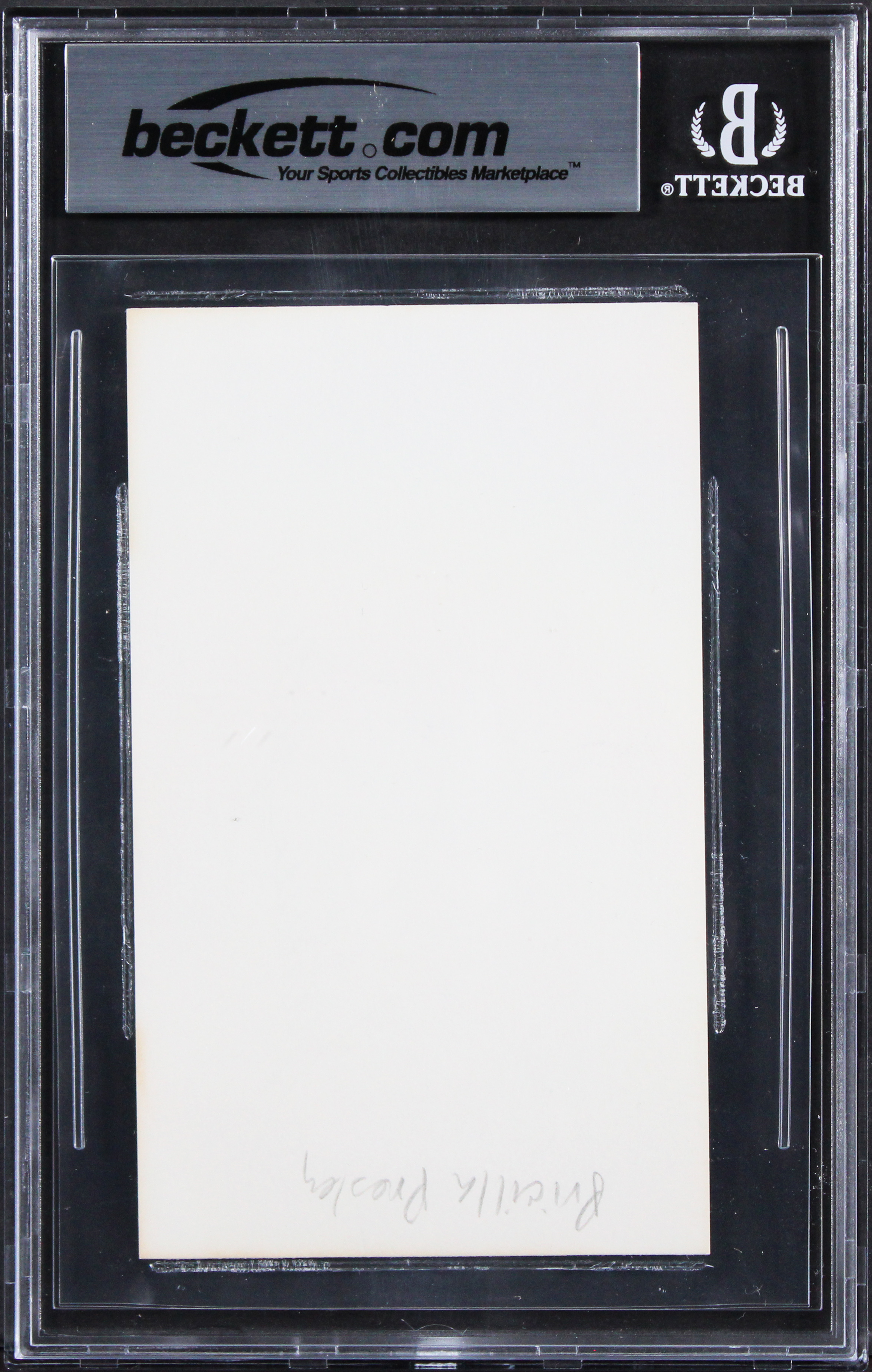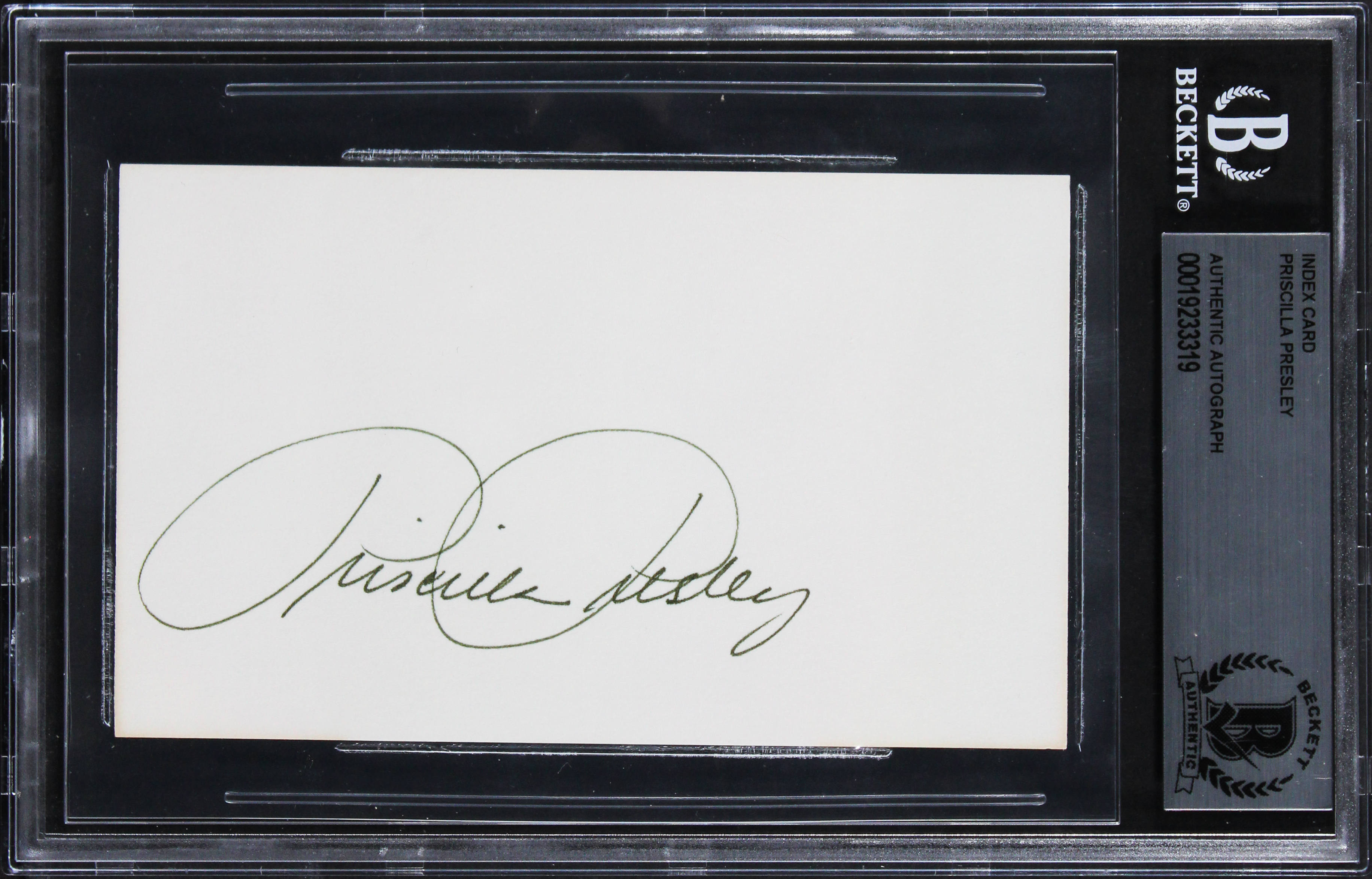 This Autographed 3x5 Index Card has been Personally Signed by Priscilla Presley of The Naked Gun. This item is 100% Authentic, it comes slabbed and authenticated by Beckett Authentication Services. The authenticity can be verified on Beckett Authentication Services website.