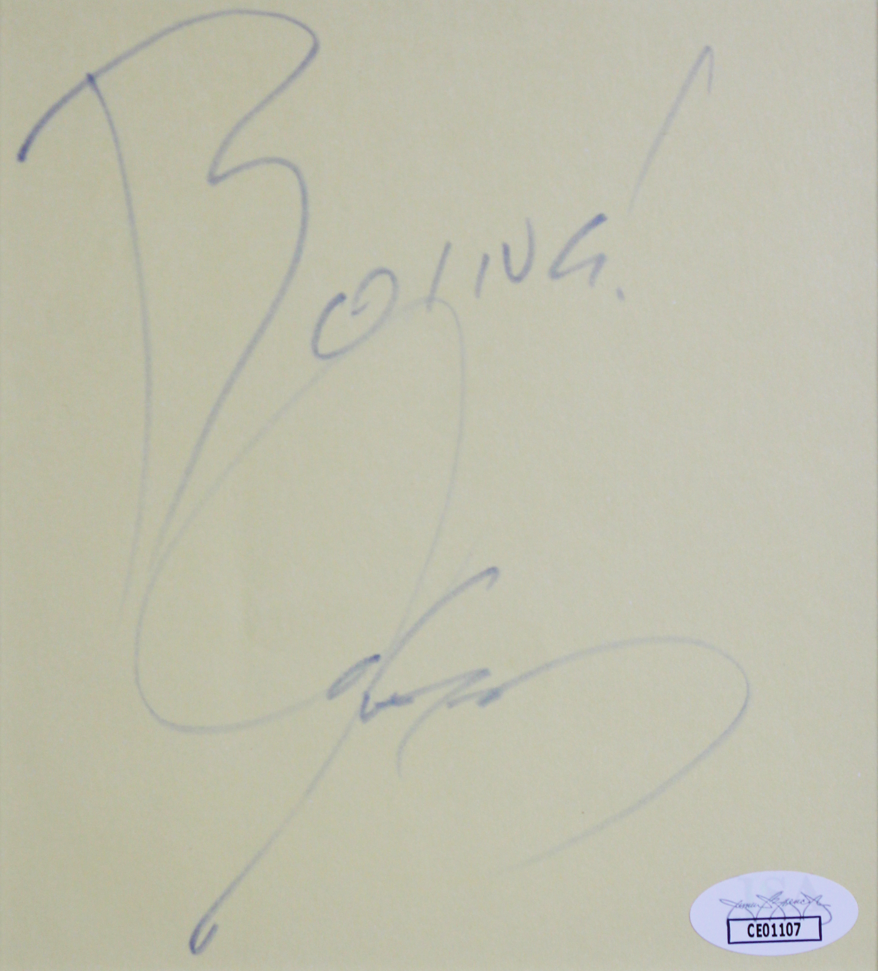 This Autographed & Framed 5.5x6 Cut Signature with the inscription of "Boing!" has been Personally Signed by Jim Carrey of The Mask. This item is 100% Authentic to include a Certificate of Authenticity (COA) / hologram by JSA. The authenticity can be verified on JSA website. This item has been professionally framed to overall dimensions of approximately 24.5 x 30.5 inches.