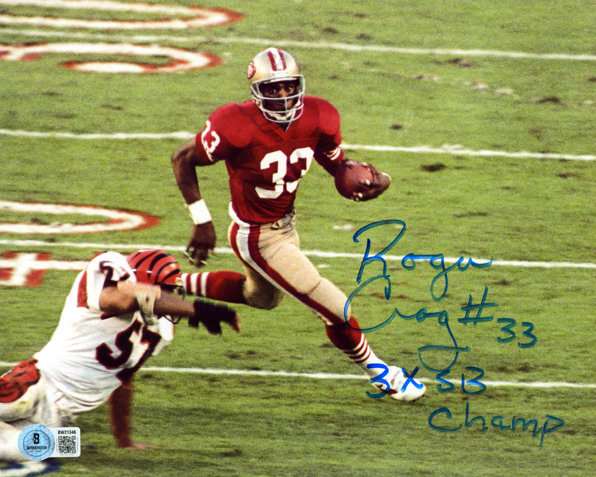 This Autographed Horizontal 8x10 Photo with the inscription of "3X SB Champ" has been Personally Signed by Roger Craig of the San Francisco 49ers. This item is 100% Authentic to include a hologram by Beckett Authentication Services. This item will come with an affixed Beckett Authentication Services (BAS) authentication sticker, which includes a scannable QR code to verify authenticity. Please note that Beckett no longer provides serial-numbered COA cards, and the attached BAS sticker will serve as the complete authentication for this item. The authenticity can be verified on Beckett Authentication Services website.