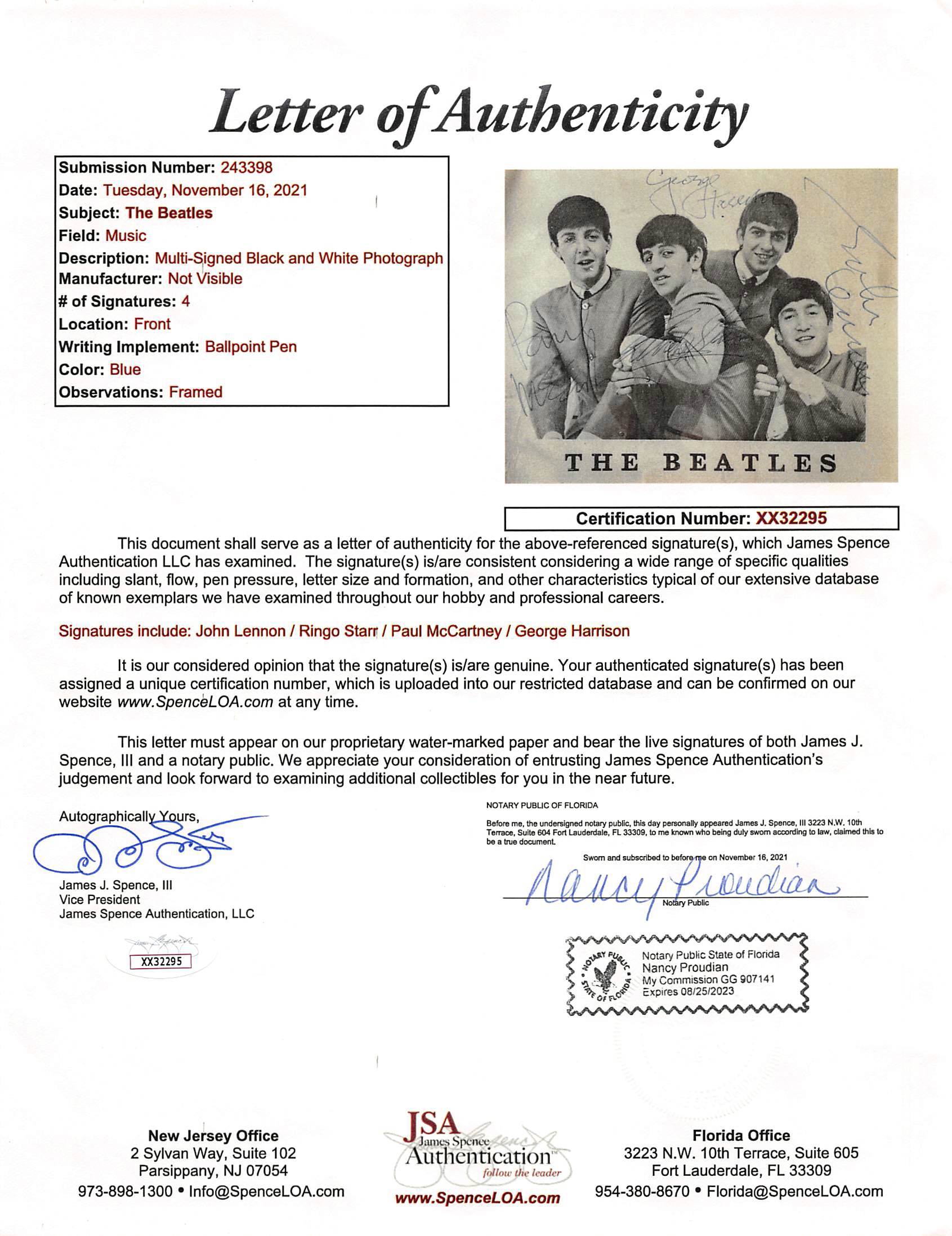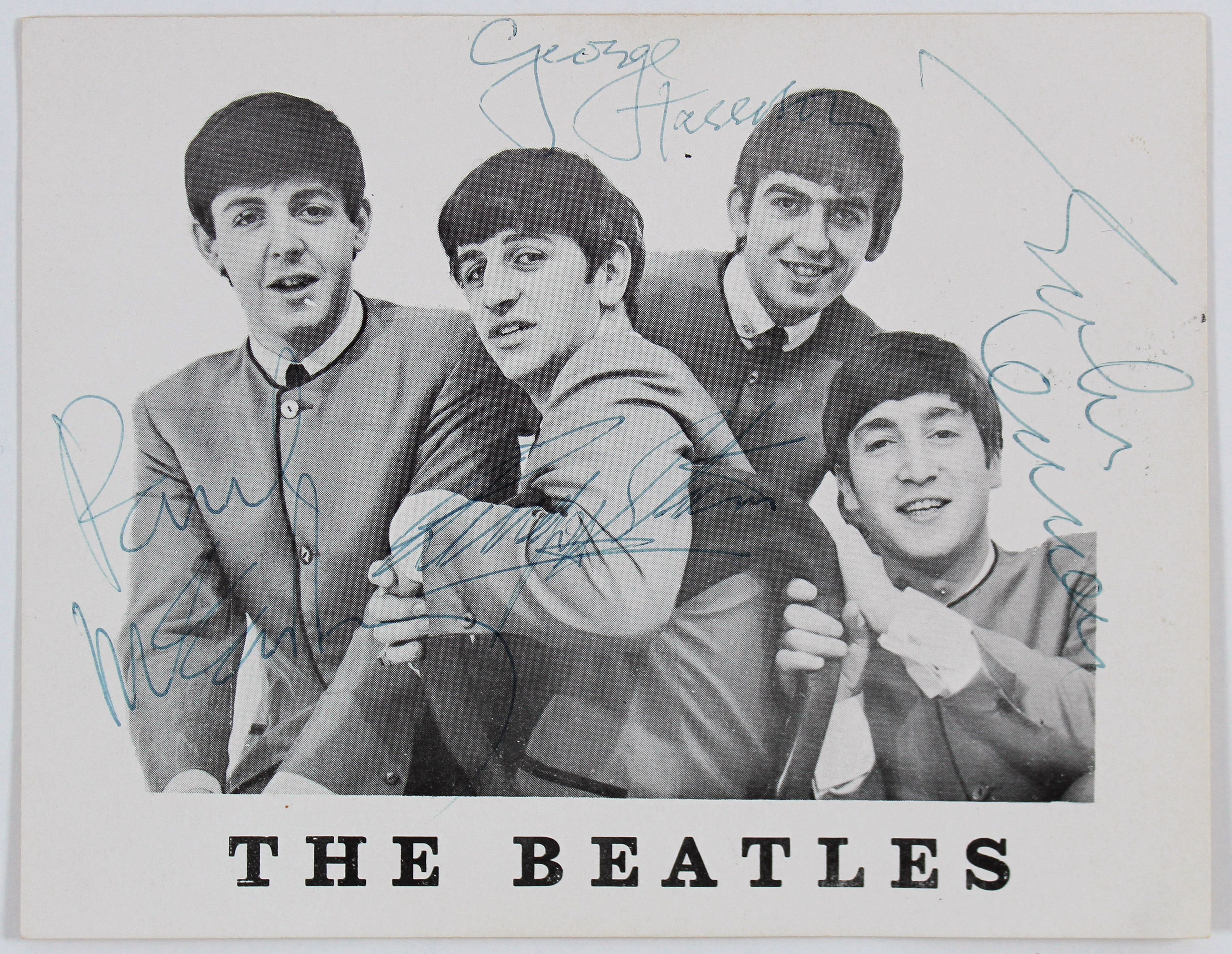 This Autographed 4.25x5.5 Fan Club Photo Card has been Personally Signed by John Lennon, Paul McCartney, George Harrison & Ringo Starr of The Beatles. This item is 100% Authentic to include a Certificate of Authenticity (COA) / hologram by JSA. The authenticity can be verified on JSA website.