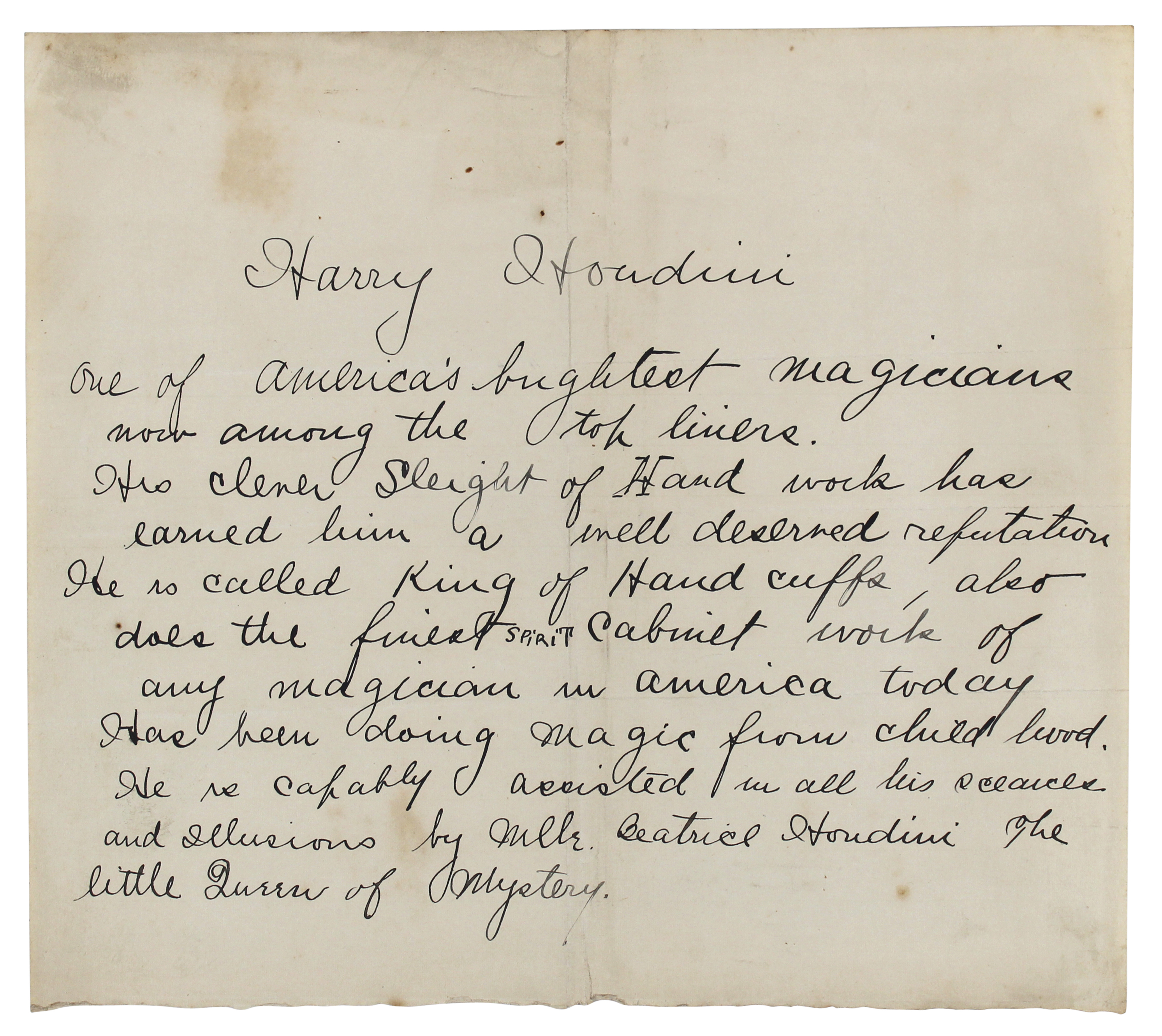 This Autographed Circa 1910 7.25x8.25 Handwritten Press Release Document has been Personally Signed by Harry Houdini. This item is 100% Authentic to include a Certificate of Authenticity (COA) / hologram by Beckett Authentication Services. The authenticity can be verified on Beckett Authentication Services website. This handwritten press release, no date but circa 1910. Reads in full: "Harry Houdini one of America's brightest magicians now among the top liners. His clever sleight of hand work has earned him a well deserved reputation. He is called King of Handcuffs, also does the finest spirit cabinet work of any magician in America today. Has been doing magic from childhood. He is capably assisted in all his seances and illusions by Mlle. Beatrice Houdini the Little Queen of Mystery."