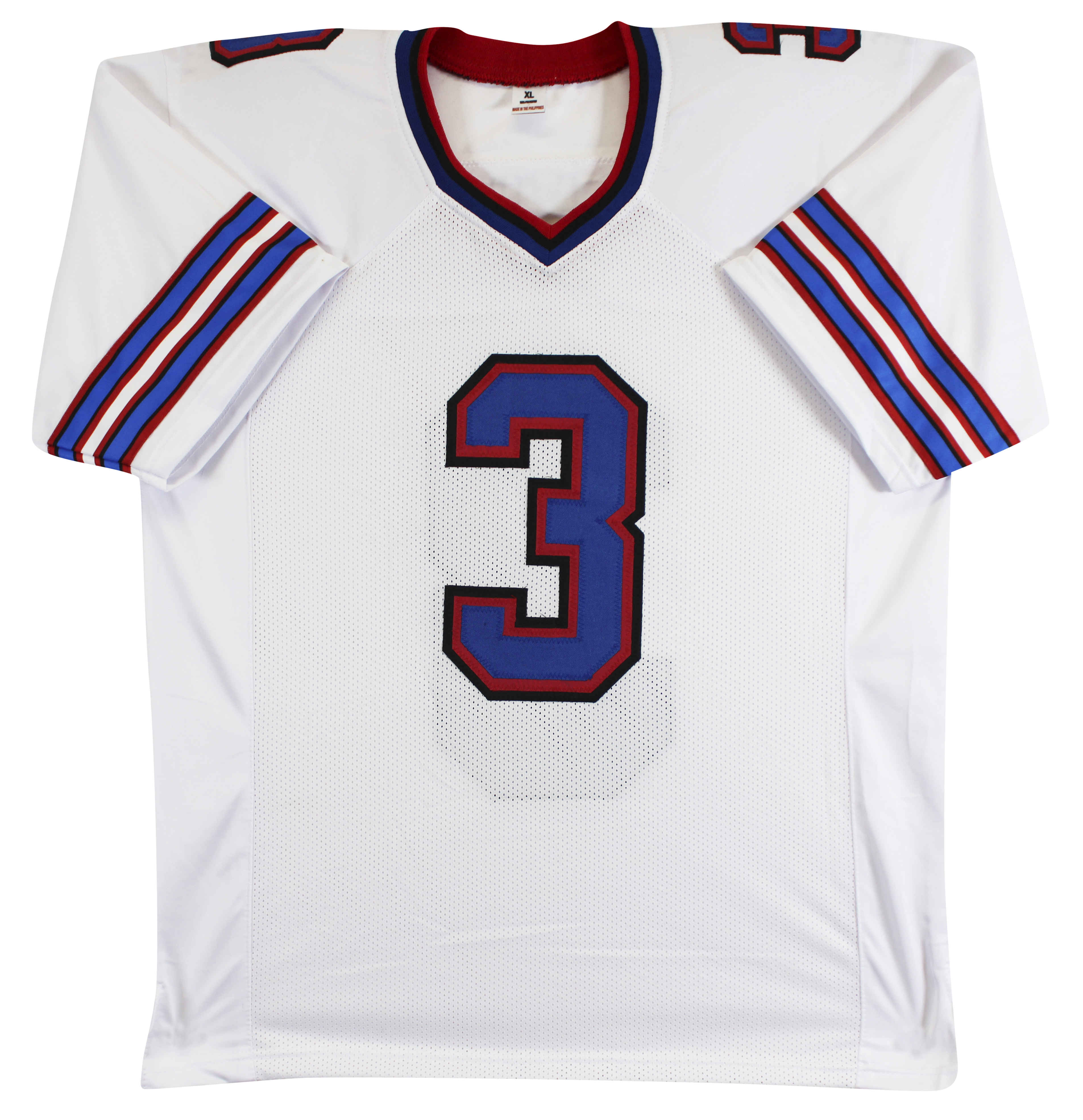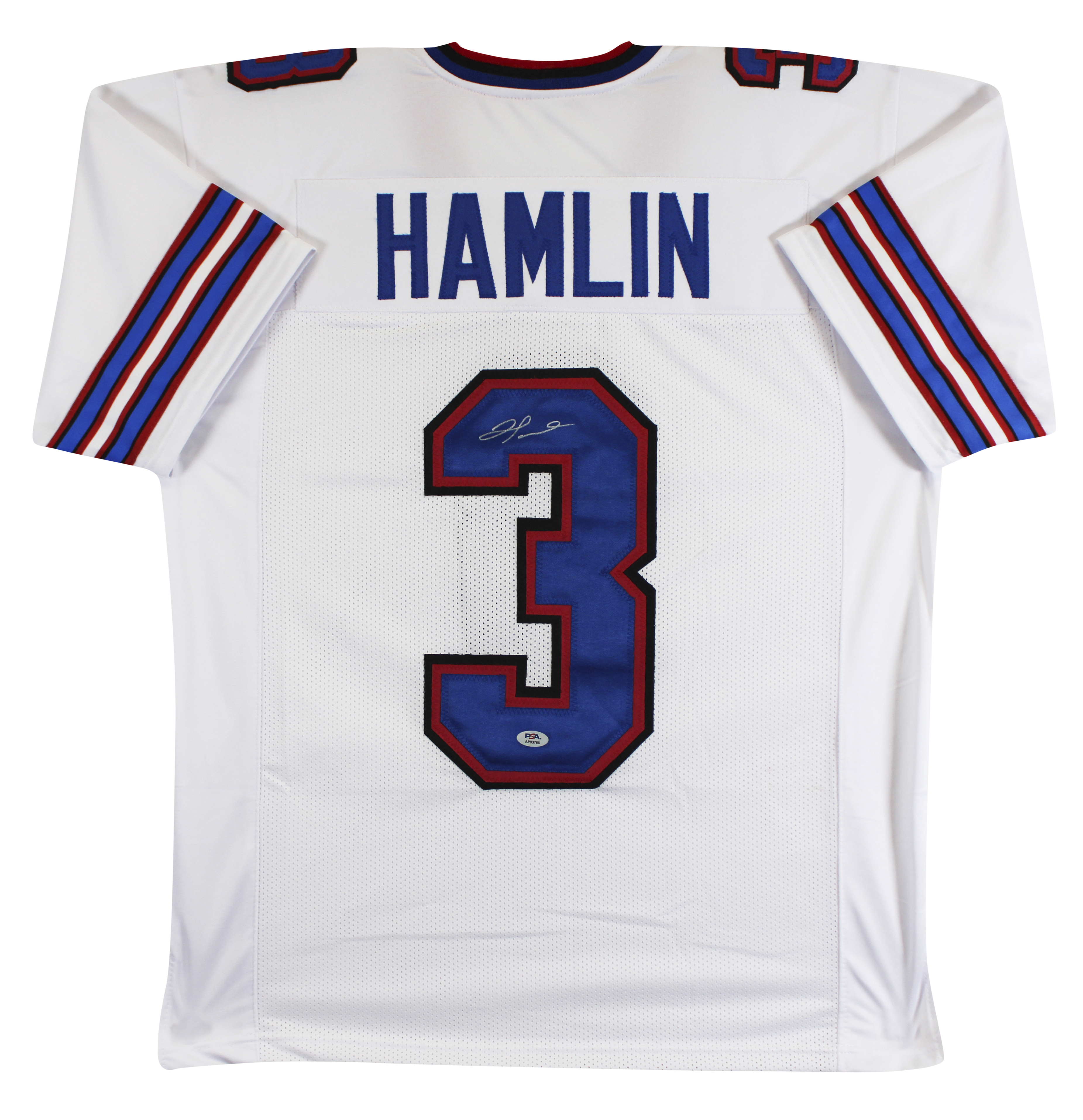 This Autographed White Pro Style Jersey has been Personally Signed by Damar Hamlin of the Buffalo Bills. This item is 100% Authentic and comes with a PSA/DNA Certification numbered Hologram. Please note that PSA/DNA no longer provides serial-numbered COA cards, and the attached PSA/DNA sticker will serve as the complete authentication for this item. We conducted an autograph signing with Damar Hamlin where multiples of the same item were signed. While the photographs are representative of this item, the size, placement and strength of the signature may vary. Each item is hand signed, therefore, each autograph is unique. This item can be verified through PSA/DNA Holo. This is a X-Large sized, non-branded, custom-stitched Jersey.