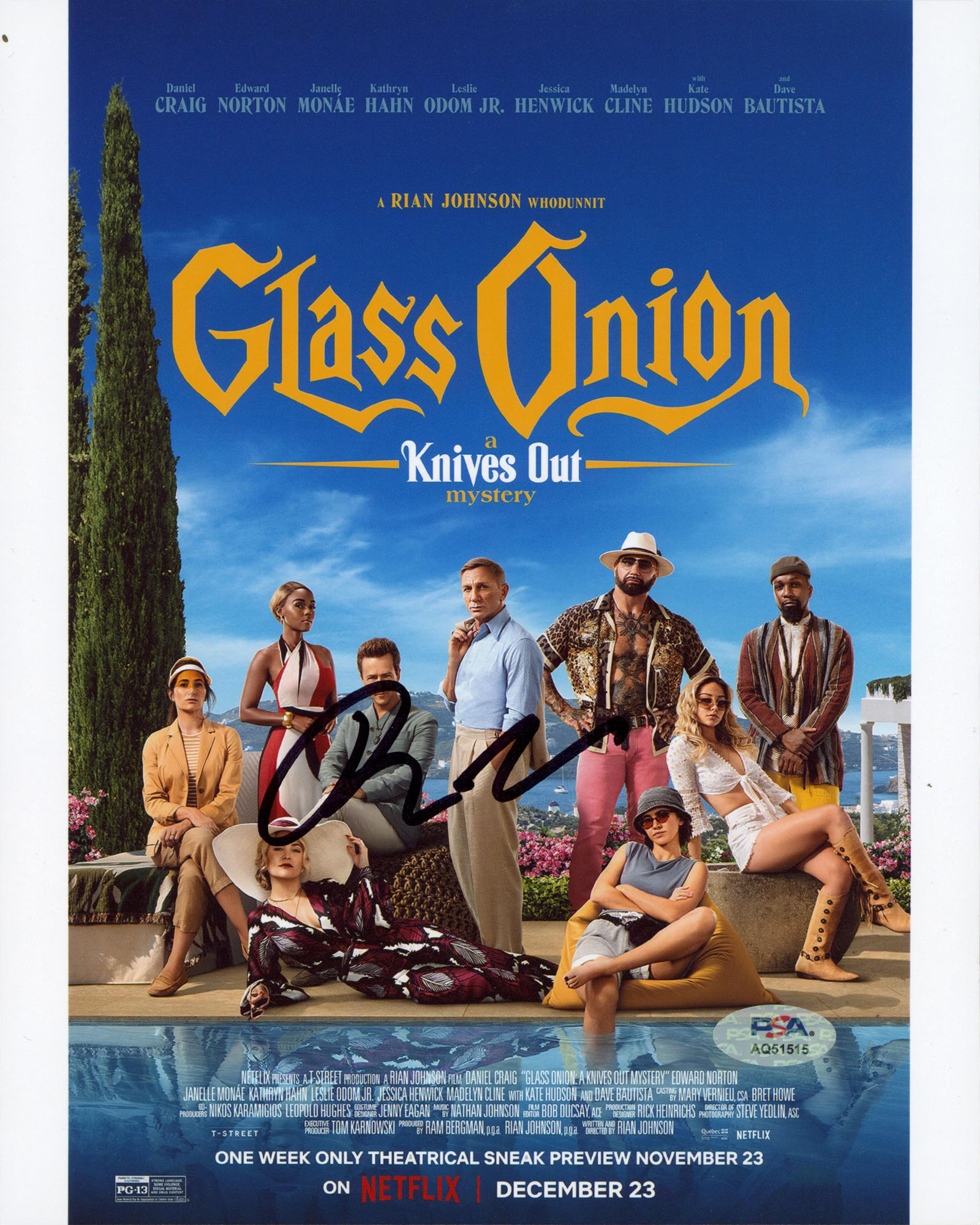 This Autographed Vertical 8x10 Photo has been Personally Signed by Rian Johnson of Glass Onion: A Knives Out Mystery. This item is 100% Authentic and comes with a PSA/DNA Certification numbered Hologram. Please note that PSA/DNA no longer provides serial-numbered COA cards, and the attached PSA/DNA sticker will serve as the complete authentication for this item. The authenticity can be verified on Professional Sports Authenticators website.