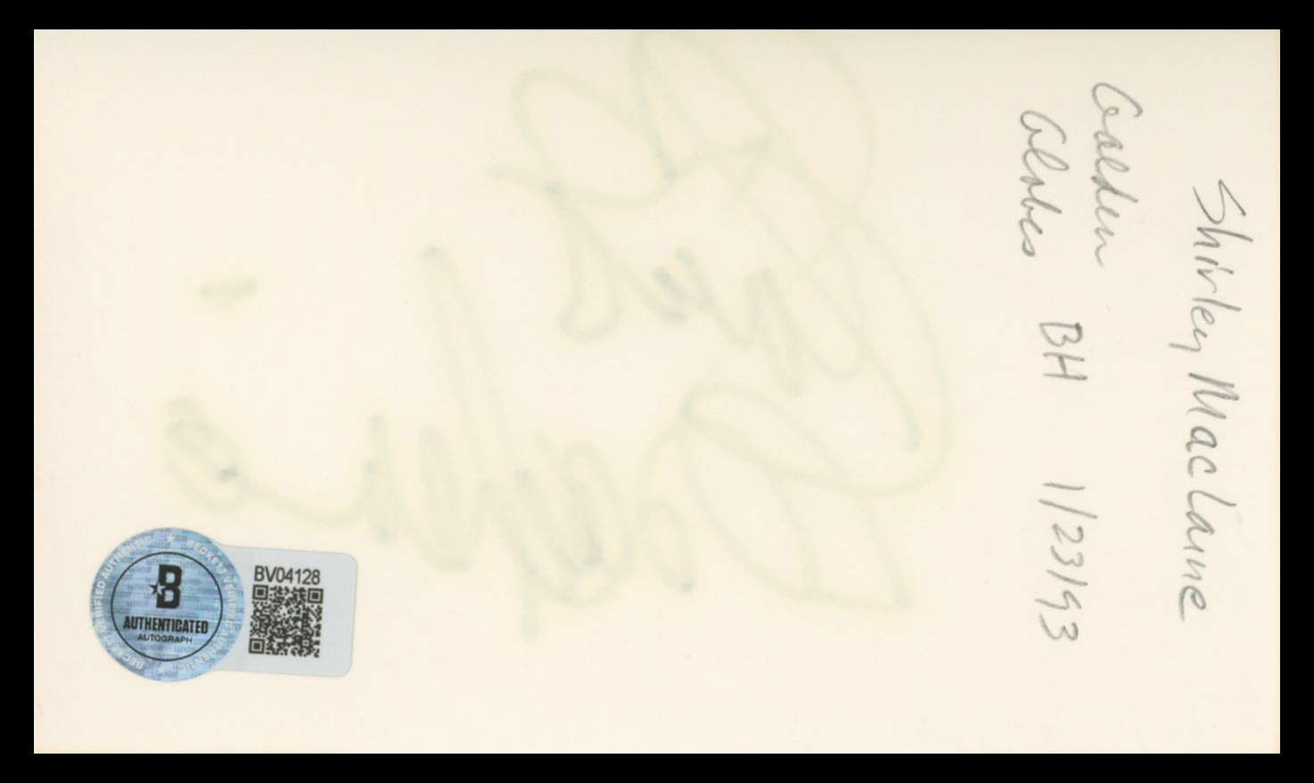 This Autographed 3x5 Index Card has been Personally Signed by Shirley MacLaine of Terms of Endearment. This item is 100% Authentic to include a hologram by Beckett Authentication Services. This item will come with an affixed Beckett Authentication Services (BAS) authentication sticker, which includes a scannable QR code to verify authenticity. Please note that Beckett no longer provides serial-numbered COA cards, and the attached BAS sticker will serve as the complete authentication for this item. The authenticity can be verified on Beckett Authentication Services website.