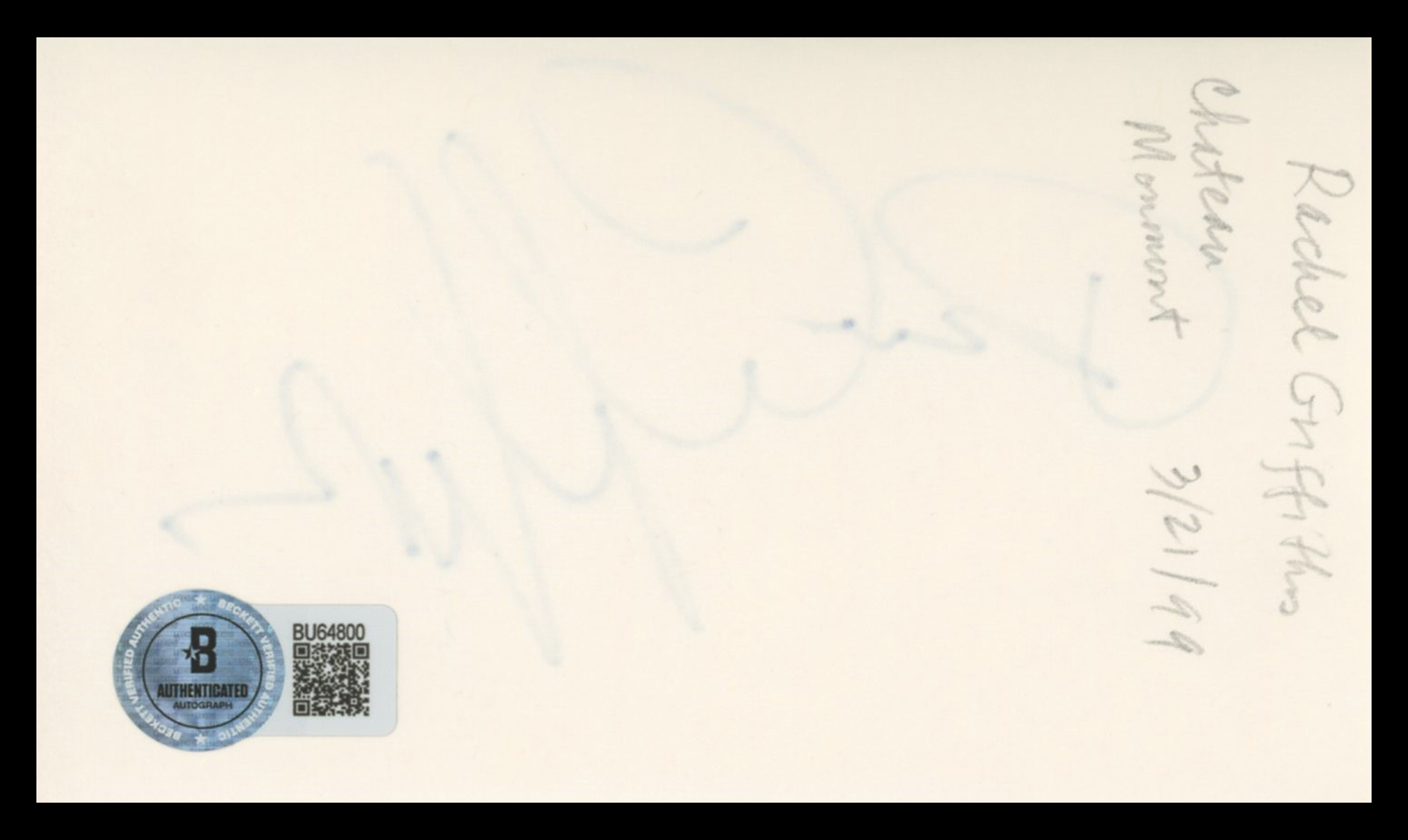 This Autographed 3x5 Index Card has been Personally Signed by Rachel Griffiths of Six Feet Under. This item is 100% Authentic to include a hologram by Beckett Authentication Services. This item will come with an affixed Beckett Authentication Services (BAS) authentication sticker, which includes a scannable QR code to verify authenticity. Please note that Beckett no longer provides serial-numbered COA cards, and the attached BAS sticker will serve as the complete authentication for this item. The authenticity can be verified on Beckett Authentication Services website.