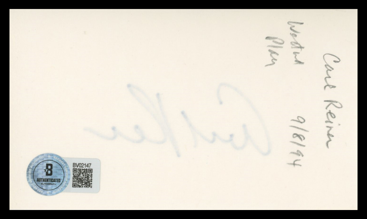 This Autographed 3x5 Index Card has been Personally Signed by Carl Reiner of The Dick Van Dyke Show. This item is 100% Authentic to include a hologram by Beckett Authentication Services. This item will come with an affixed Beckett Authentication Services (BAS) authentication sticker, which includes a scannable QR code to verify authenticity. Please note that Beckett no longer provides serial-numbered COA cards, and the attached BAS sticker will serve as the complete authentication for this item. The authenticity can be verified on Beckett Authentication Services website.