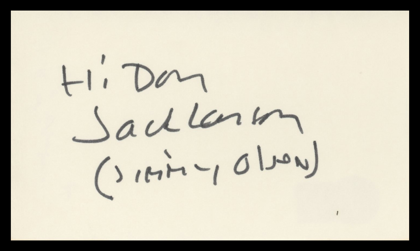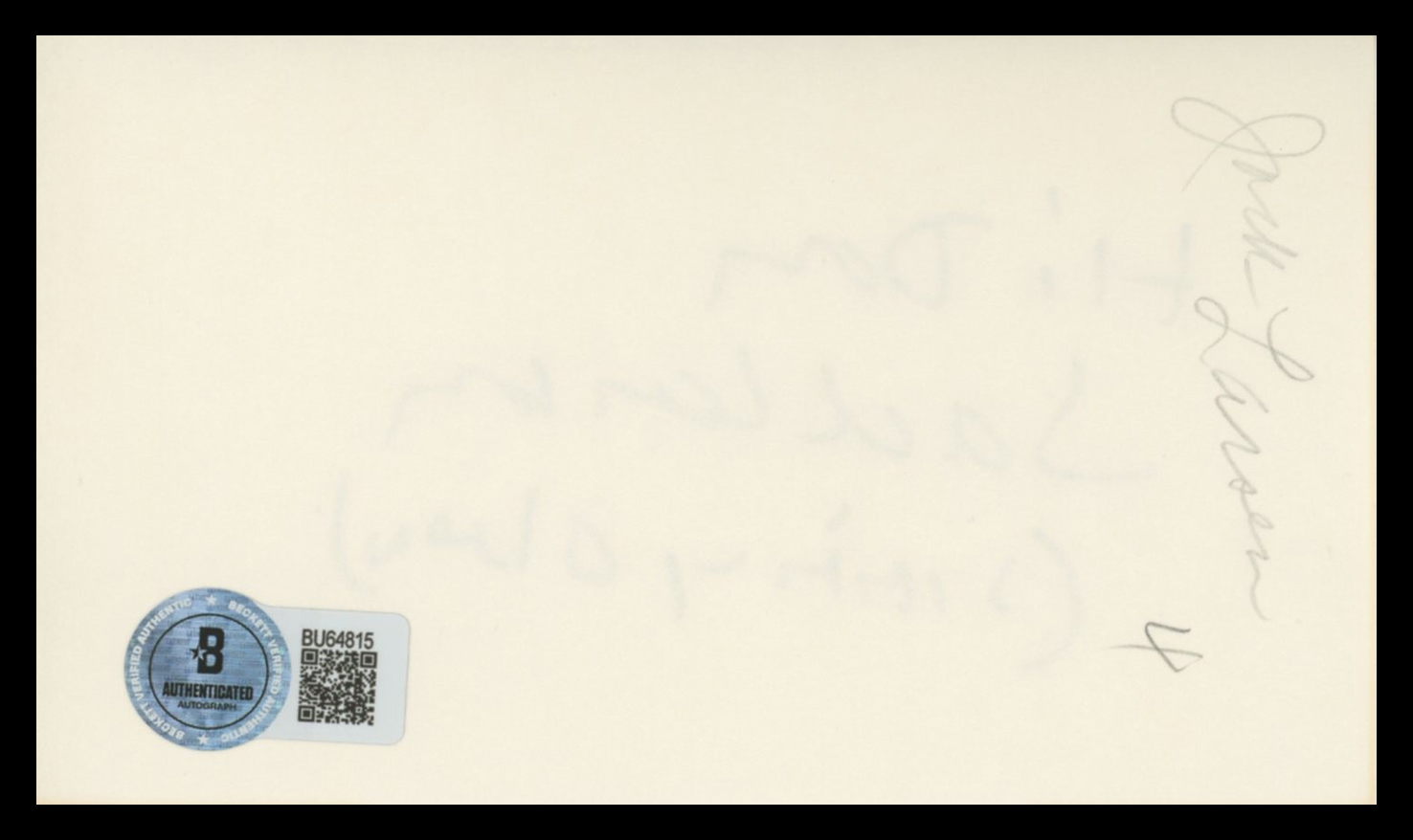 This Autographed 3x5 Index Card with the inscription of "Hi, Don-Jimmy Olsen" has been Personally Signed by Jack Larson of Adventures of Superman. This item is 100% Authentic to include a hologram by Beckett Authentication Services. This item will come with an affixed Beckett Authentication Services (BAS) authentication sticker, which includes a scannable QR code to verify authenticity. Please note that Beckett no longer provides serial-numbered COA cards, and the attached BAS sticker will serve as the complete authentication for this item. The authenticity can be verified on Beckett Authentication Services website.
