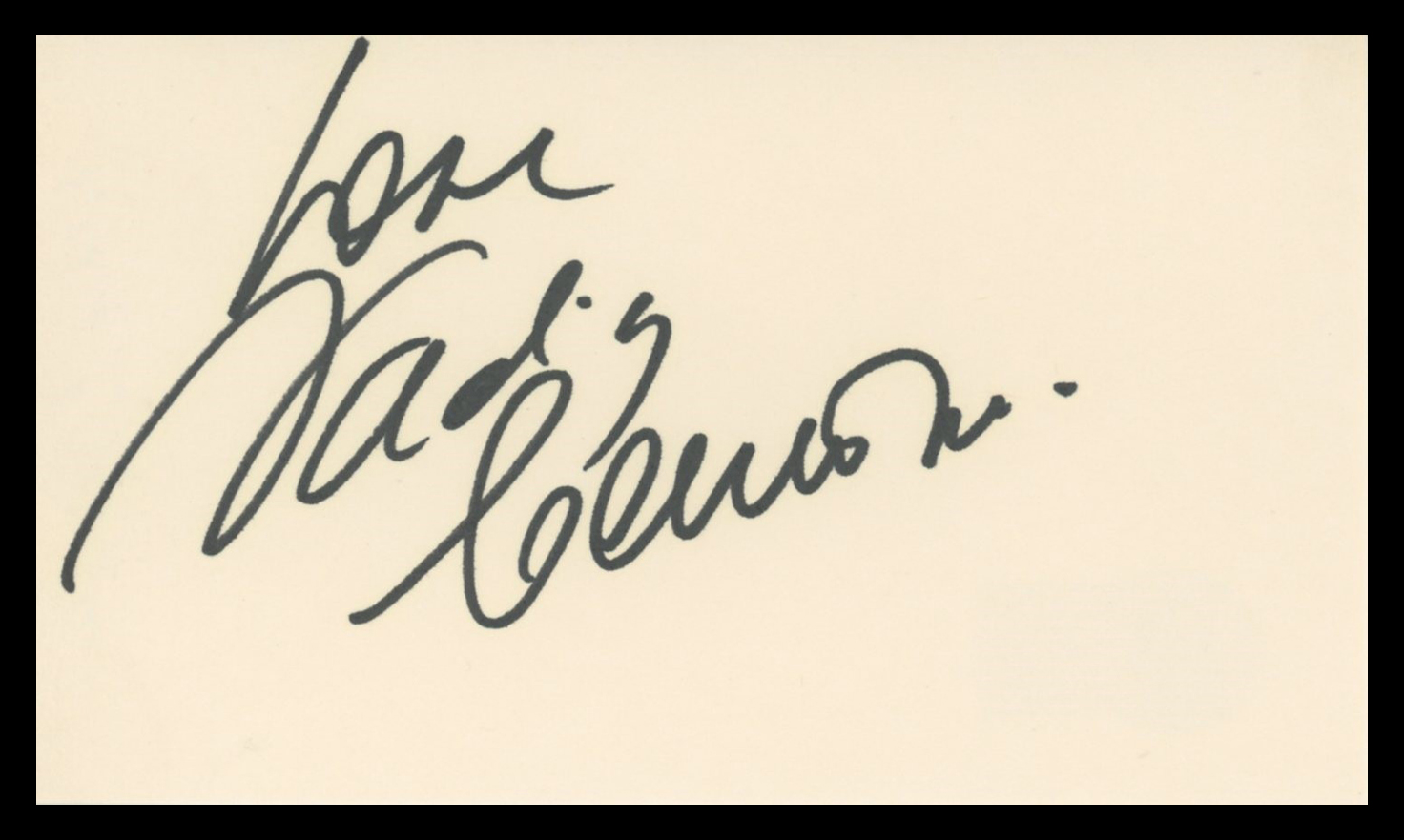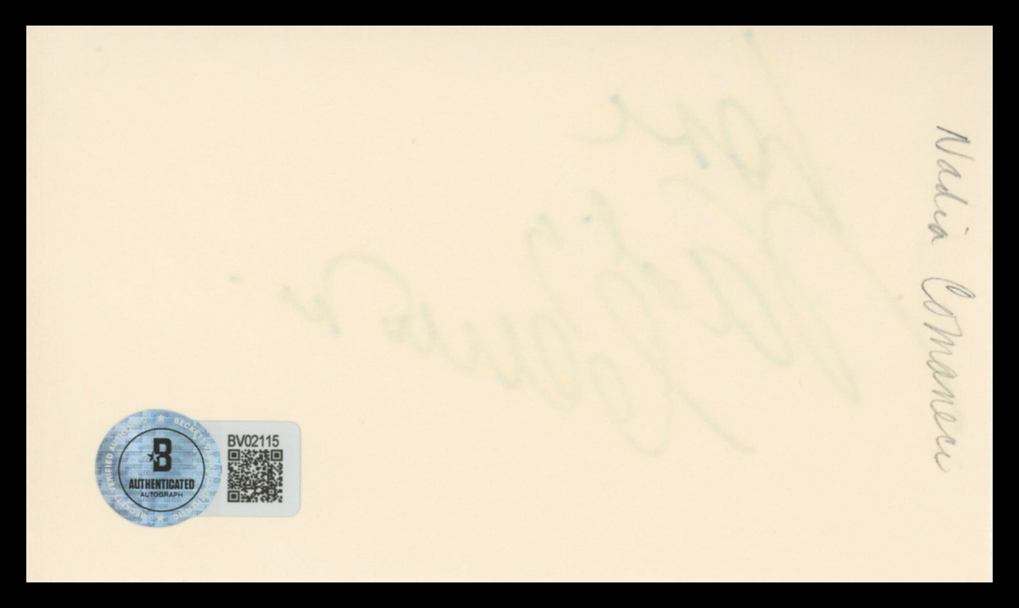 This Autographed 3x5 Index Card with the inscription of "Love" has been Personally Signed by Nadia Comaneci of Nadia. This item is 100% Authentic to include a hologram by Beckett Authentication Services. This item will come with an affixed Beckett Authentication Services (BAS) authentication sticker, which includes a scannable QR code to verify authenticity. Please note that Beckett no longer provides serial-numbered COA cards, and the attached BAS sticker will serve as the complete authentication for this item. The authenticity can be verified on Beckett Authentication Services website.