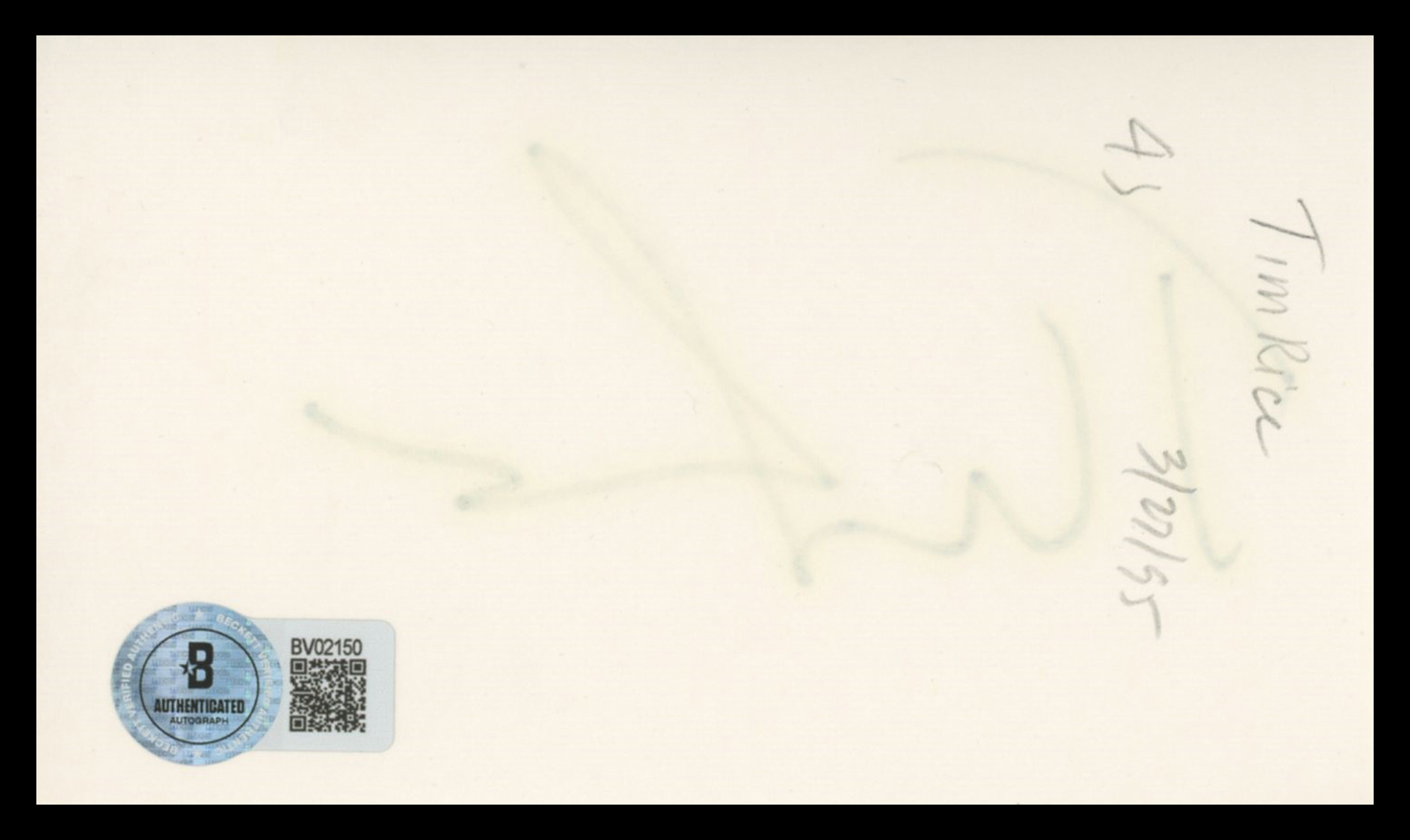 This Autographed 3x5 Index Card has been Personally Signed by Tim Rice of Aladdin. This item is 100% Authentic to include a hologram by Beckett Authentication Services. This item will come with an affixed Beckett Authentication Services (BAS) authentication sticker, which includes a scannable QR code to verify authenticity. Please note that Beckett no longer provides serial-numbered COA cards, and the attached BAS sticker will serve as the complete authentication for this item. The authenticity can be verified on Beckett Authentication Services website.