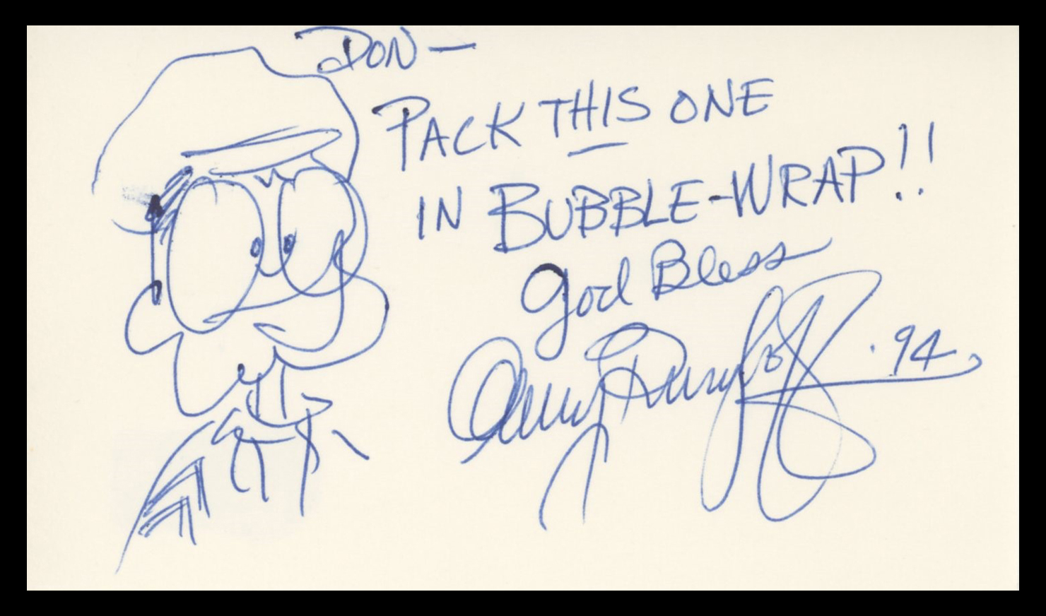 This Autographed 3x5 Index Card with the inscription of "Don- Pack this one in bubble wrap!!- God Bless- 94" has been Personally Signed by Gary Burghoff of M*A*S*H. This item is 100% Authentic to include a hologram by Beckett Authentication Services. This item will come with an affixed Beckett Authentication Services (BAS) authentication sticker, which includes a scannable QR code to verify authenticity. Please note that Beckett no longer provides serial-numbered COA cards, and the attached BAS sticker will serve as the complete authentication for this item. The authenticity can be verified on Beckett Authentication Services website.
