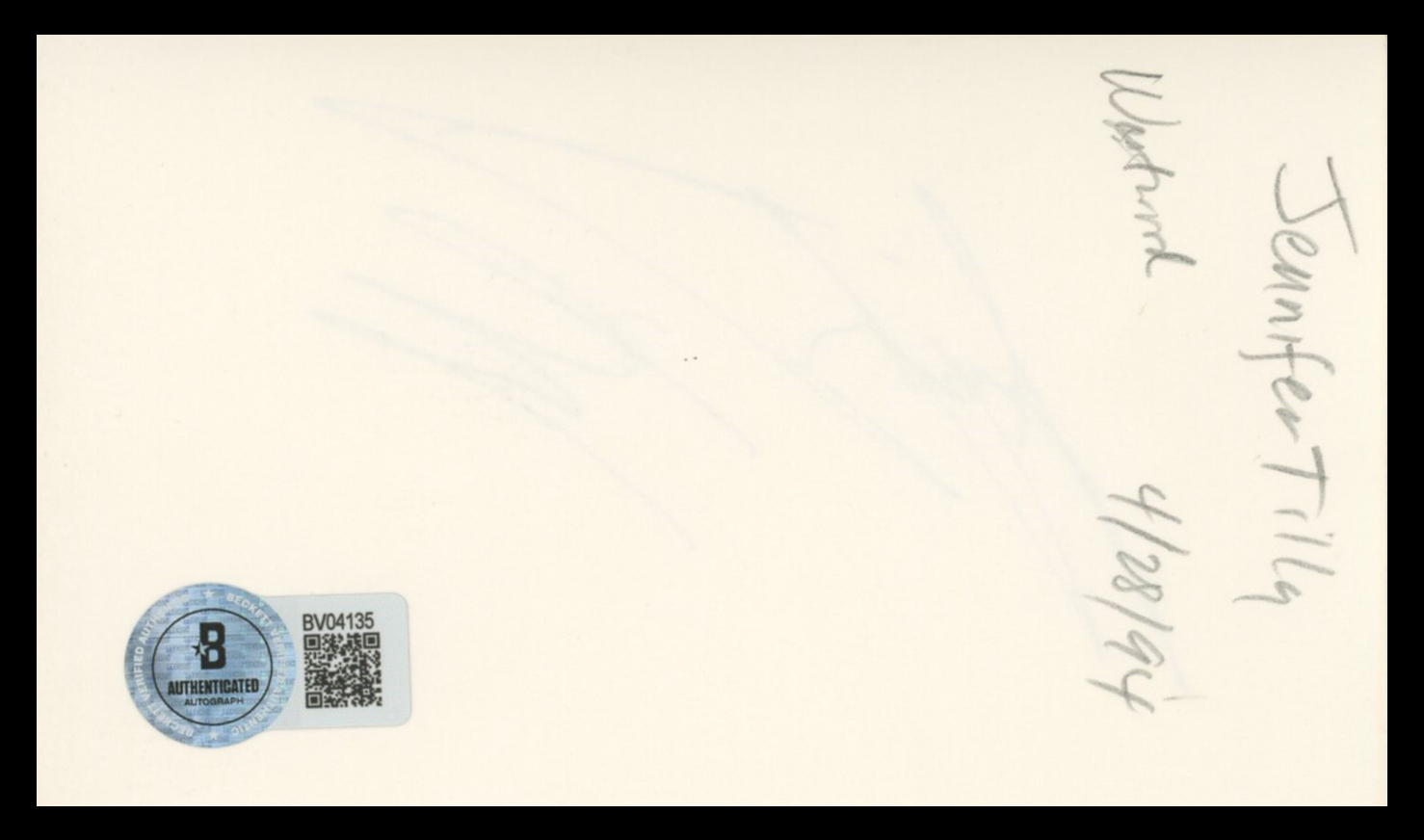 This Autographed 3x5 Index Card has been Personally Signed by Jennifer Tilly of Bride of Chucky. This item is 100% Authentic to include a hologram by Beckett Authentication Services. This item will come with an affixed Beckett Authentication Services (BAS) authentication sticker, which includes a scannable QR code to verify authenticity. Please note that Beckett no longer provides serial-numbered COA cards, and the attached BAS sticker will serve as the complete authentication for this item. The authenticity can be verified on Beckett Authentication Services website.