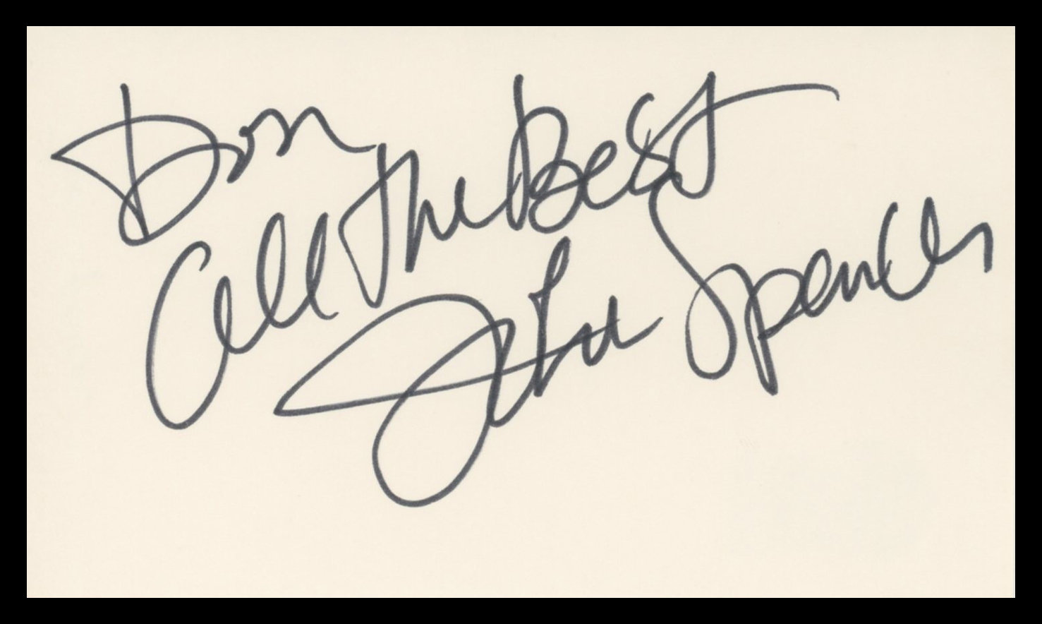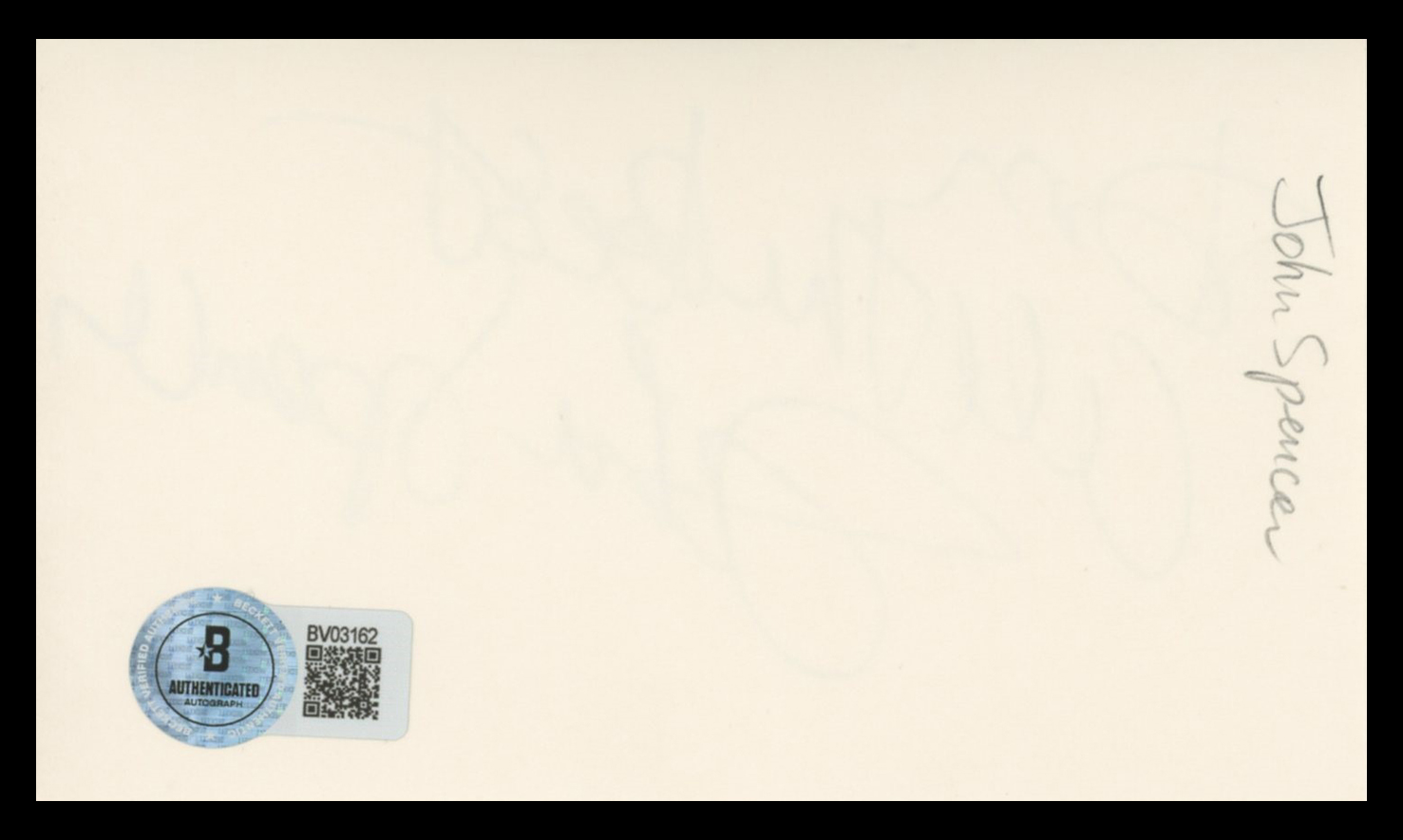 This Autographed 3x5 Index Card with the inscription of "Don, All the Best" has been Personally Signed by John Spencer of The West Wing. This item is 100% Authentic to include a hologram by Beckett Authentication Services. This item will come with an affixed Beckett Authentication Services (BAS) authentication sticker, which includes a scannable QR code to verify authenticity. Please note that Beckett no longer provides serial-numbered COA cards, and the attached BAS sticker will serve as the complete authentication for this item. The authenticity can be verified on Beckett Authentication Services website.