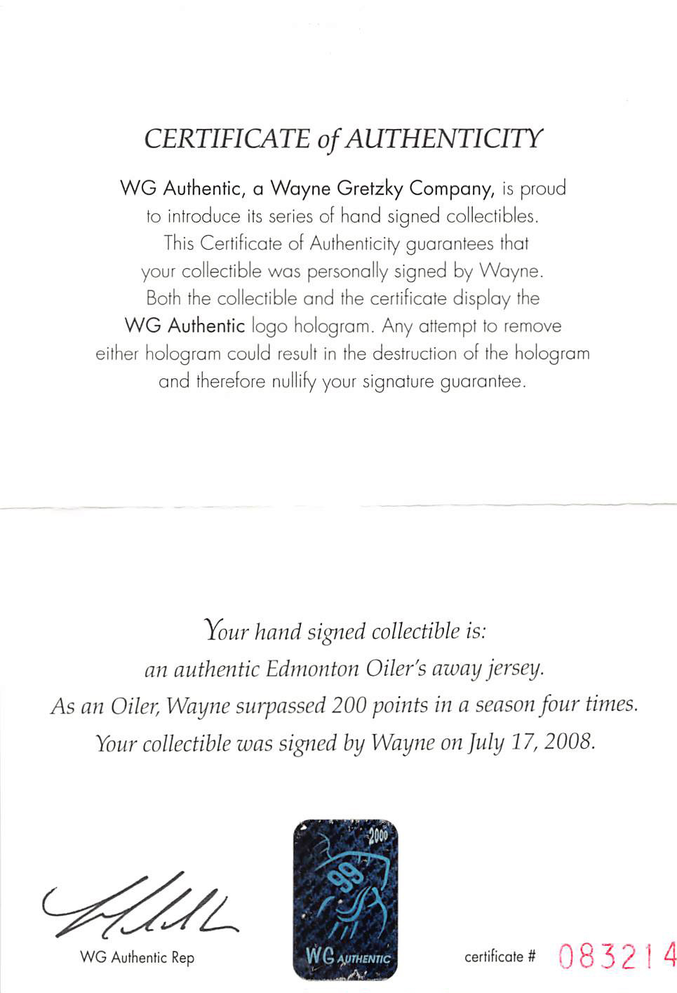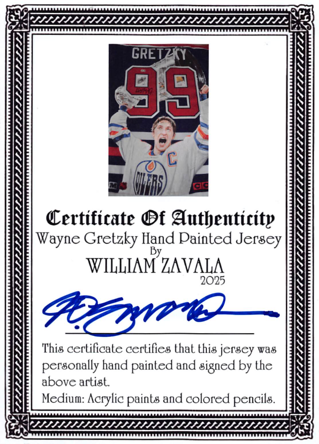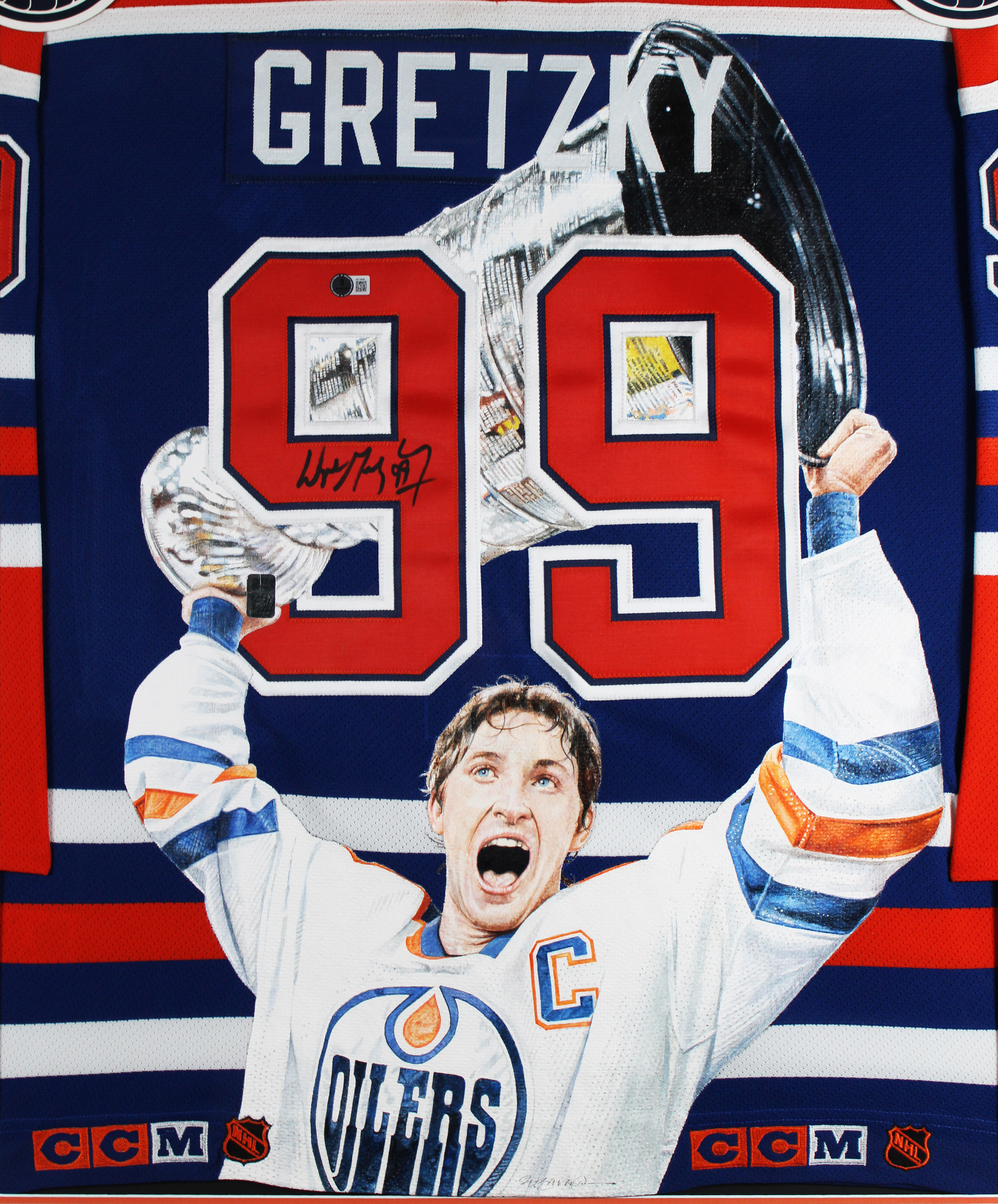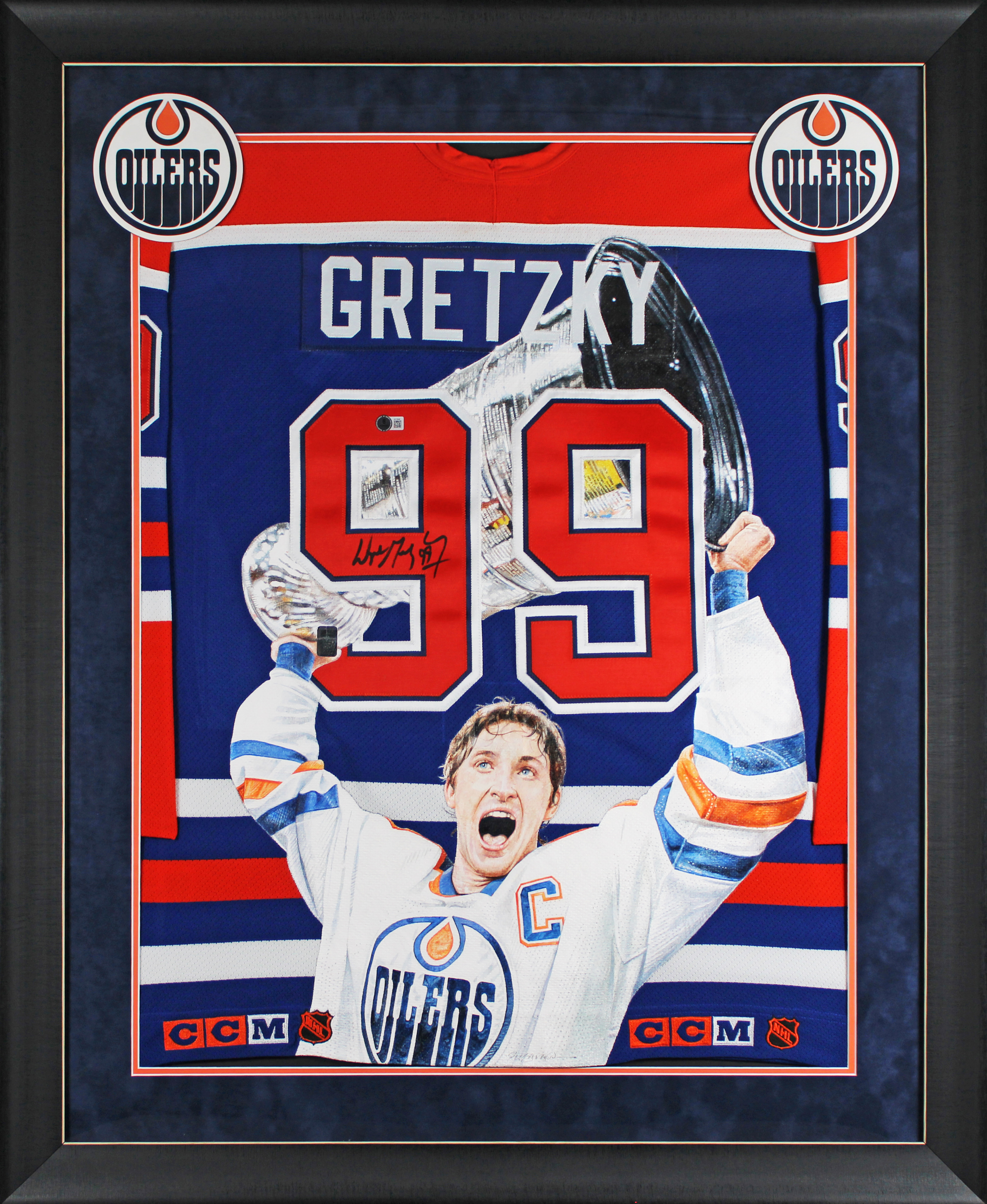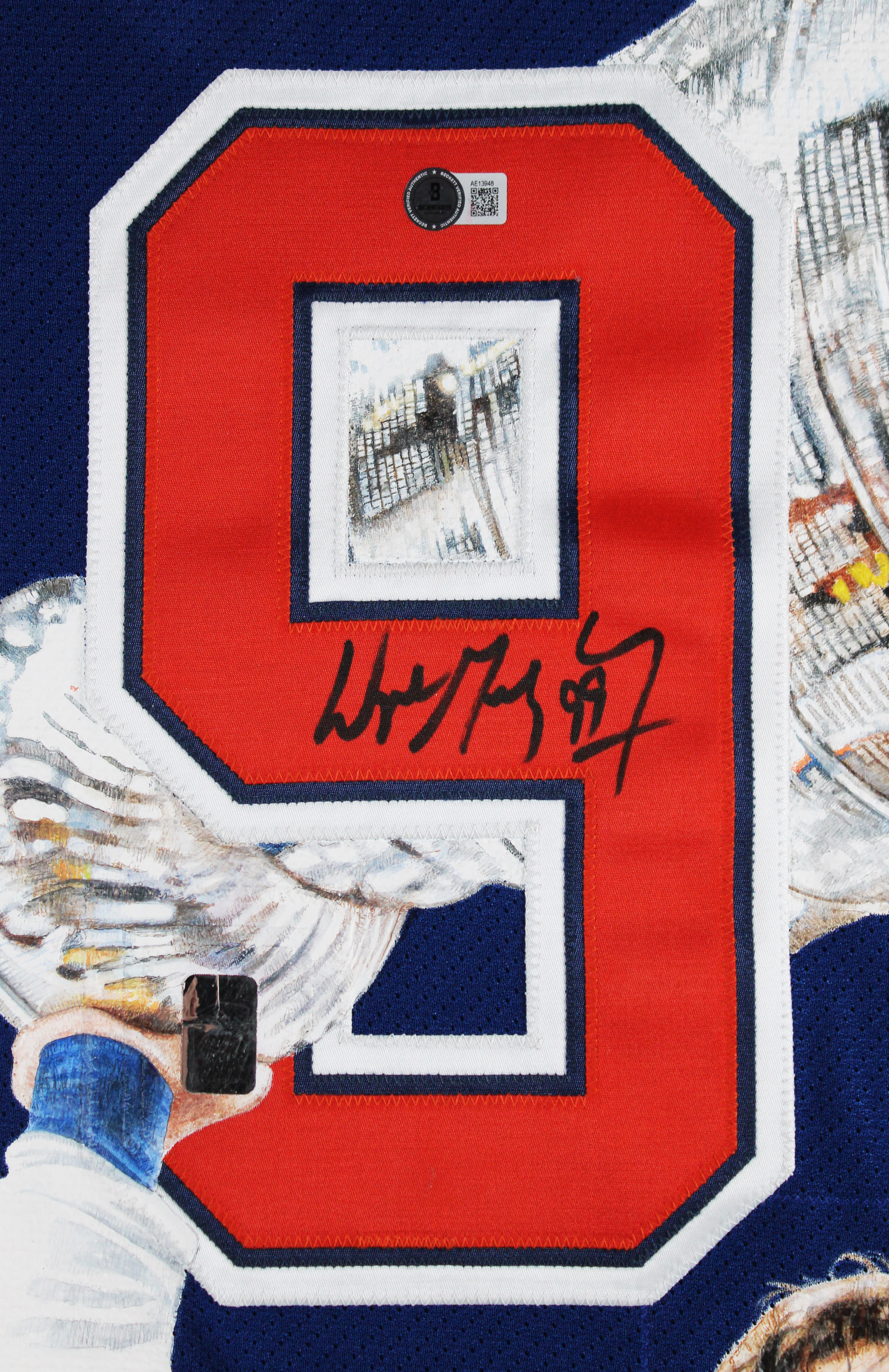 This Autographed Hand Painted Limited Edition 1/1 By William Zavala Blue CCM Framed Jersey has been Personally Signed by Wayne Gretzky of the Edmonton Oilers. This item is 100% Authentic to include a Certificate of Authenticity (COA) / hologram by Beckett Authentication Services. The authenticity can be verified on Beckett Authentication Services website. This item has been professionally framed to overall dimensions of approximately 37 x 44 inches. Press Pass Collectibles only offers Authentic Autographs by Wayne Gretzky through Signings, In-Person Signings or Private Collections to include a 100% money back Lifetime Authenticity Guarantee.