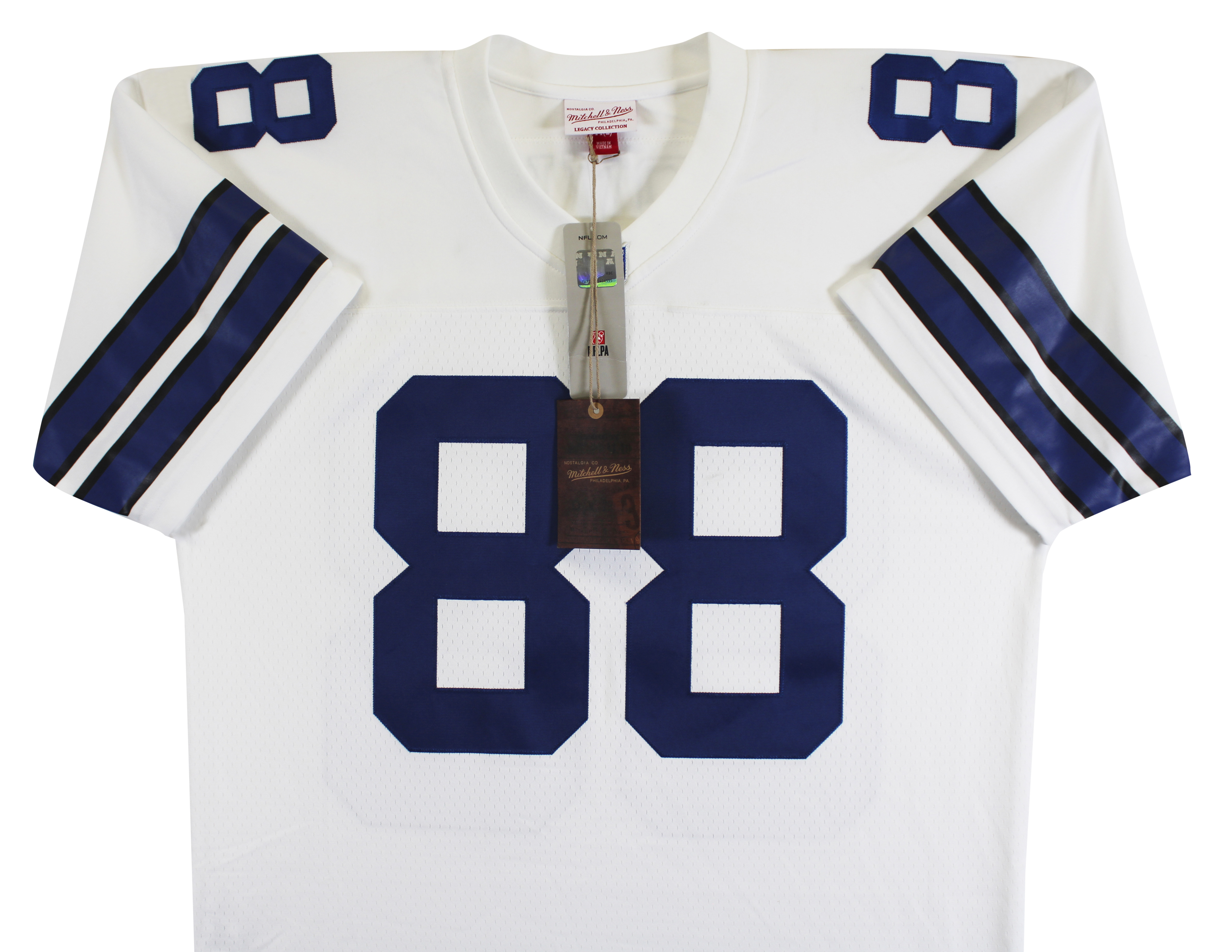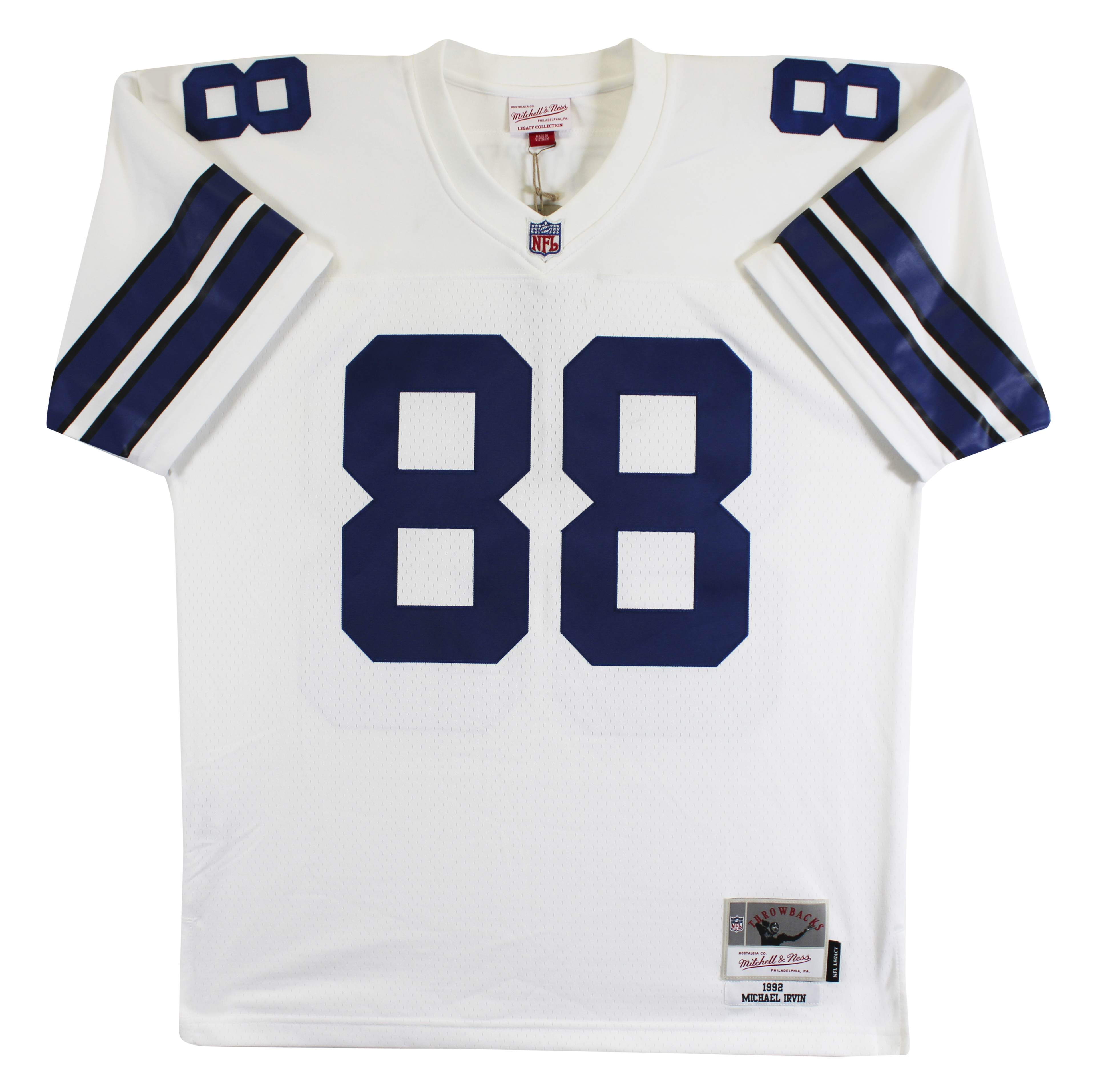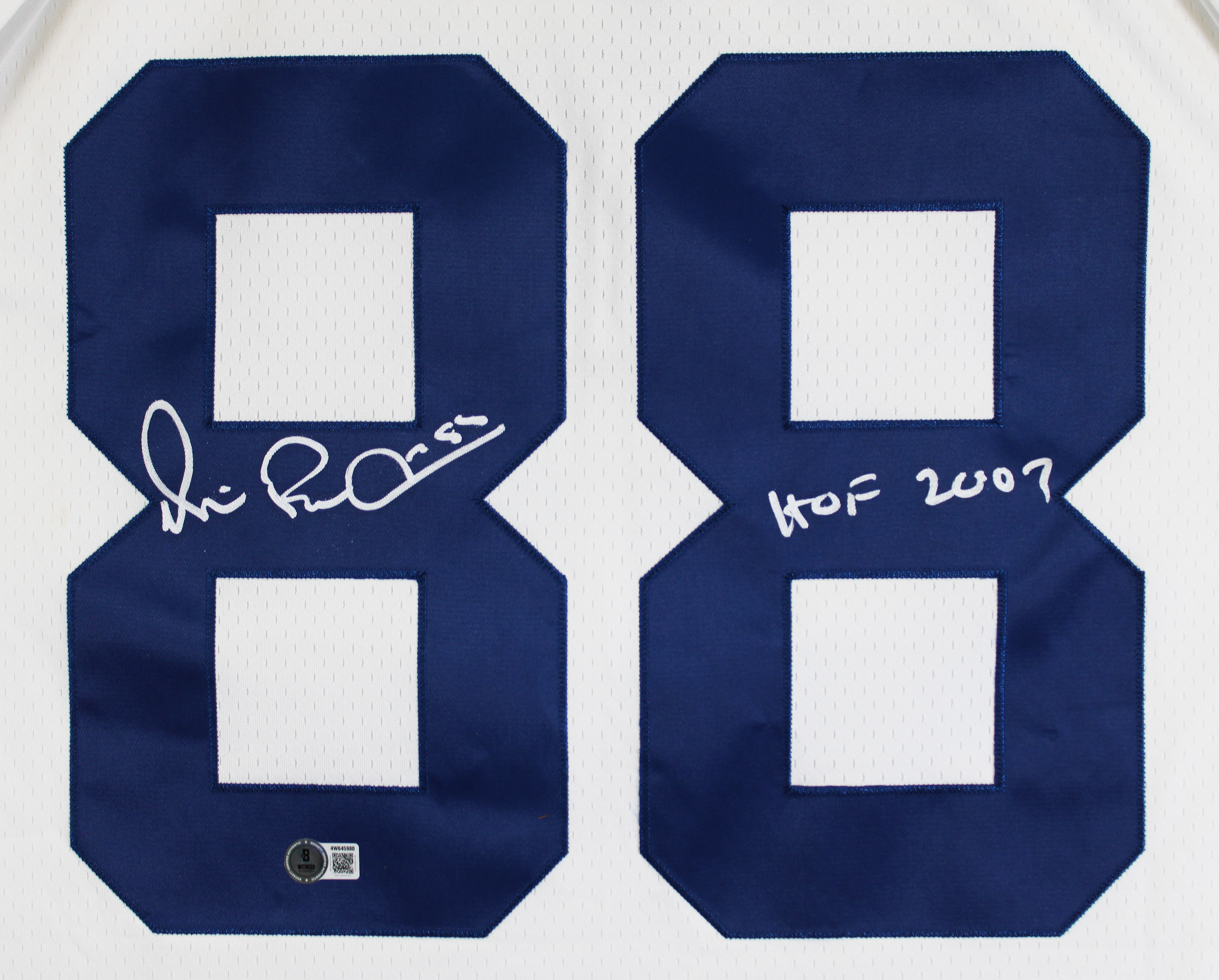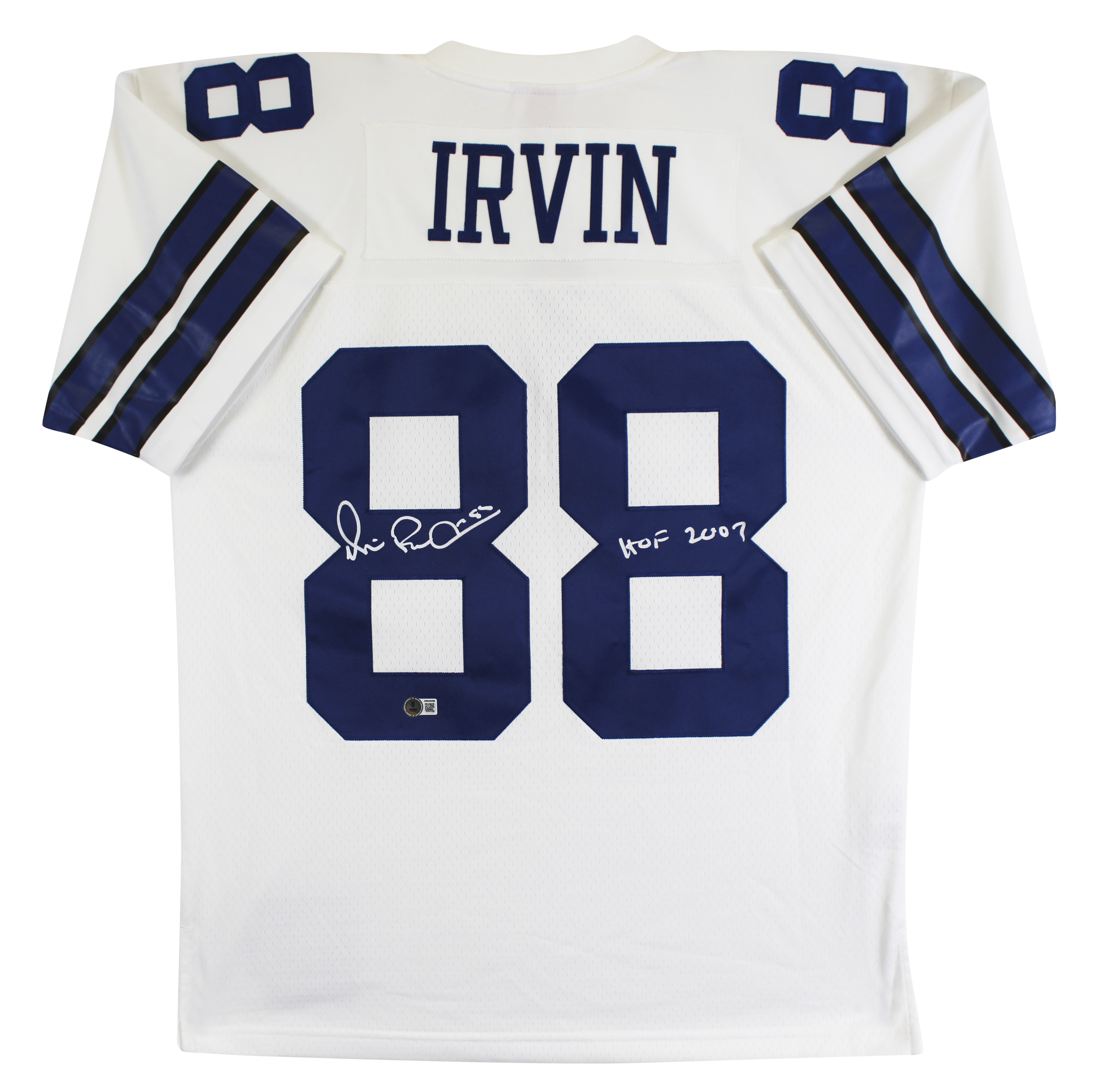 This Autographed White Mitchell & Ness Jersey with the inscription of "HOF 2007" has been Personally Signed by Michael Irvin of the Dallas Cowboys. This item is 100% Authentic to include a hologram by Beckett Authentication Services. This item will come with an affixed Beckett Authentication Services (BAS) authentication sticker, which includes a scannable QR code to verify authenticity. Please note that Beckett no longer provides serial-numbered COA cards, and the attached BAS sticker will serve as the complete authentication for this item. This is a BAS Witnessed Protection Program item which means a Beckett Authentication Service representative was present when this item was being signed. We conducted an autograph signing with Michael Irvin where multiples of the same item were signed. While the photographs are representative of this item, the size, placement and strength of the signature may vary. Each item is hand signed, therefore, each autograph is unique. This item can be verified through BAS Witnessed. This is a X-Large sized Jersey.