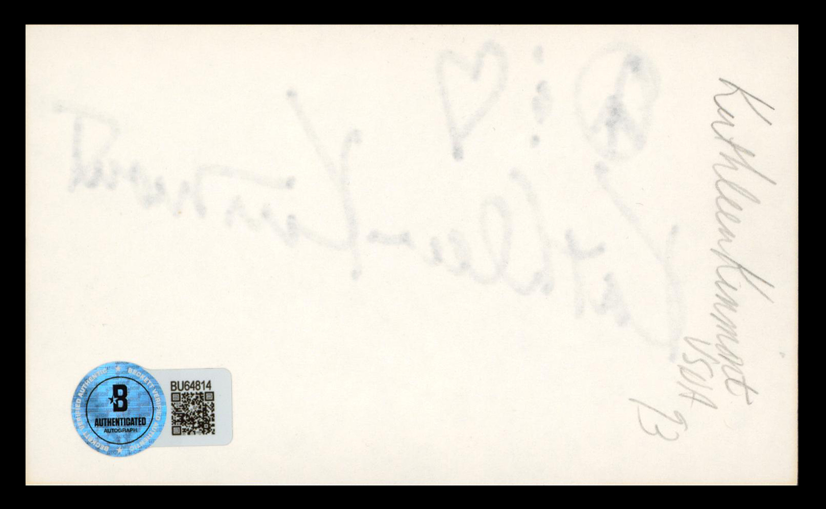 This Autographed 3x5 Index Card with the inscription of "Peace & Love" has been Personally Signed by Kathleen Kinmont of Halloween 4: The Return of Michael Myers. This item is 100% Authentic to include a hologram by Beckett Authentication Services. This item will come with an affixed Beckett Authentication Services (BAS) authentication sticker, which includes a scannable QR code to verify authenticity. Please note that Beckett no longer provides serial-numbered COA cards, and the attached BAS sticker will serve as the complete authentication for this item. The authenticity can be verified on Beckett Authentication Services website.