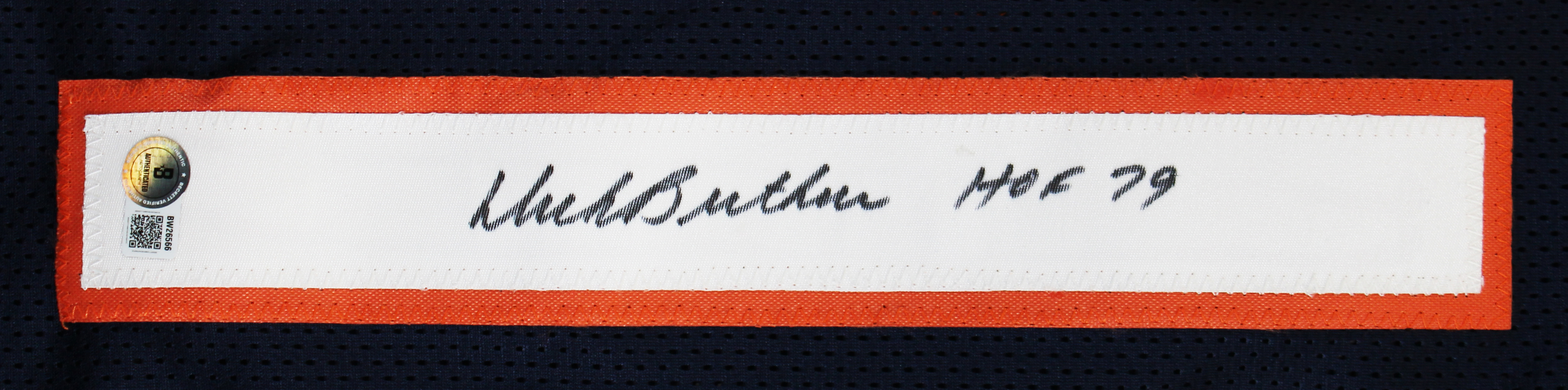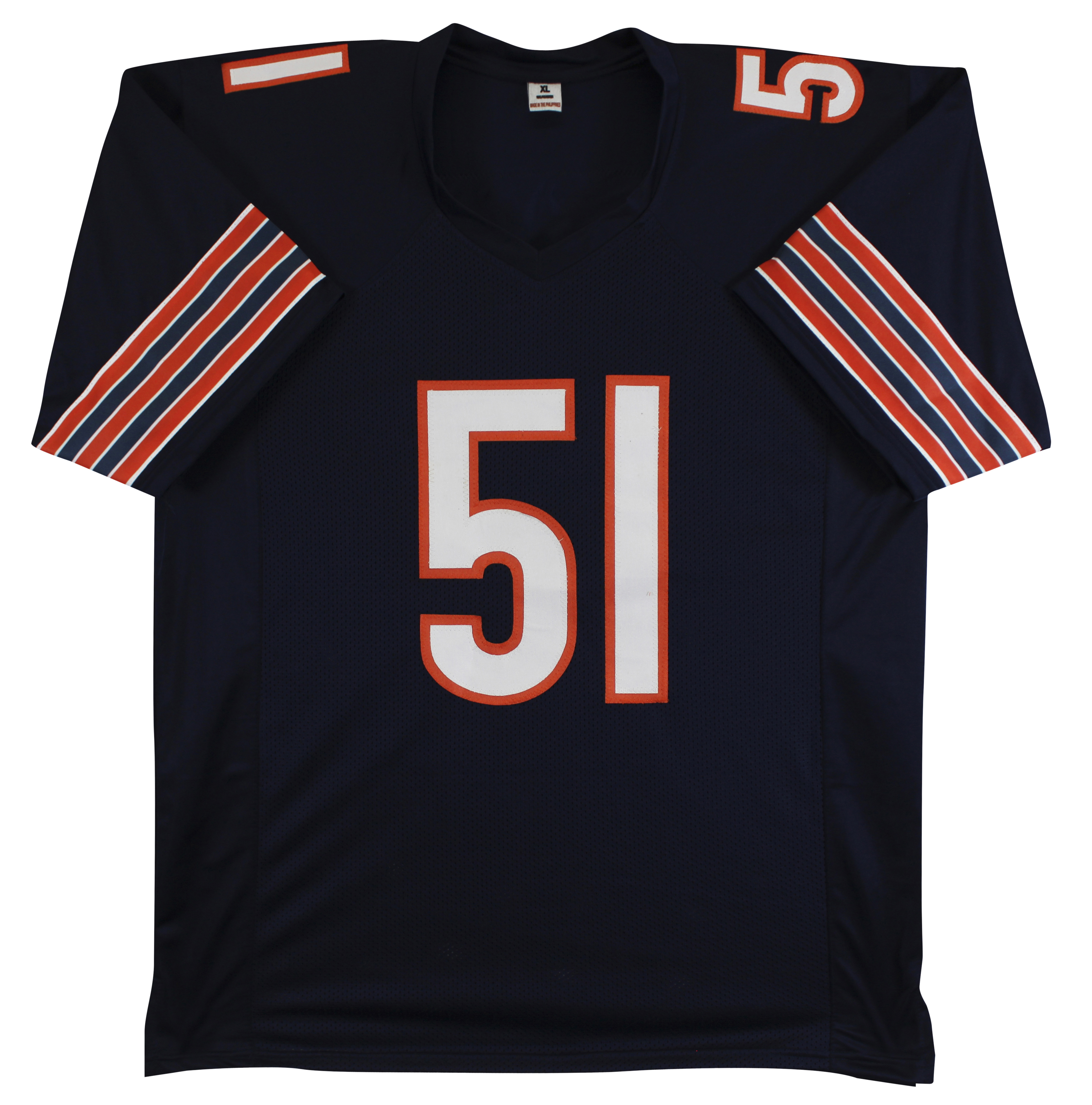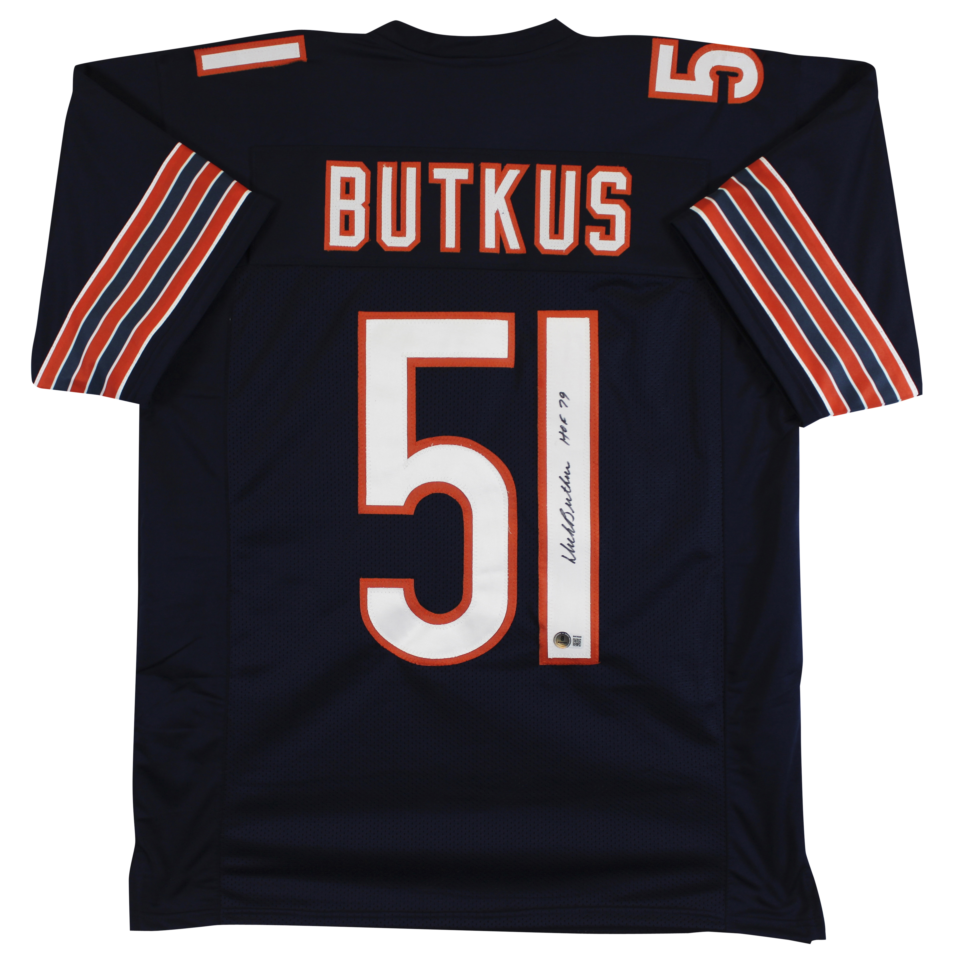 This Autographed Navy Blue Pro Style Jersey with the inscription of "HOF 79" has been Personally Signed by Dick Butkus of the Chicago Bears. This item is 100% Authentic to include a hologram by Beckett Authentication Services. This item will come with an affixed Beckett Authentication Services (BAS) authentication sticker, which includes a scannable QR code to verify authenticity. Please note that Beckett no longer provides serial-numbered COA cards, and the attached BAS sticker will serve as the complete authentication for this item. We have multiples of this same item. While the photographs are representative of this item, the size, placement and strength of the signature may vary. Each item is hand signed, therefore, each autograph is unique. This is a X-Large sized, non-branded, custom-stitched Jersey.