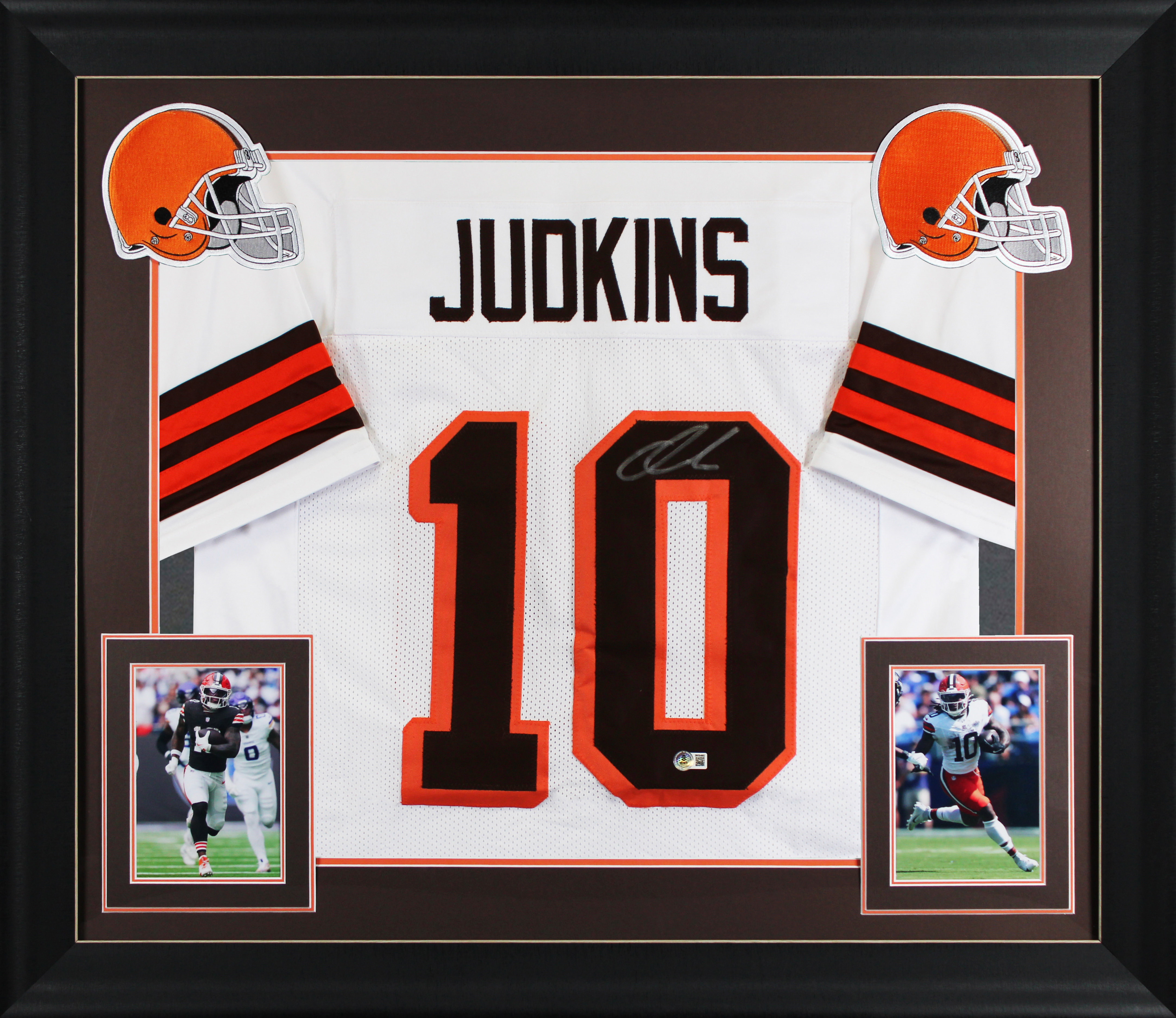 This Autographed White Pro Style Framed Jersey has been Personally Signed by Quinshon Judkins of the Cleveland Browns. This item is 100% Authentic to include a hologram by Beckett Authentication Services. This item will come with an affixed Beckett Authentication Services (BAS) authentication sticker, which includes a scannable QR code to verify authenticity. Please note that Beckett no longer provides serial-numbered COA cards, and the attached BAS sticker will serve as the complete authentication for this item. This is a BAS Witnessed Protection Program item which means a Beckett Authentication Service representative was present when this item was being signed. We conducted an autograph signing with Quinshon Judkins where multiples of the same item were signed. While the photographs are representative of this item, the size, placement and strength of the signature may vary. Each item is hand signed, therefore, each autograph is unique. This item can be verified through BAS Witnessed. This item has been professionally framed to overall dimensions of approximately 32 x 37 inches. This is a X-Large sized, non-branded, custom-stitched Framed Jersey. This jersey will be framed to order, it will take approximately 4-5 business days from purchase date for it to ship.