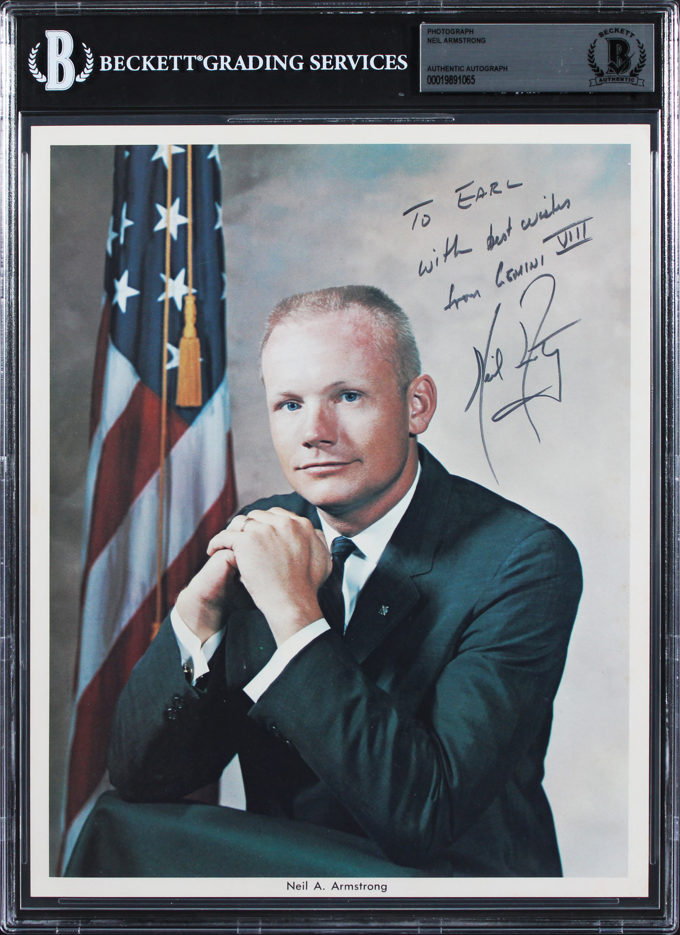 This Autographed 8x10 Photo with the inscription of "To Earl with best wishes from Gemini VIII" has been Personally Signed by Neil Armstrong of NASA Astronaut. This item is 100% Authentic, it comes slabbed and authenticated by Beckett Authentication Services. The authenticity can be verified on Beckett Authentication Services website.