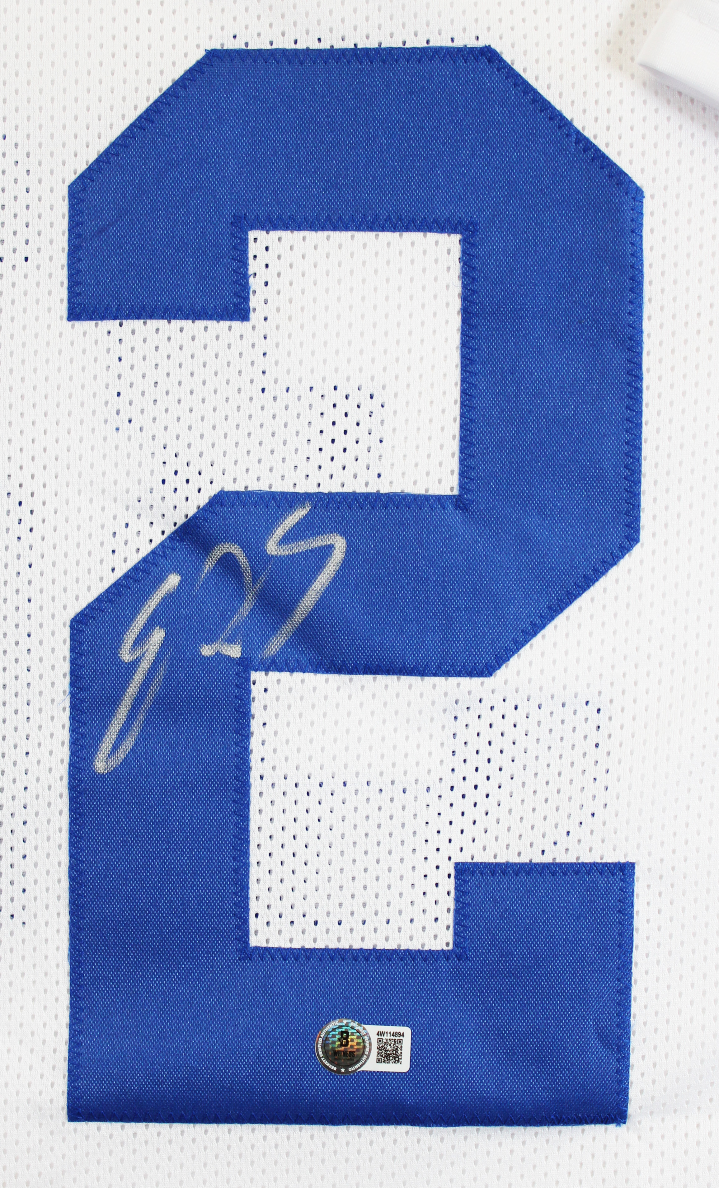 This Autographed White Pro Style Framed Jersey has been Personally Signed by Edgerrin James of the Indianapolis Colts. This item is 100% Authentic to include a hologram by Beckett Authentication Services. This item will come with an affixed Beckett Authentication Services (BAS) authentication sticker, which includes a scannable QR code to verify authenticity. Please note that Beckett no longer provides serial-numbered COA cards, and the attached BAS sticker will serve as the complete authentication for this item. This is a BAS Witnessed Protection Program item which means a Beckett Authentication Service representative was present when this item was being signed. We conducted an autograph signing with Edgerrin James where multiples of the same item were signed. While the photographs are representative of this item, the size, placement and strength of the signature may vary. Each item is hand signed, therefore, each autograph is unique. This item can be verified through BAS Witnessed. This item has been professionally framed to overall dimensions of approximately 32 x 37 inches. This is a X-Large sized, non-branded, custom-stitched Framed Jersey. This jersey will be framed to order, it will take approximately 4-5 business days from purchase date for it to ship.