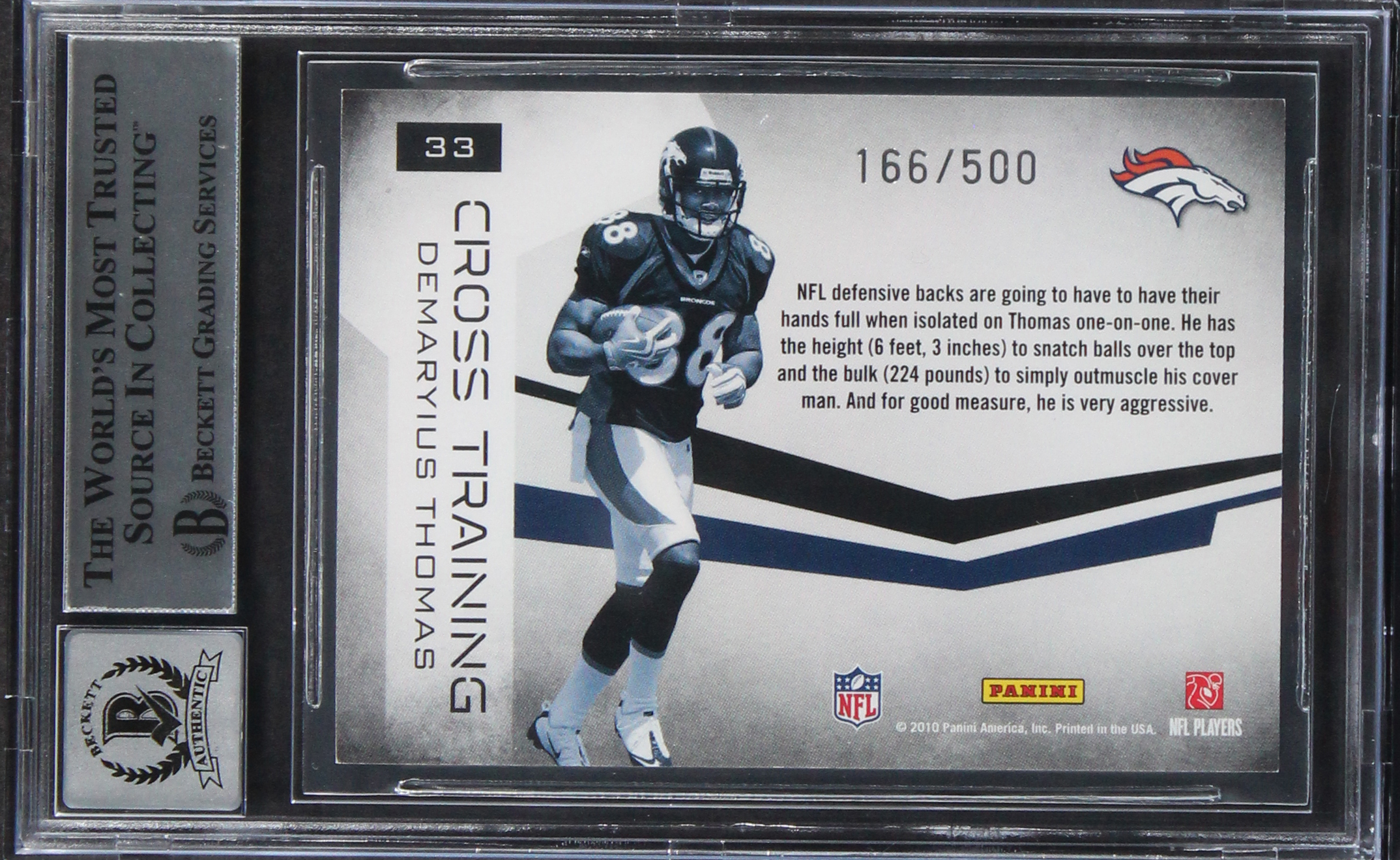This Autographed Auto Graded Gem Mint 10! 2010 Rookies & Stars Crosstraining Gold #33 #166/500 Card has been Personally Signed by Demaryius Thomas of the Denver Broncos. This item is 100% Authentic, it comes slabbed and authenticated by Beckett Authentication Services. The authenticity can be verified on Beckett Authentication Services website.