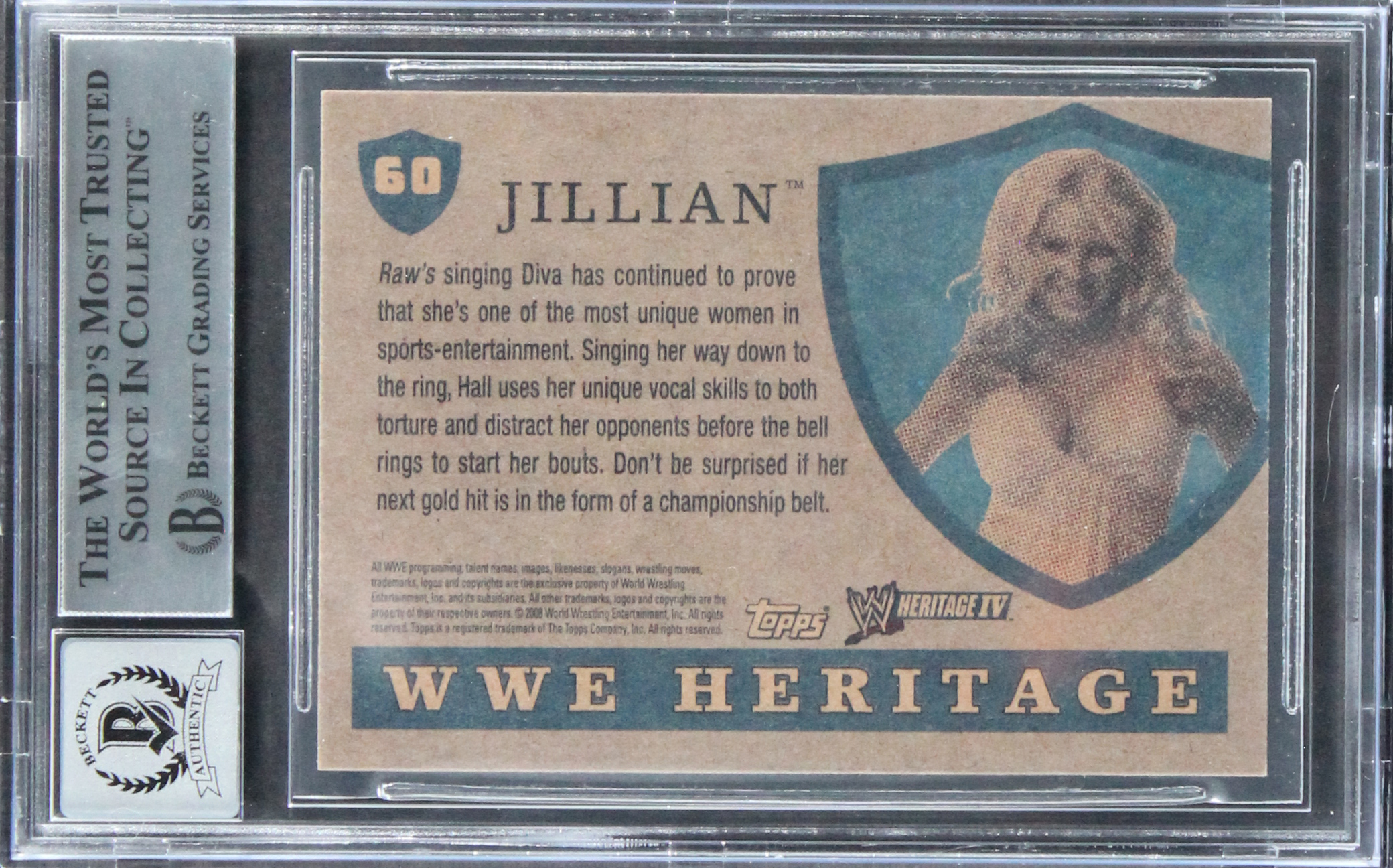 This Autographed Auto Graded Gem Mint 10! 2008 Topps Heritage IV WWE #60 Card has been Personally Signed by Jillian Hall. This item is 100% Authentic, it comes slabbed and authenticated by Beckett Authentication Services. The authenticity can be verified on Beckett Authentication Services website.