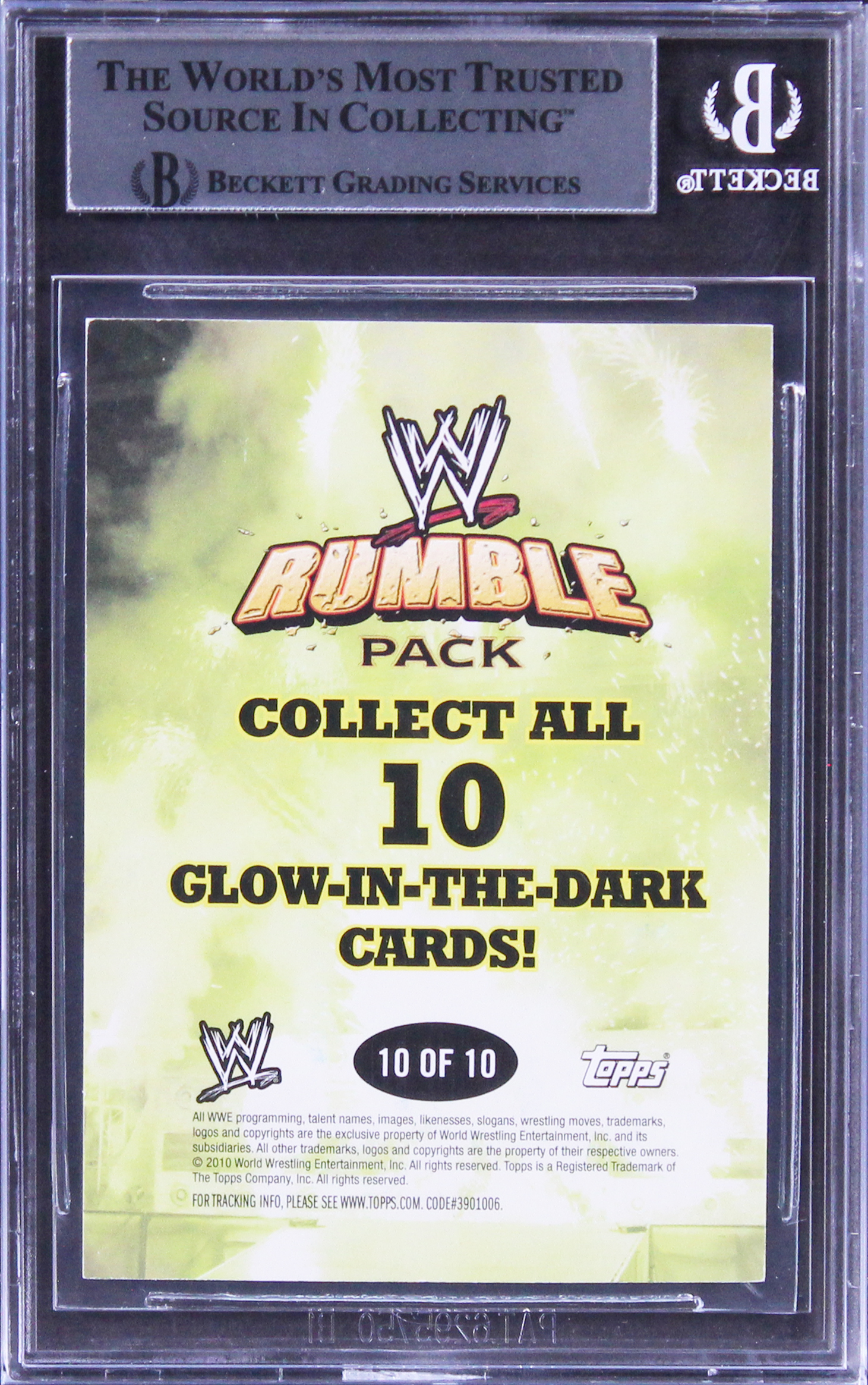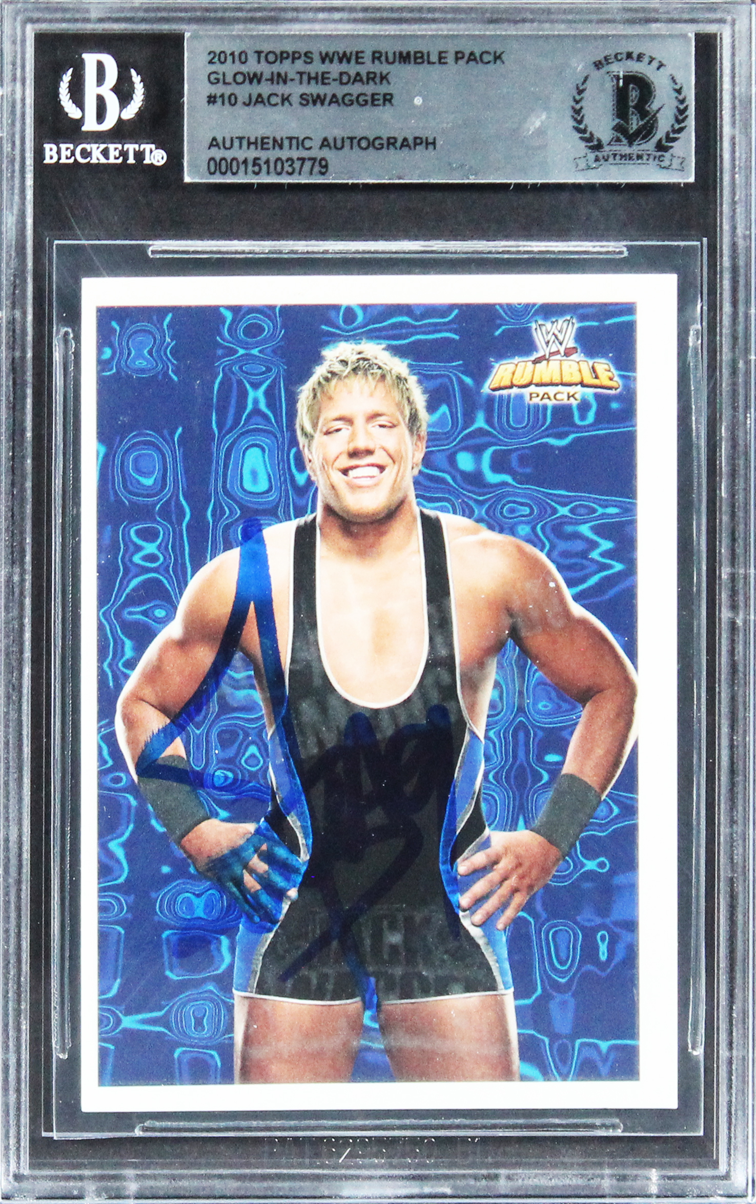 This Autographed 2010 Topps WWE Rumble Pack Glow-In-The-Dark #10 Card has been Personally Signed by Jack Swagger. This item is 100% Authentic, it comes slabbed and authenticated by Beckett Authentication Services. The authenticity can be verified on Beckett Authentication Services website.