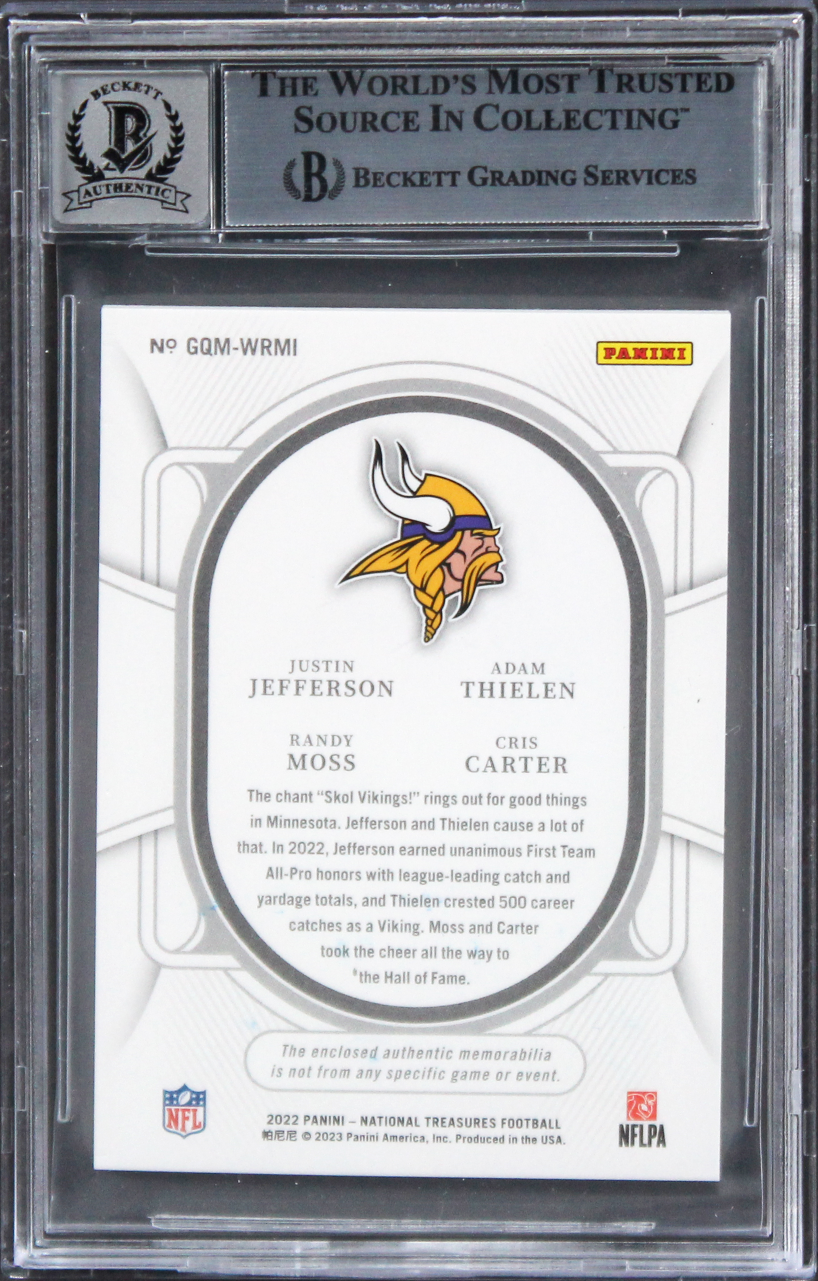 This Autographed Auto Graded Gem Mint 10! 2022 National Treasures NFL Gear Quad Materials #3 #13/99 Card has been Personally Signed by Randy Moss, Cris Carter, Justin Jefferson & Adam Thielen of the Minnesota Vikings. This item is 100% Authentic, it comes slabbed and authenticated by Beckett Authentication Services. The authenticity can be verified on Beckett Authentication Services website.