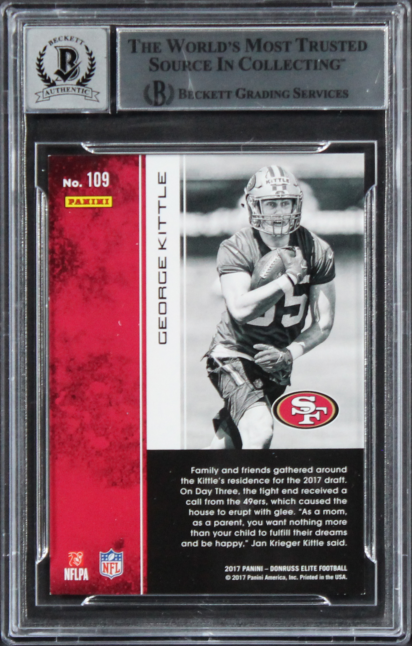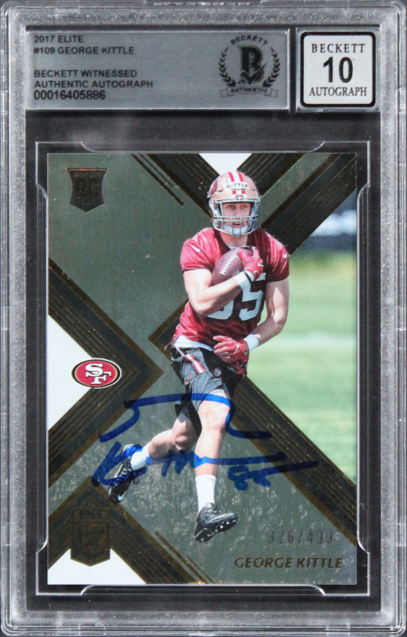 This Autographed Auto Graded Gem Mint 10! 2017 Elite #109 #326/499 Rookie Card has been Personally Signed by George Kittle of the San Francisco 49ers. This item is 100% Authentic, it comes slabbed and authenticated by Beckett Authentication Services. The authenticity can be verified on Beckett Authentication Services website.