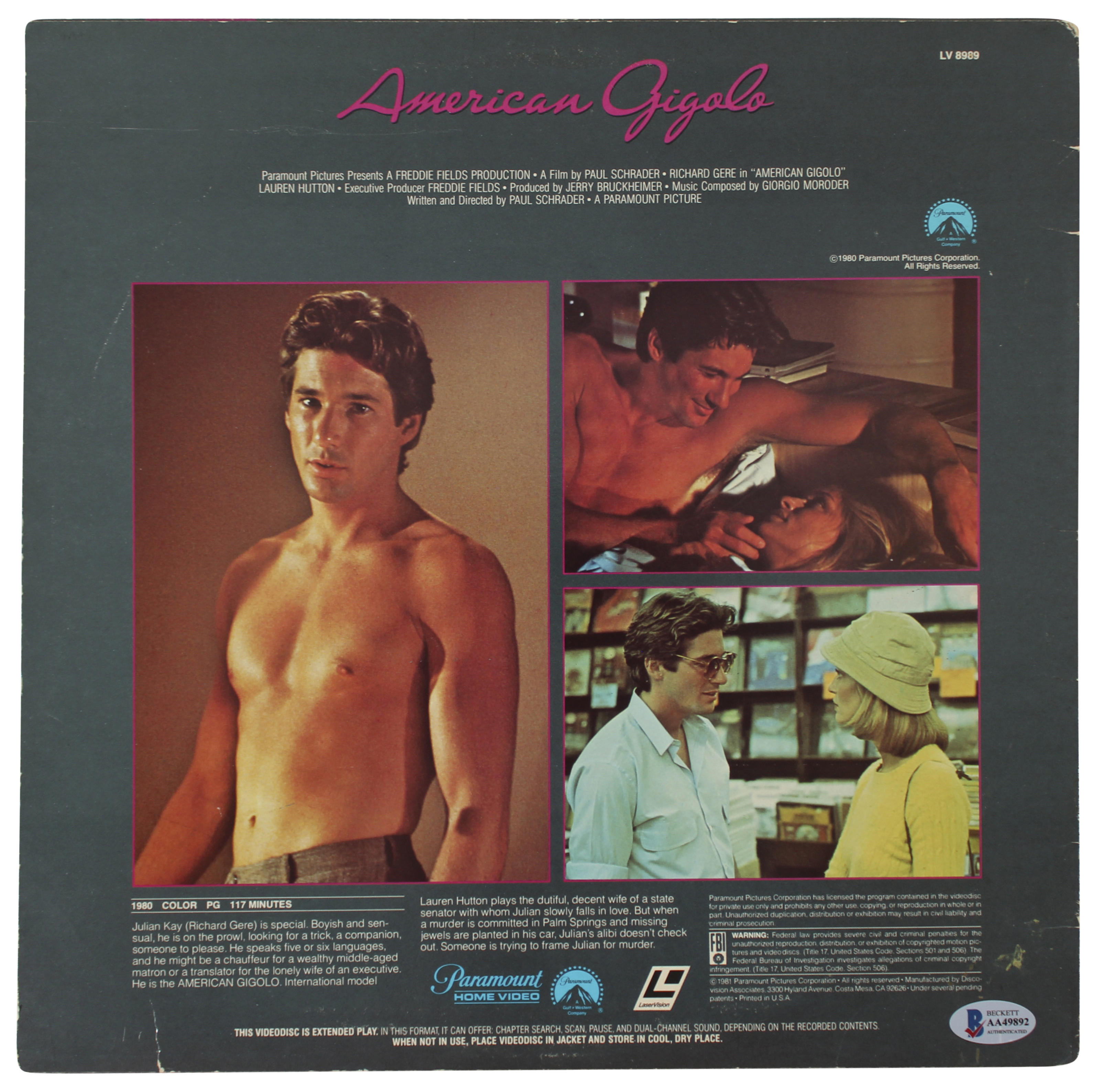 This Autographed American Gigolo Laserdisc Cover w/o Disk has been Personally Signed by Richard Gere of American Gigolo. This item is 100% Authentic to include a Certificate of Authenticity (COA) / hologram by Beckett Authentication Services. The authenticity can be verified on Beckett Authentication Services website.