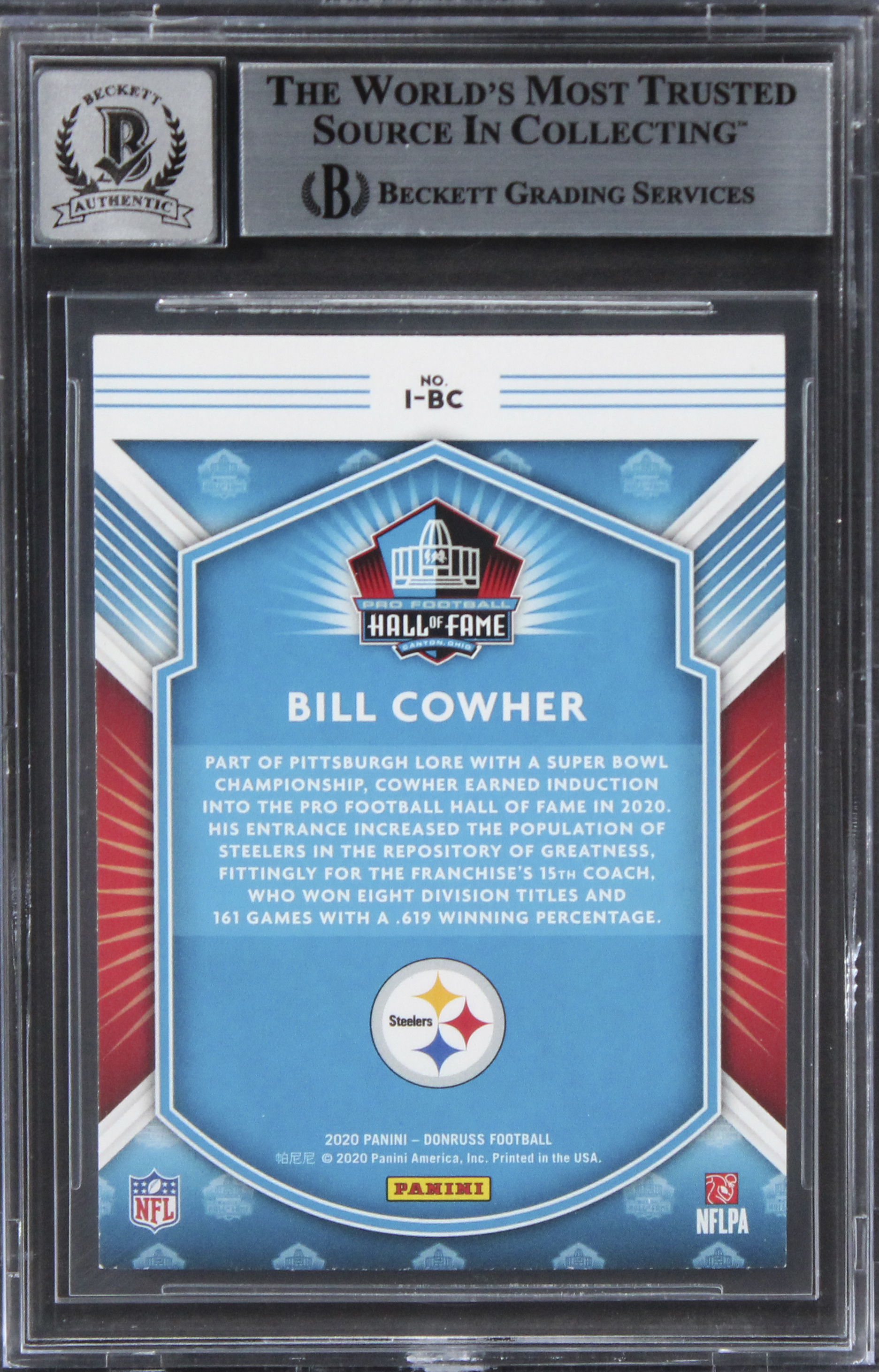 This Autographed Auto Graded Gem Mint 10! 2020 Donruss Inducted #1 Card has been Personally Signed by Bill Cowher of the Pittsburgh Steelers. This item is 100% Authentic, it comes slabbed and authenticated by Beckett Authentication Services. The authenticity can be verified on Beckett Authentication Services website.