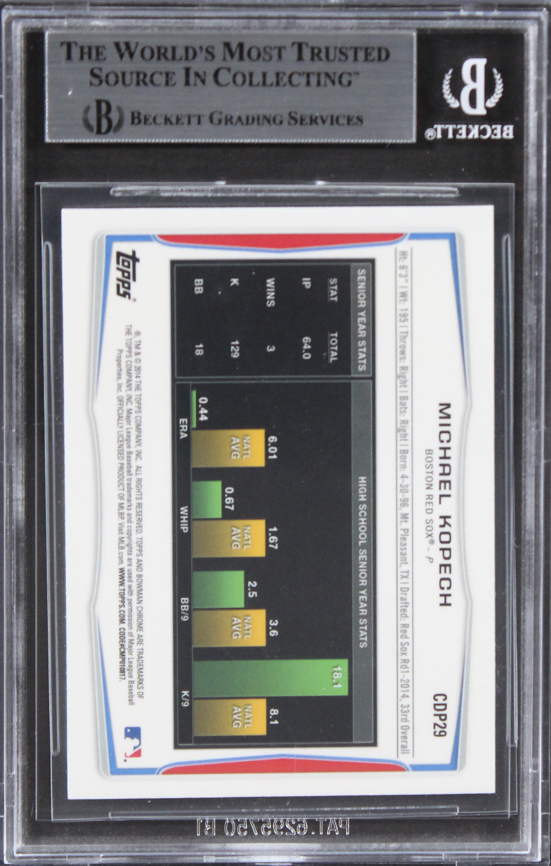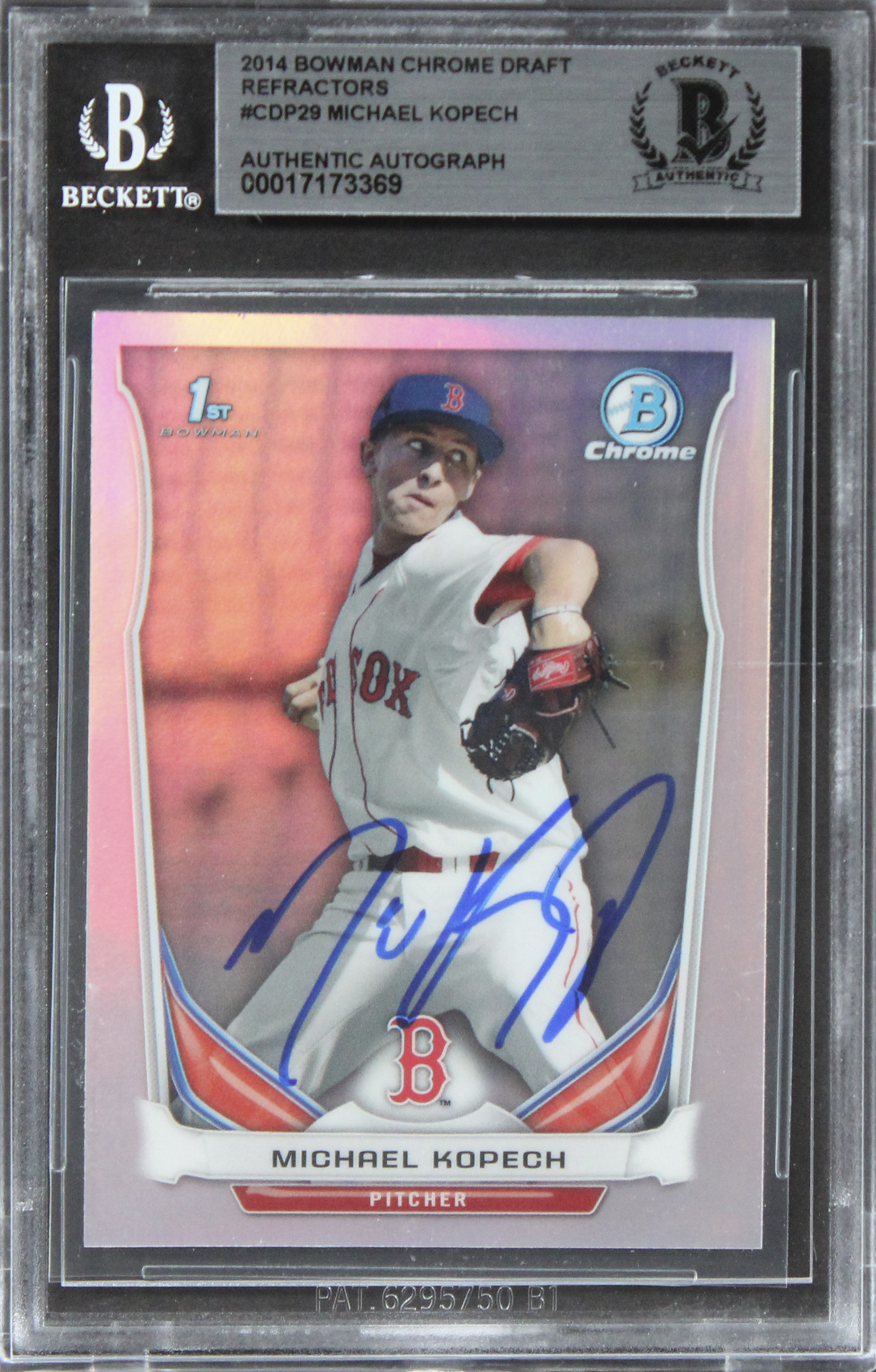 This Autographed 2014 Bowman Chrome Draft Refractors #CDP29 Card has been Personally Signed by Michael Kopech of the Boston Red Sox. This item is 100% Authentic, it comes slabbed and authenticated by Beckett Authentication Services. The authenticity can be verified on Beckett Authentication Services website.