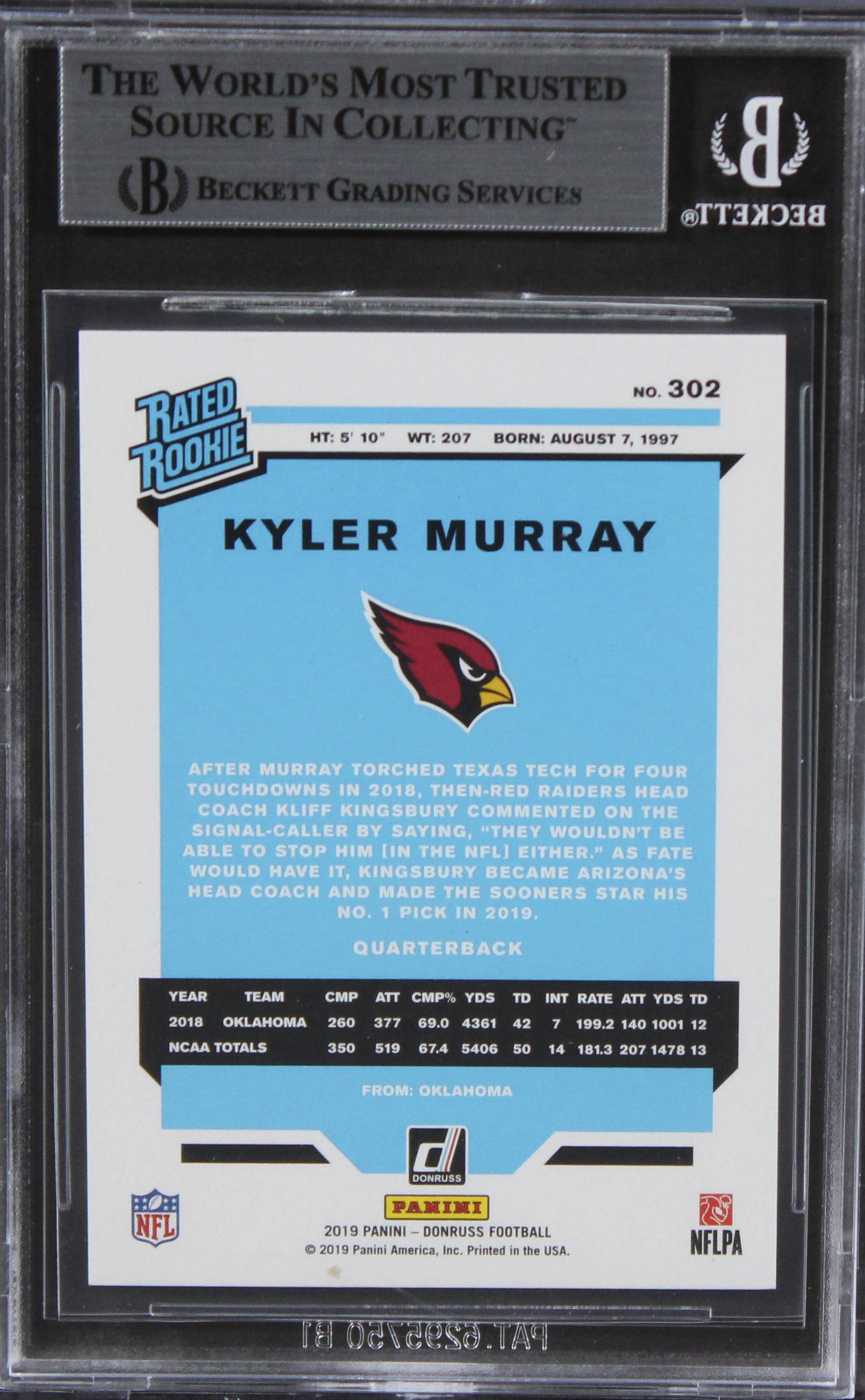 This Autographed 2019 Donruss #302 Card has been Personally Signed by Kyler Murray of the Arizona Cardinals. This item is 100% Authentic, it comes slabbed and authenticated by Beckett Authentication Services. The authenticity can be verified on Beckett Authentication Services website.