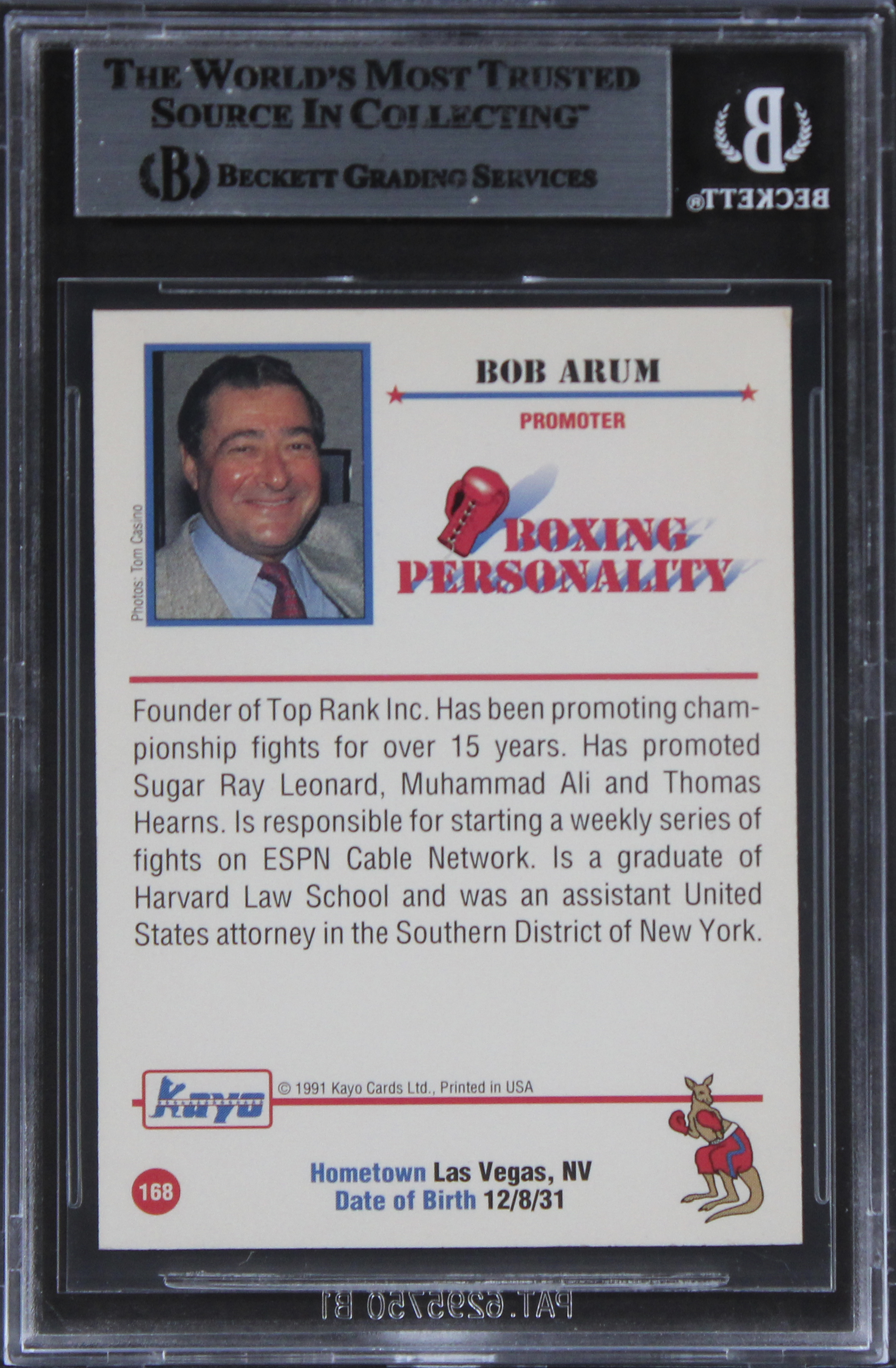 This Autographed 1991 KAYO #168 Card has been Personally Signed by Bob Arum. This item is 100% Authentic, it comes slabbed and authenticated by Beckett Authentication Services. The authenticity can be verified on Beckett Authentication Services website.