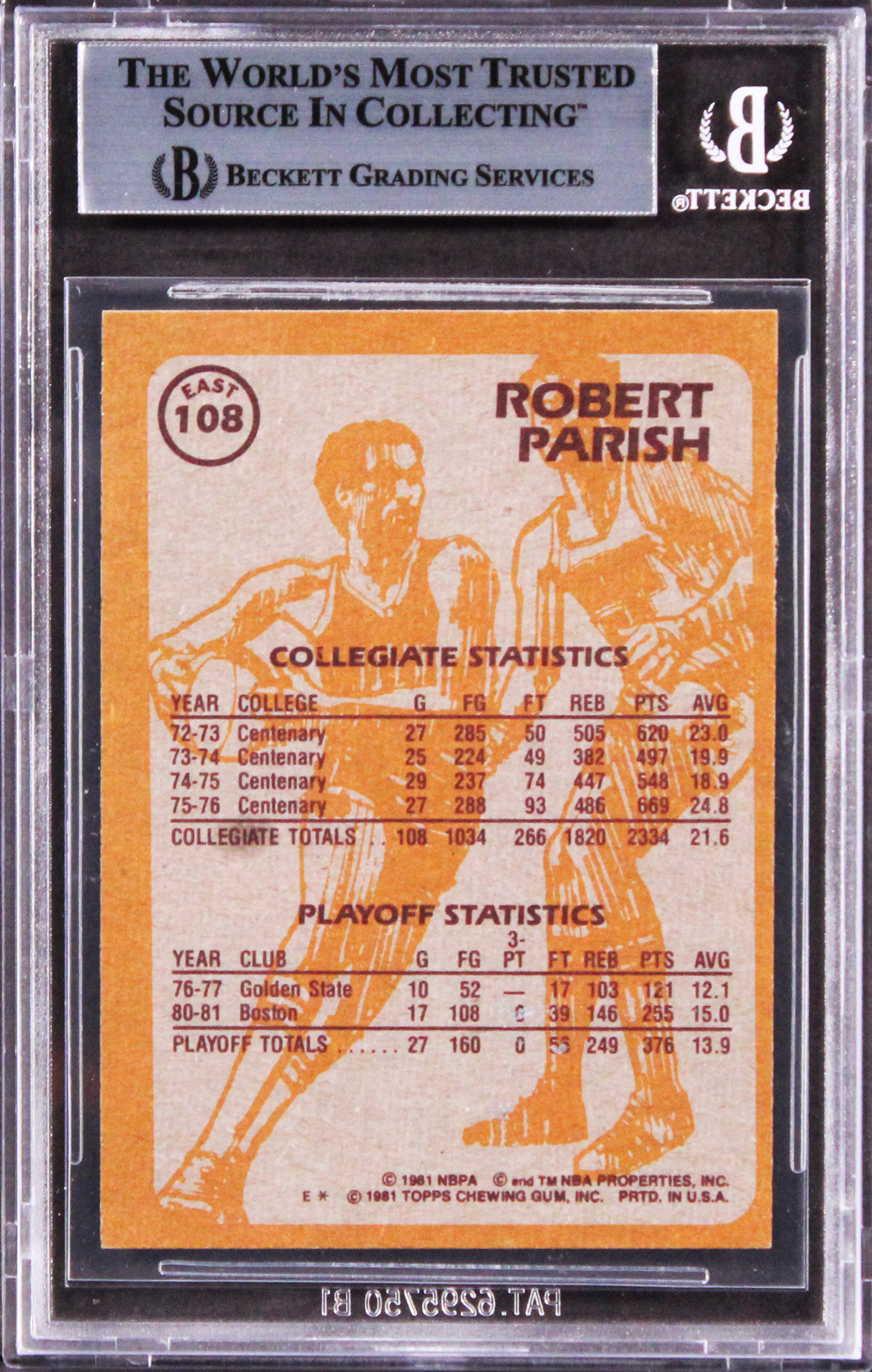 This Autographed 1981 Topps #E108 Card has been Personally Signed by Robert Parish of the Boston Celtics. This item is 100% Authentic, it comes slabbed and authenticated by Beckett Authentication Services. The authenticity can be verified on Beckett Authentication Services website.