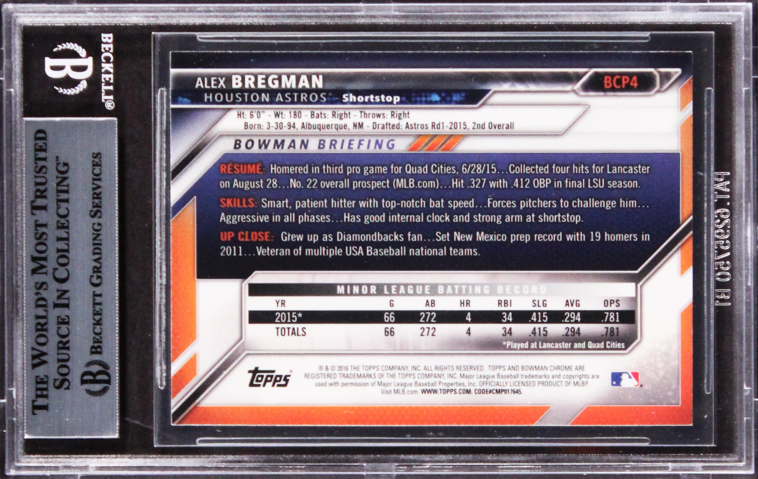 This Autographed 2016 Bowman Chrome Prospects #BCP4 Rookie Card has been Personally Signed by Alex Bregman of the Houston Astros. This item is 100% Authentic, it comes slabbed and authenticated by Beckett Authentication Services. The authenticity can be verified on Beckett Authentication Services website.
