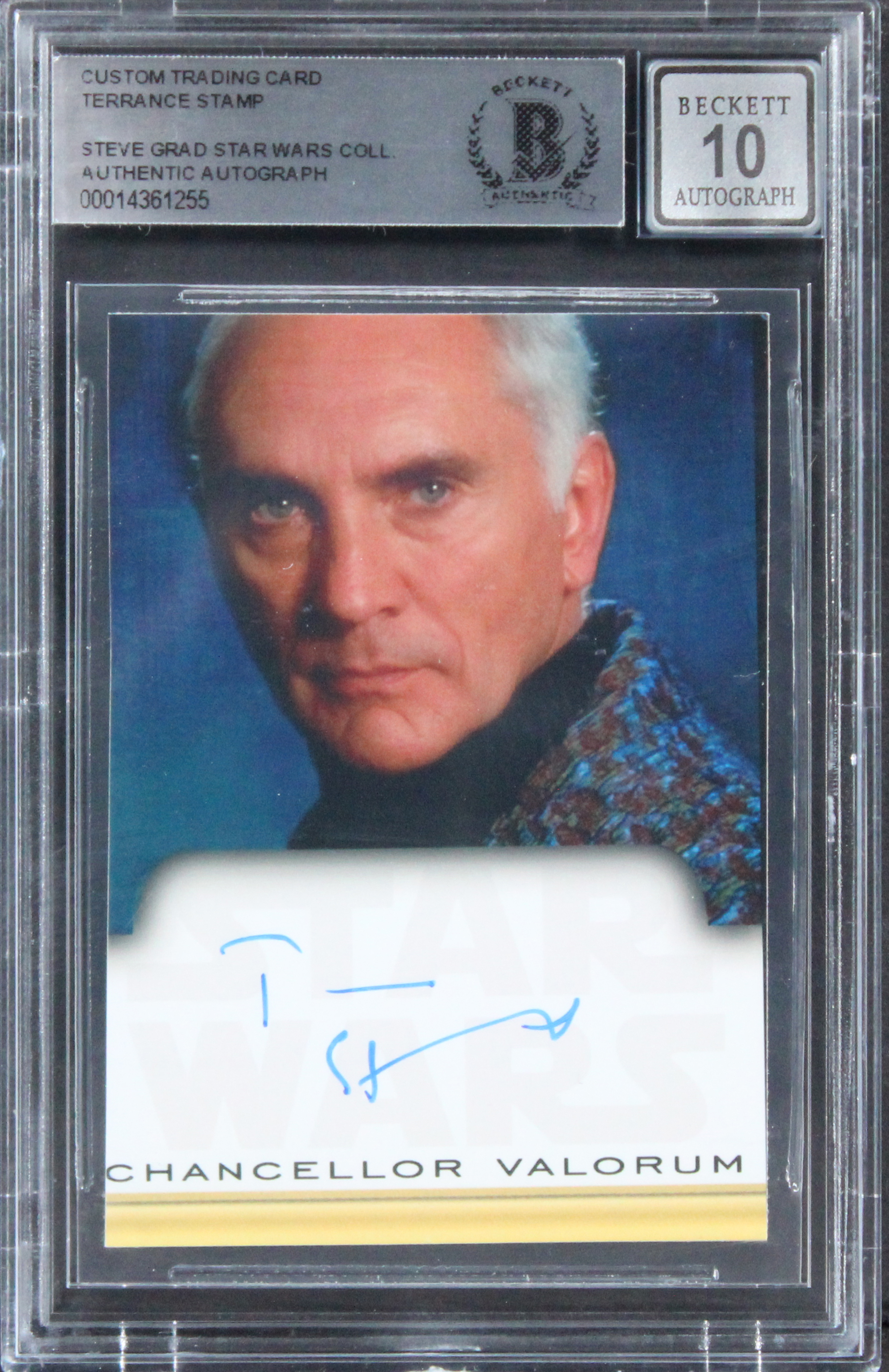 This Autographed Custom Trading Auto Graded Gem Mint 10! Card has been Personally Signed by Terrance Stamp of Star Wars. This item is 100% Authentic, it comes slabbed and authenticated by Beckett Authentication Services. The authenticity can be verified on Beckett Authentication Services website.