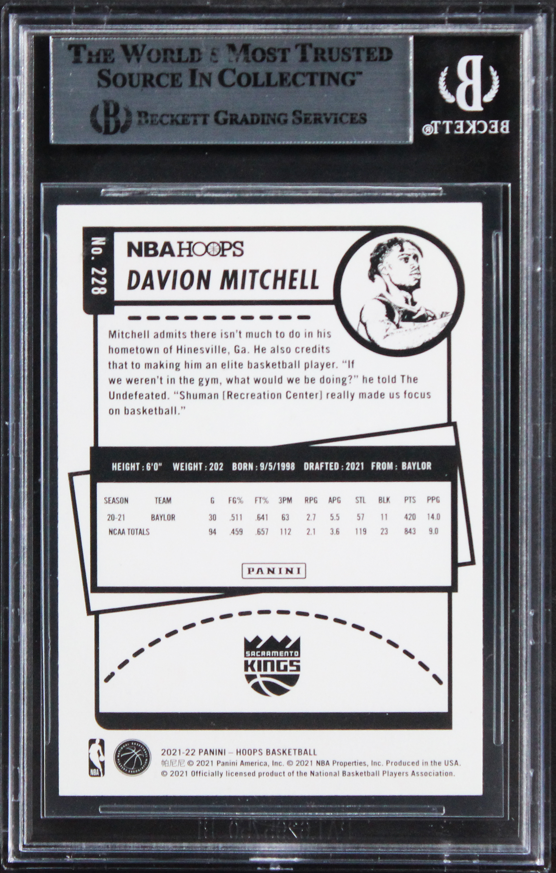 This Autographed 2021 Hoops #228 Rookie Card has been Personally Signed by Davion Mitchell of the Sacramento Kings. This item is 100% Authentic, it comes slabbed and authenticated by Beckett Authentication Services. The authenticity can be verified on Beckett Authentication Services website.