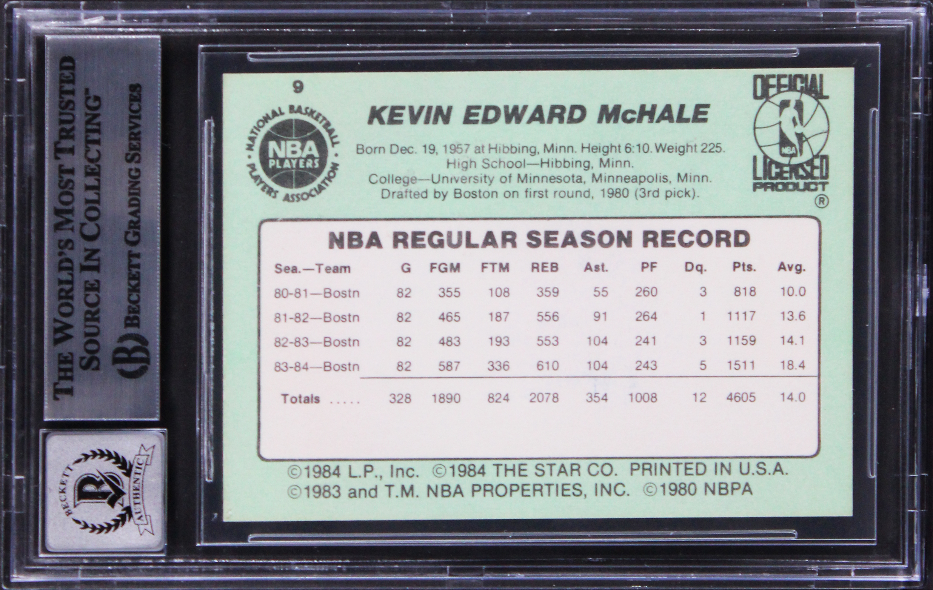 This Autographed Auto Graded Gem Mint 10! 1984 Star #9 Card has been Personally Signed by Kevin McHale of the Boston Celtics. This item is 100% Authentic, it comes slabbed and authenticated by Beckett Authentication Services. We have multiples of this same item. While the photographs are representative of this item, the size and placement of the signature may vary. Each item is hand signed, therefore, each autograph is unique.