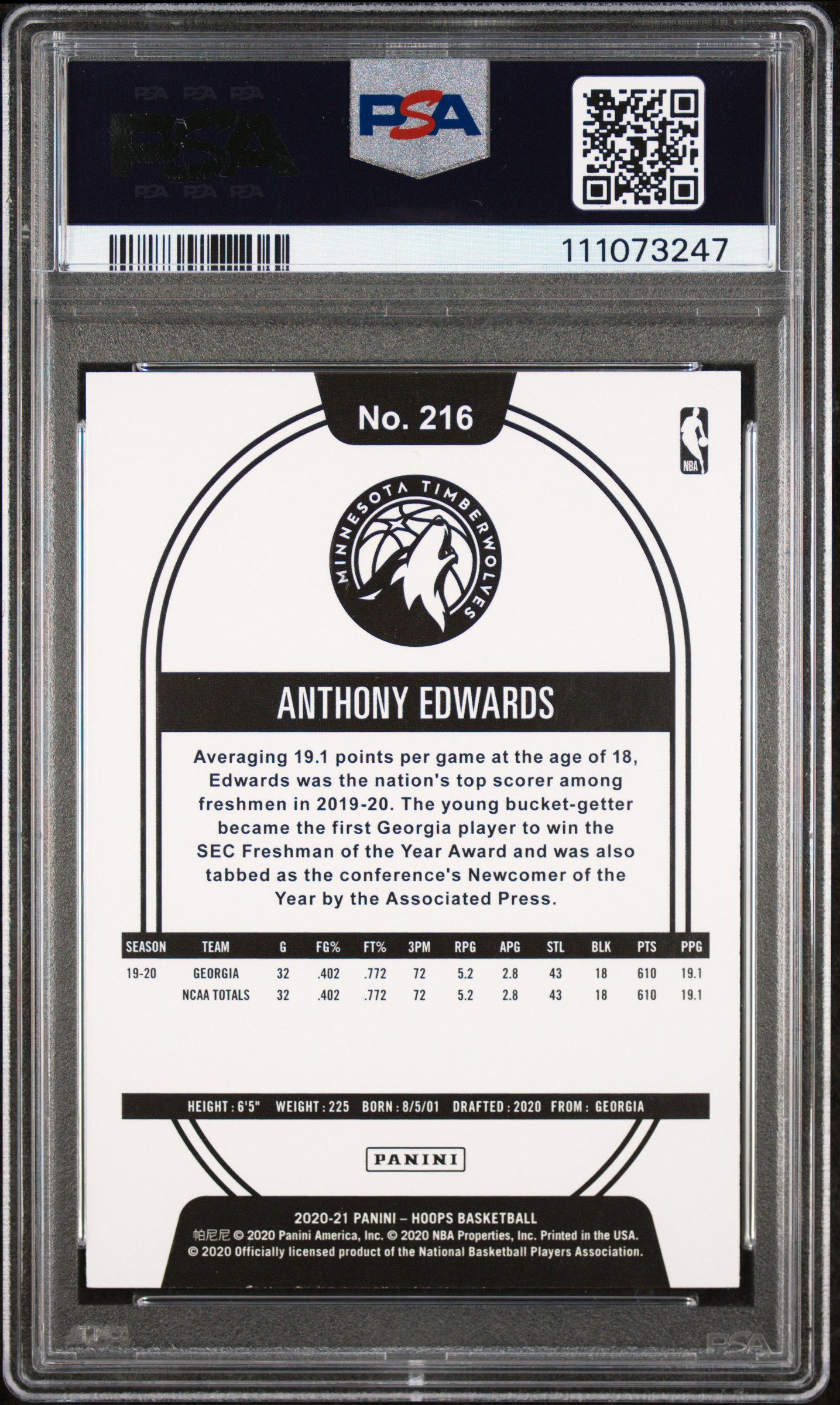 This Autographed Auto Graded Gem Mint 10! 2020 Panini Hoops #216 Rookie Card has been Personally Signed by Anthony Edwards of the Minnesota Timberwolves. This item is 100% Authentic, it comes slabbed and authenticated by PSA/DNA. The authenticity can be verified on Professional Sports Authenticator website.