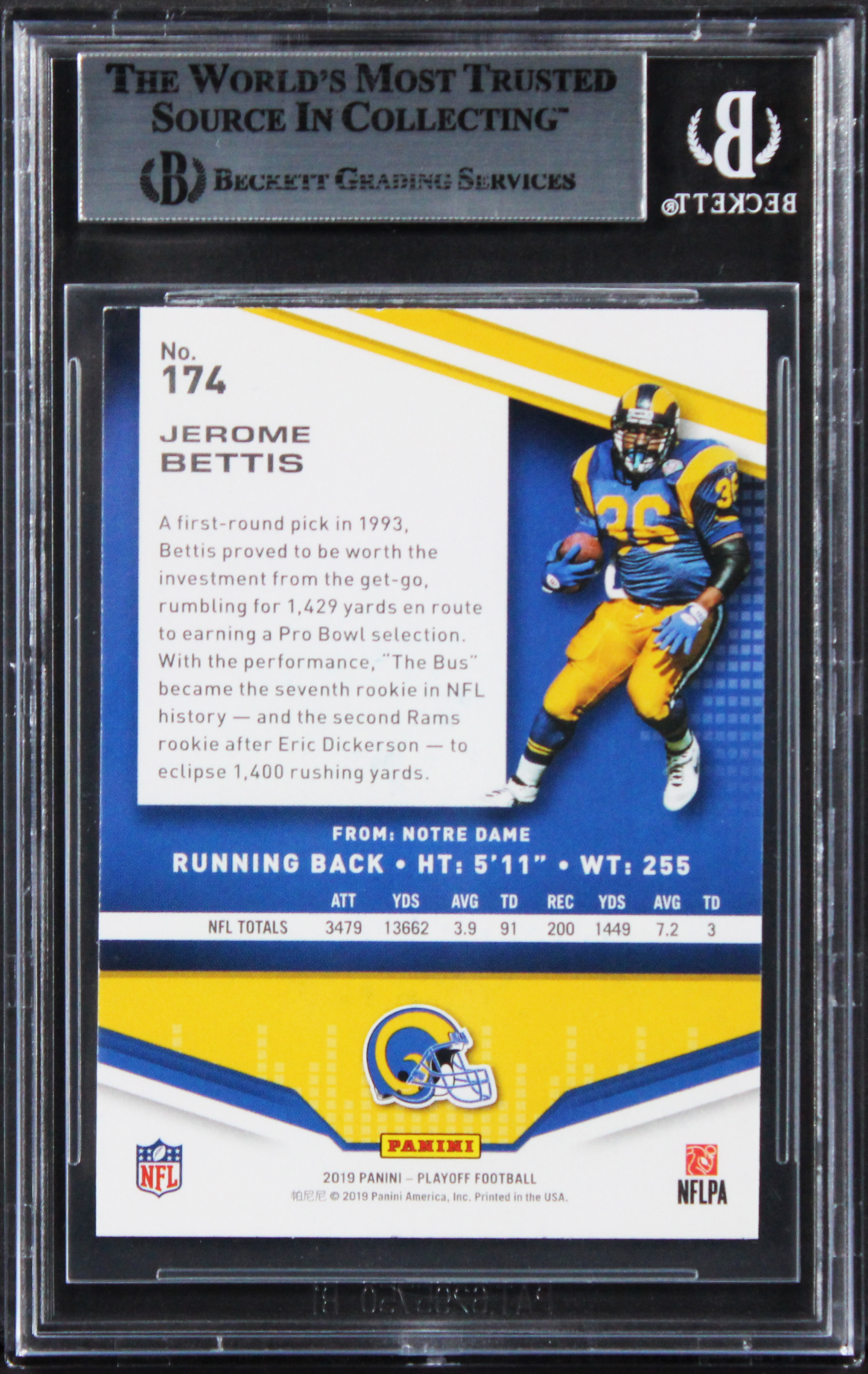 This Autographed 2019 Playoff #174 Card has been Personally Signed by Jerome Bettis of the St. Louis Rams. This item is 100% Authentic, it comes slabbed and authenticated by Beckett Authentication Services. The authenticity can be verified on Beckett Authentication Services website.