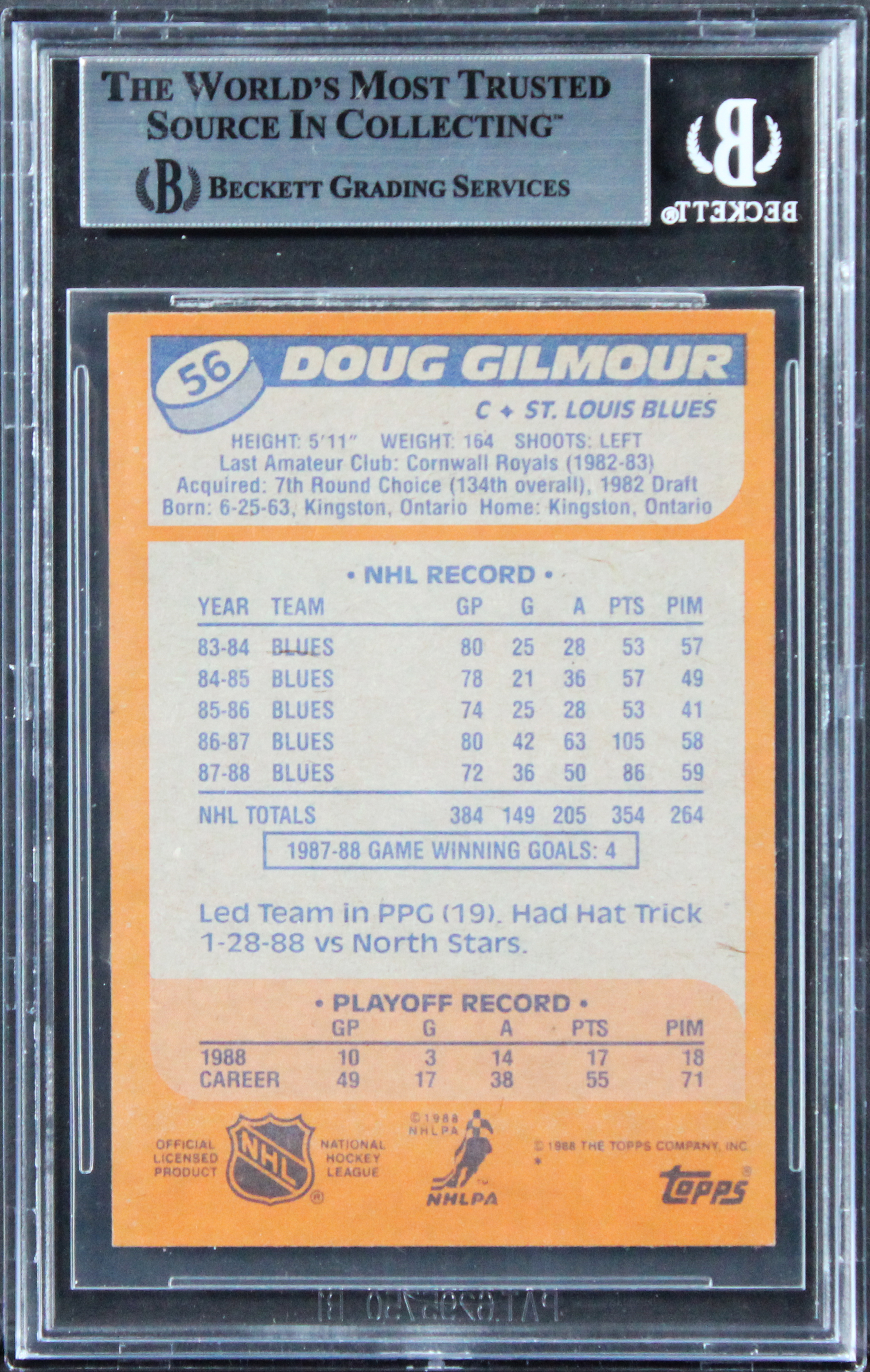 This Autographed 1988 Topps #56 Card has been Personally Signed by Doug Gilmour of the St. Louis Blues. This item is 100% Authentic, it comes slabbed and authenticated by Beckett Authentication Services. The authenticity can be verified on Beckett Authentication Services website.