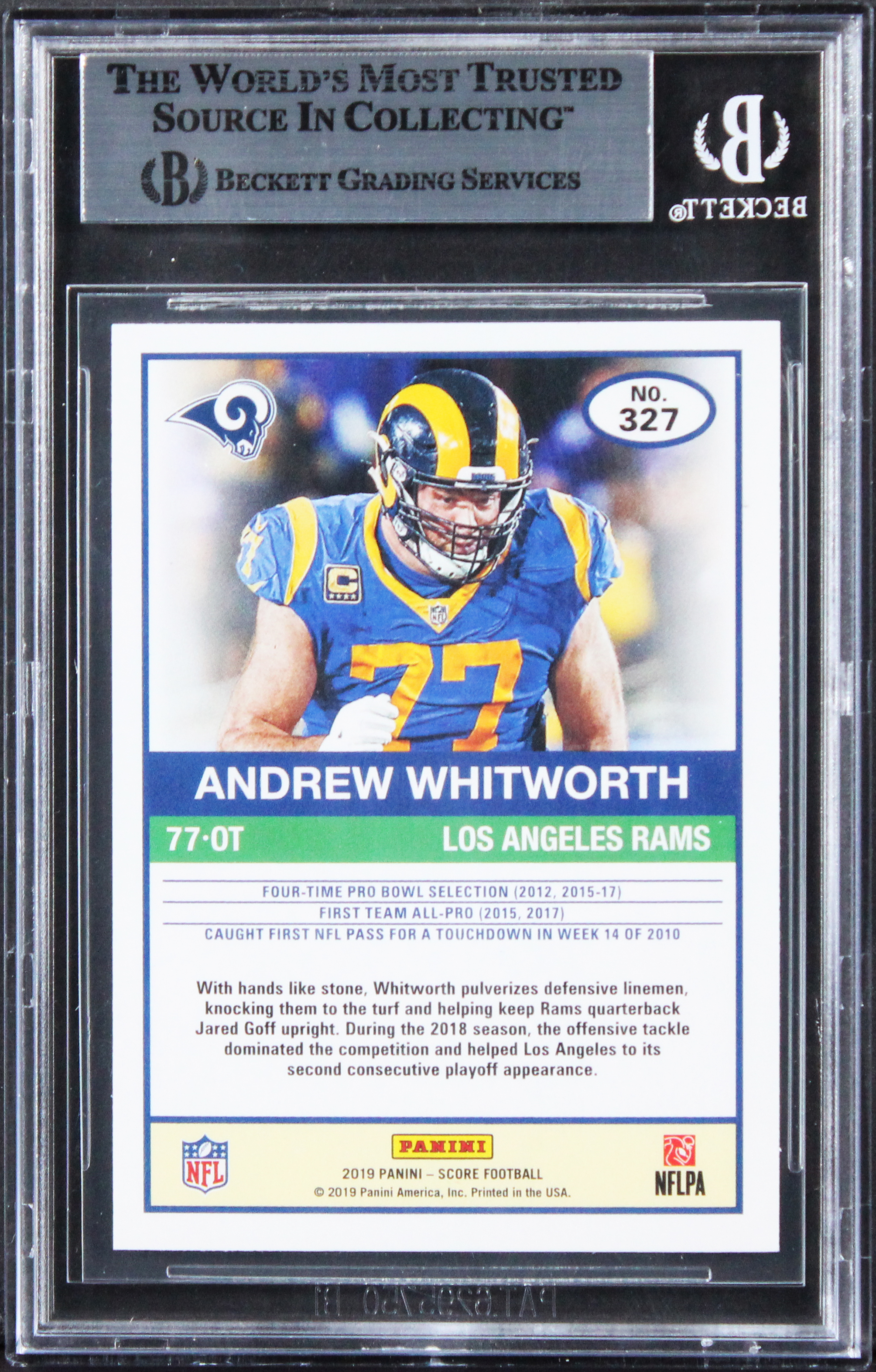This Autographed 2019 Score #327 Card has been Personally Signed by Andrew Whitworth of the Los Angeles Rams. This item is 100% Authentic, it comes slabbed and authenticated by Beckett Authentication Services. The authenticity can be verified on Beckett Authentication Services website.
