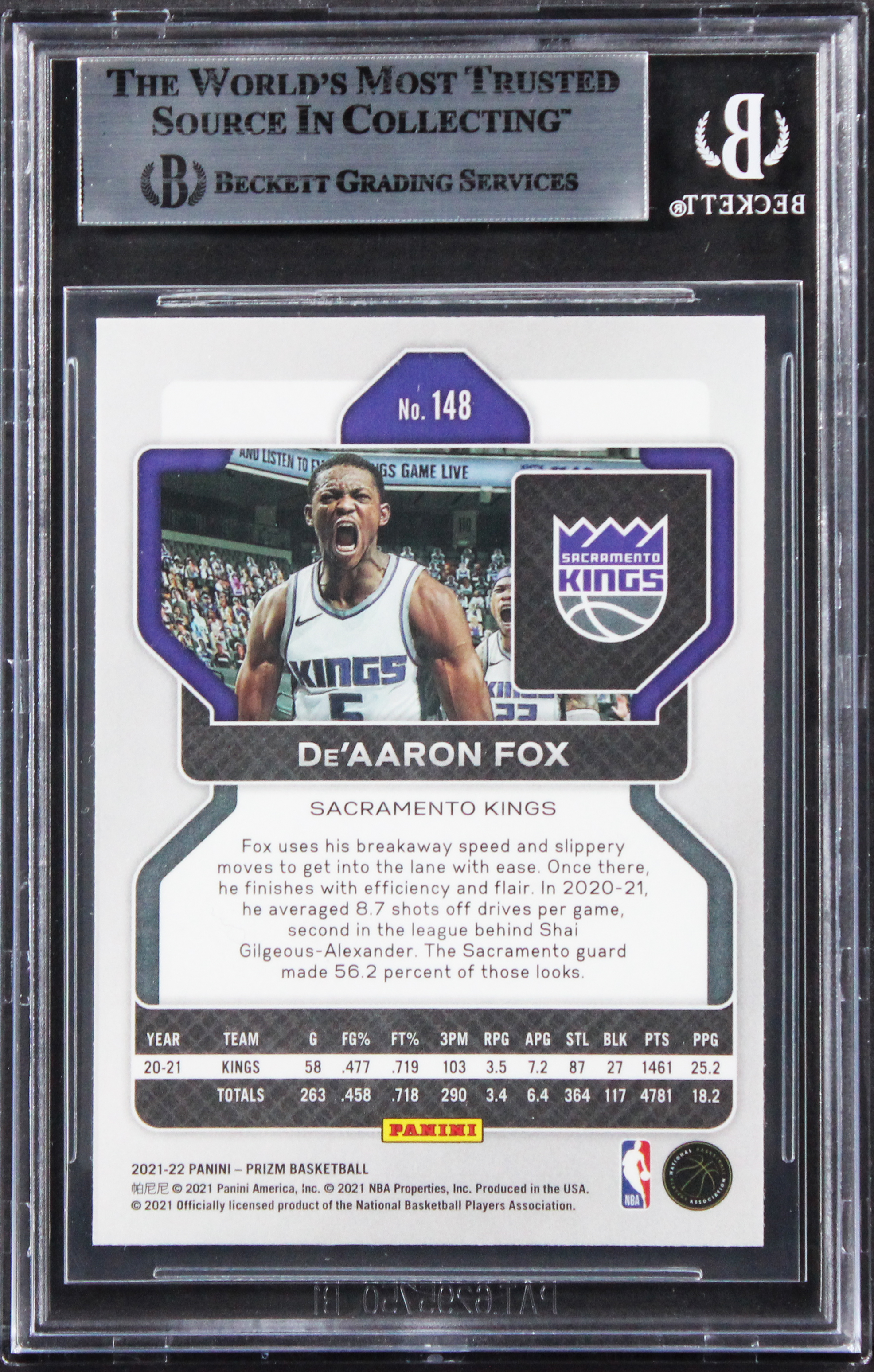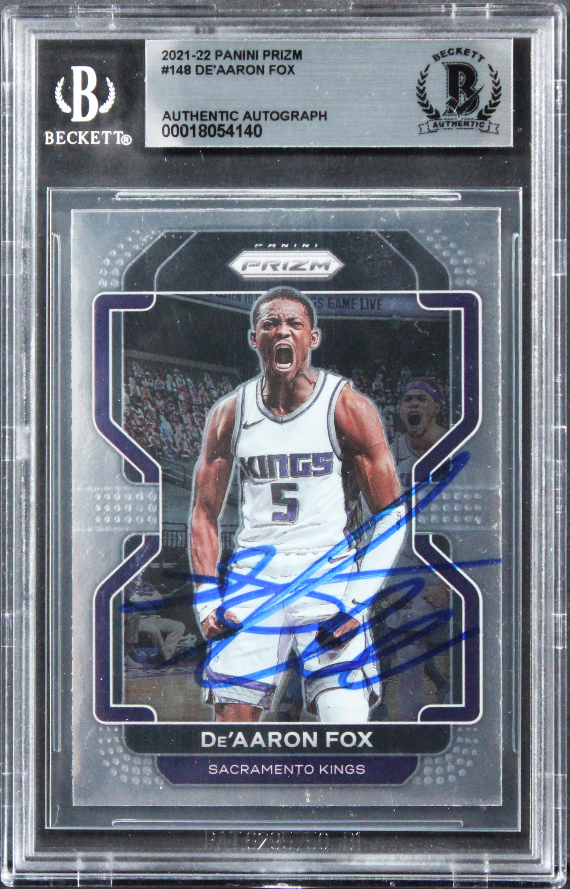 This Autographed 2021 Panini Prizm #148 Card has been Personally Signed by De'Aaron Fox of the Sacramento Kings. This item is 100% Authentic, it comes slabbed and authenticated by Beckett Authentication Services. The authenticity can be verified on Beckett Authentication Services website.