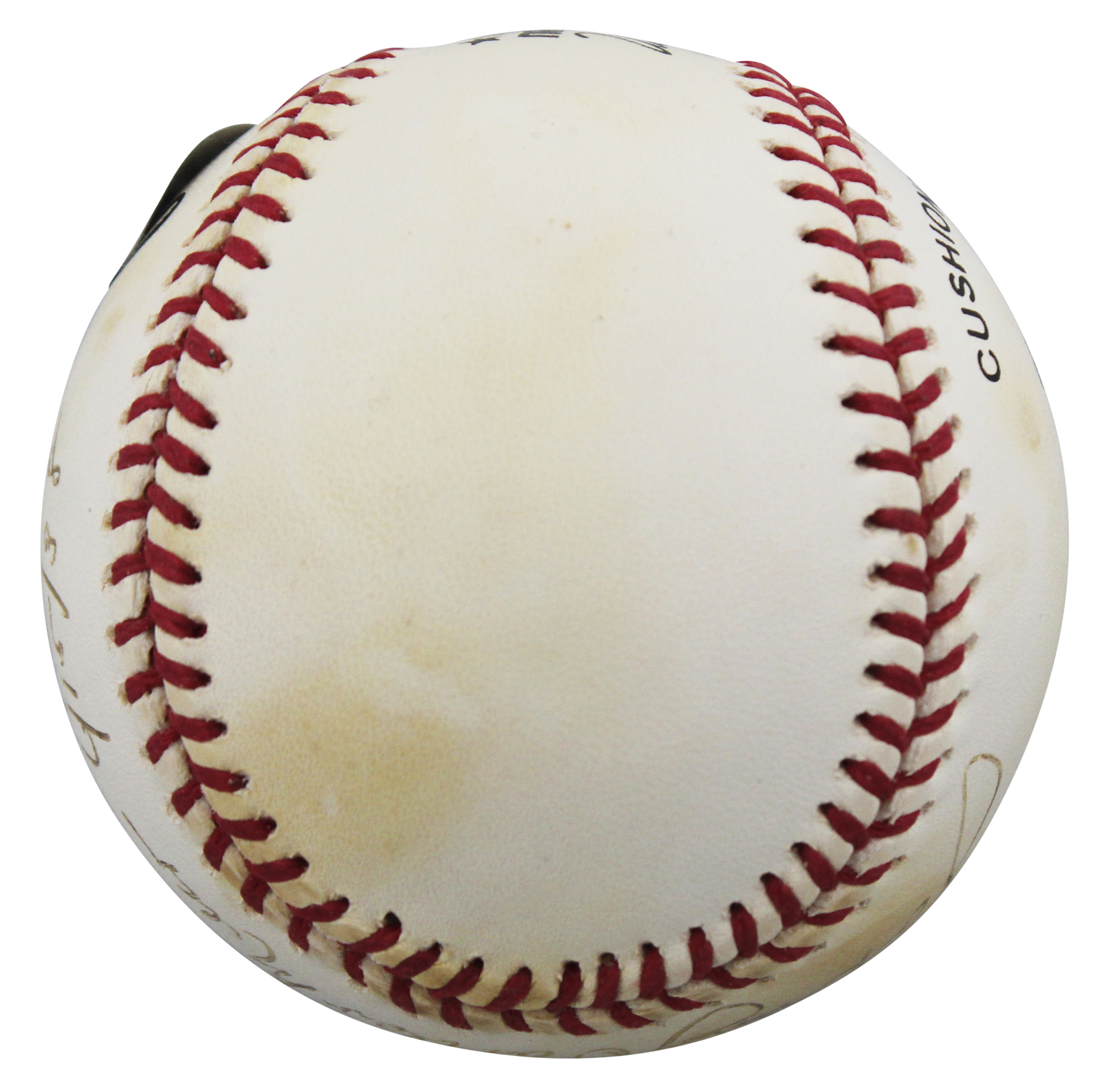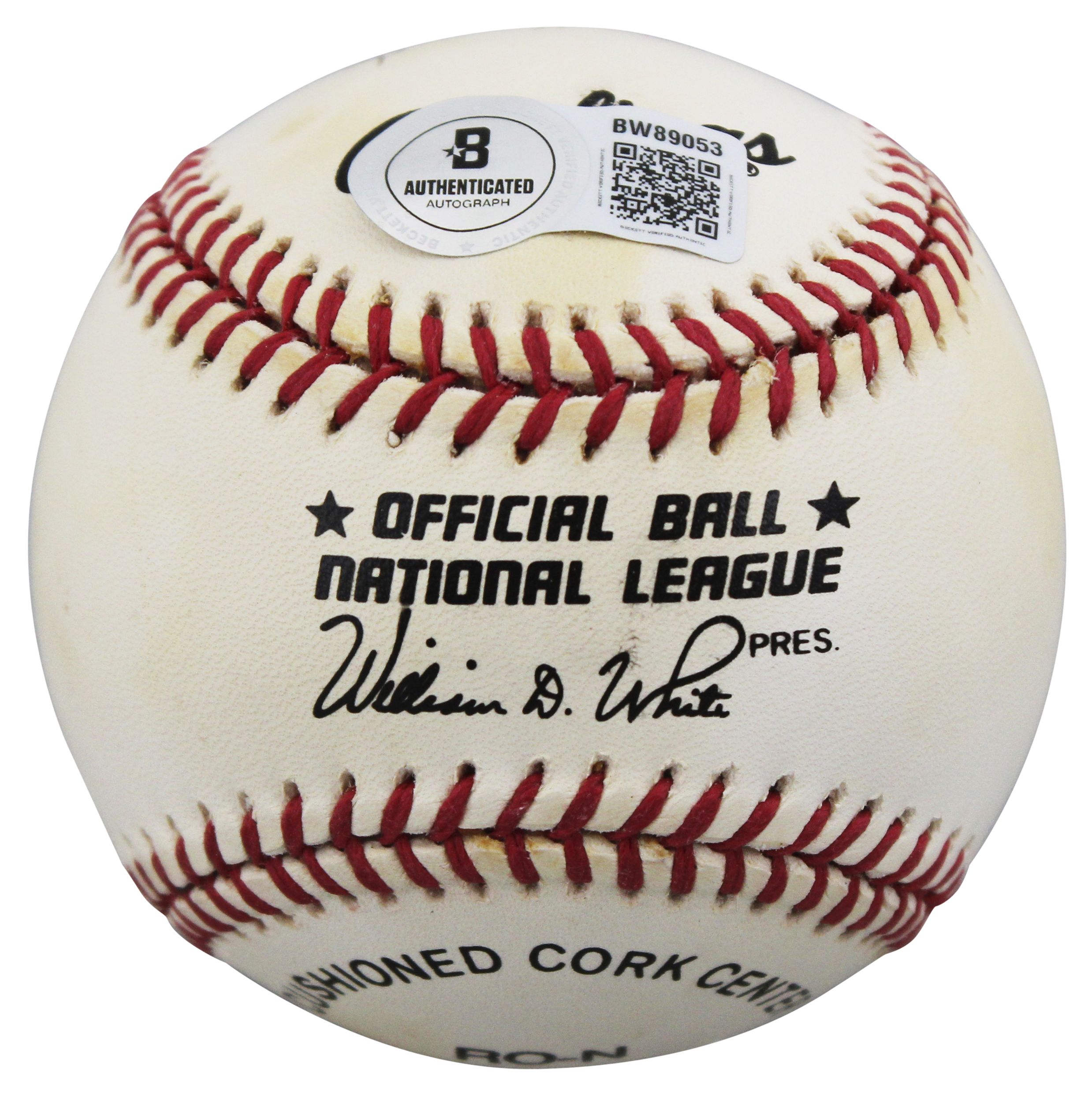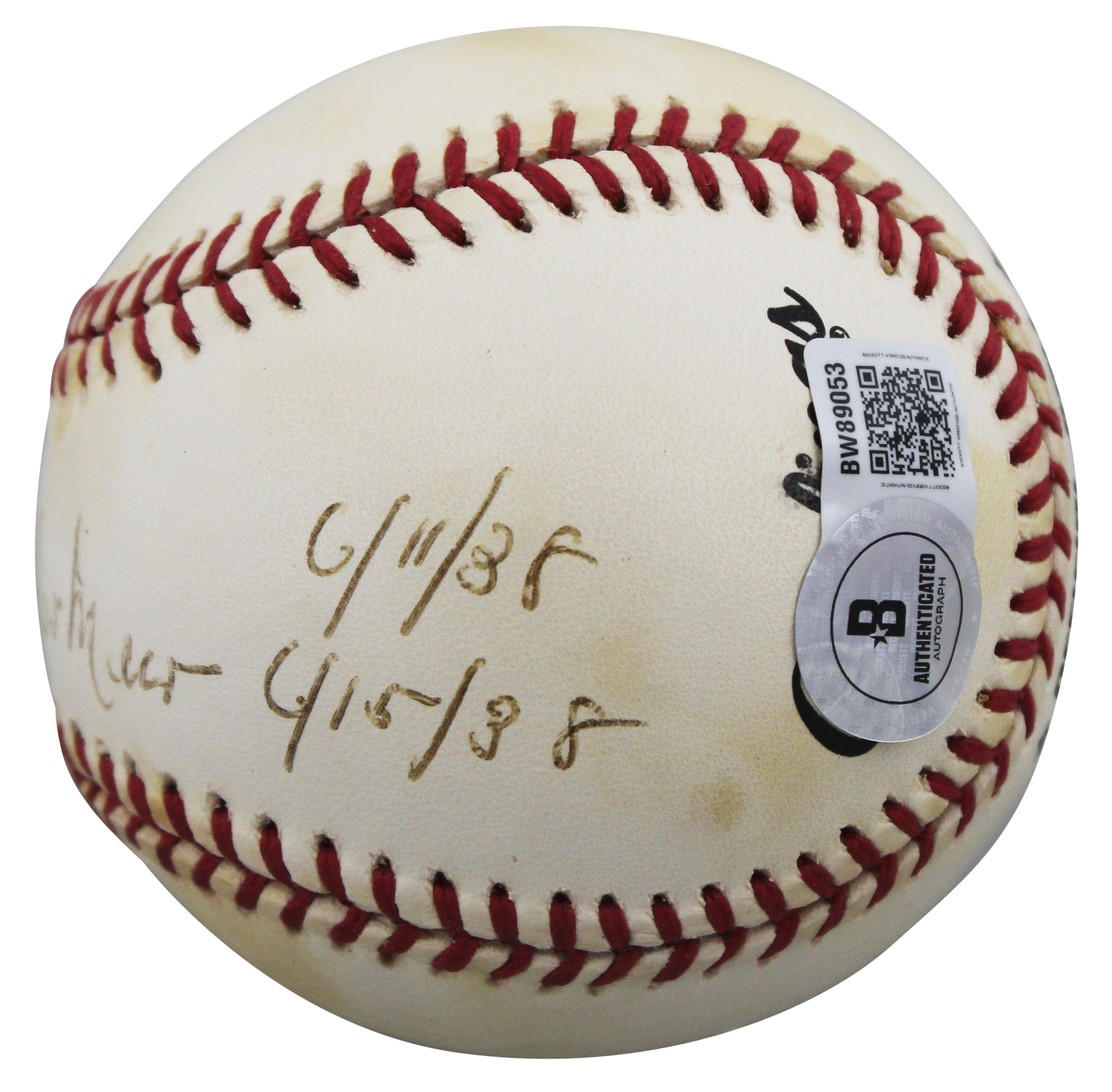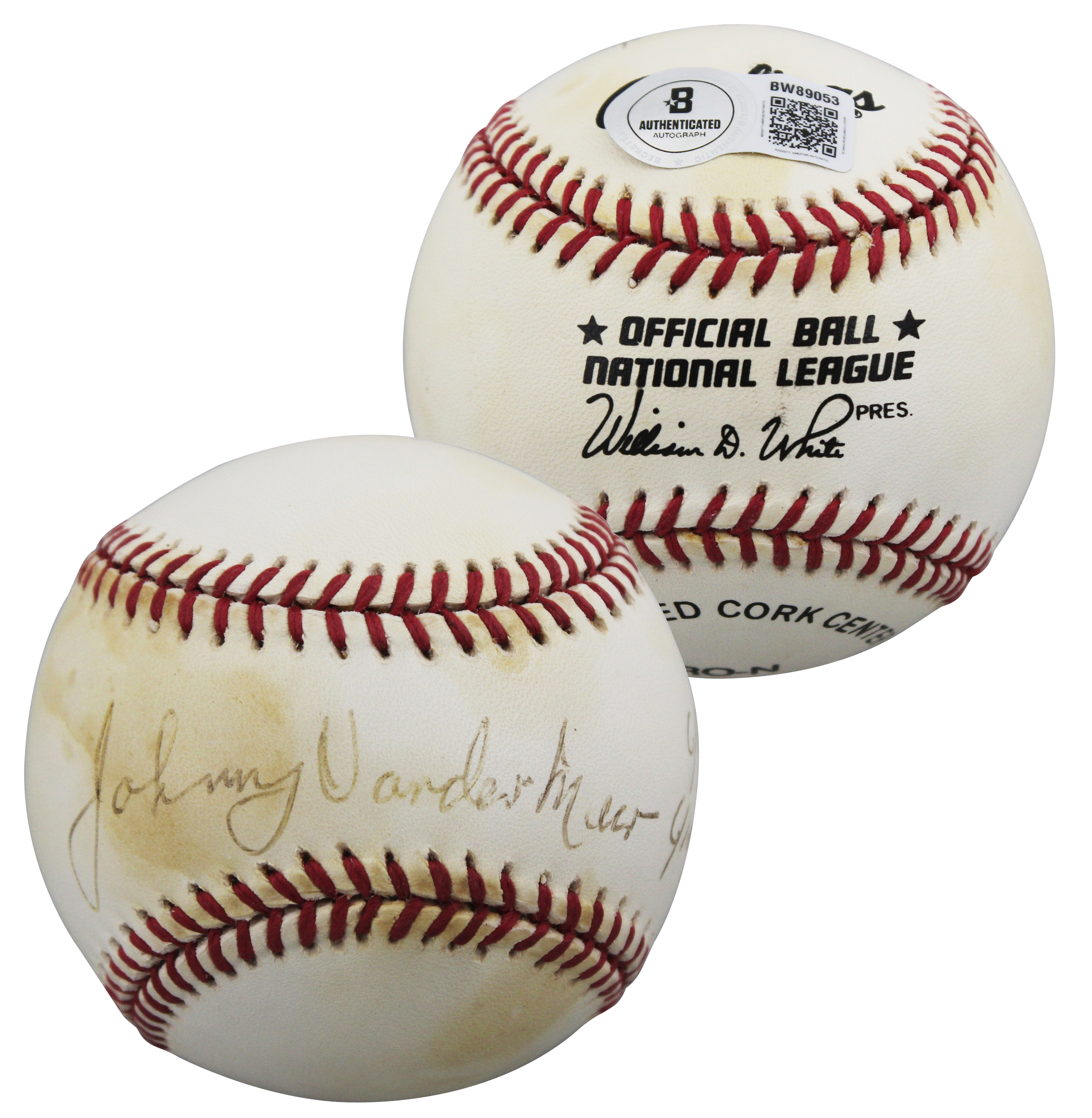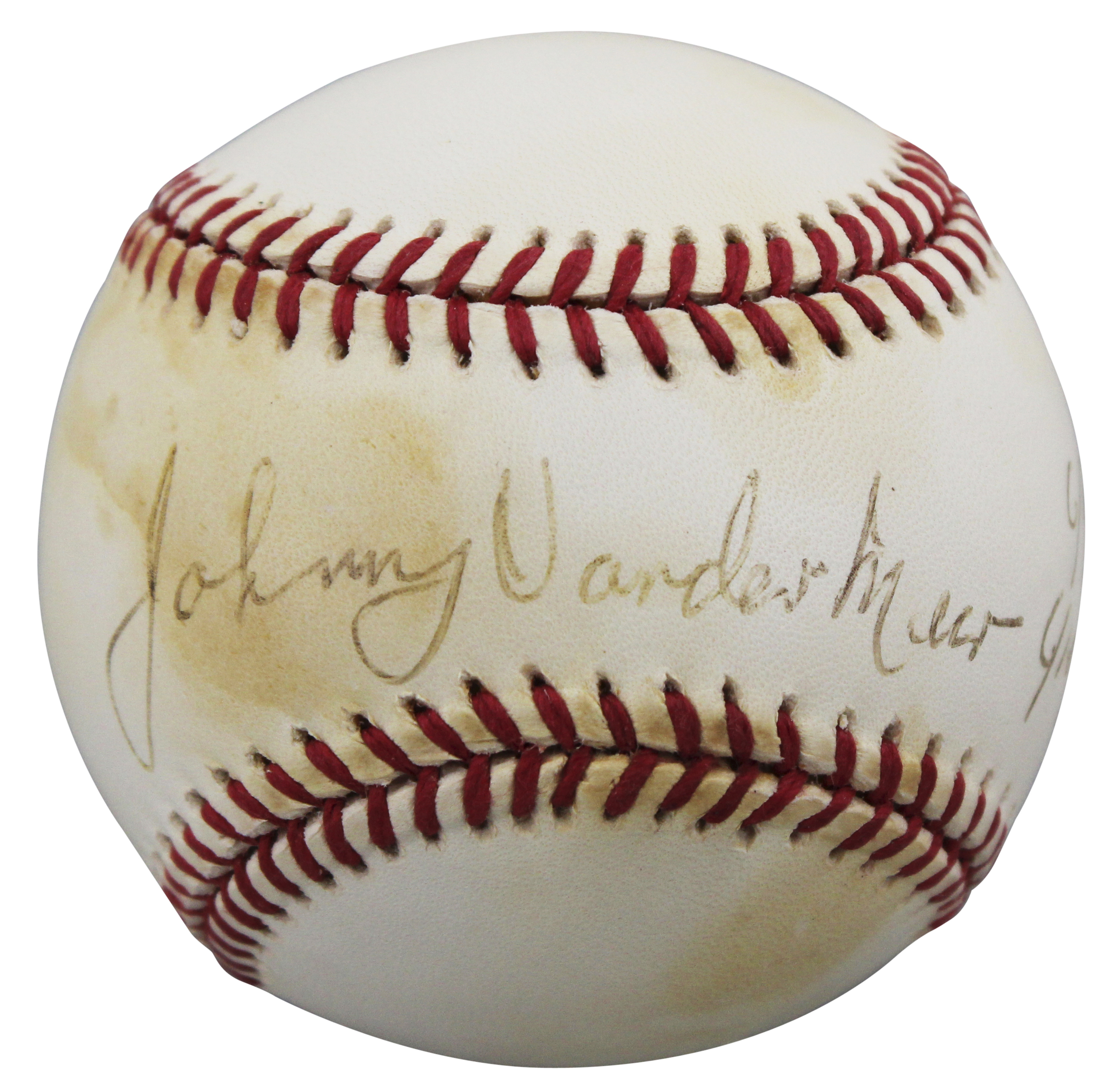This Autographed William White Baseball with the inscription of "6/11/38, 6/15/38" has been Personally Signed by Johnny Vander Meer of the Cincinnatti Reds. This item is 100% Authentic to include a hologram by Beckett Authentication Services. This item will come with an affixed Beckett Authentication Services (BAS) authentication sticker, which includes a scannable QR code to verify authenticity. Please note that Beckett no longer provides serial-numbered COA cards, and the attached BAS sticker will serve as the complete authentication for this item. The authenticity can be verified on Beckett Authentication Services website. This baseball has some toning due to age. Please refer to pictures for item's condition prior to purchase.