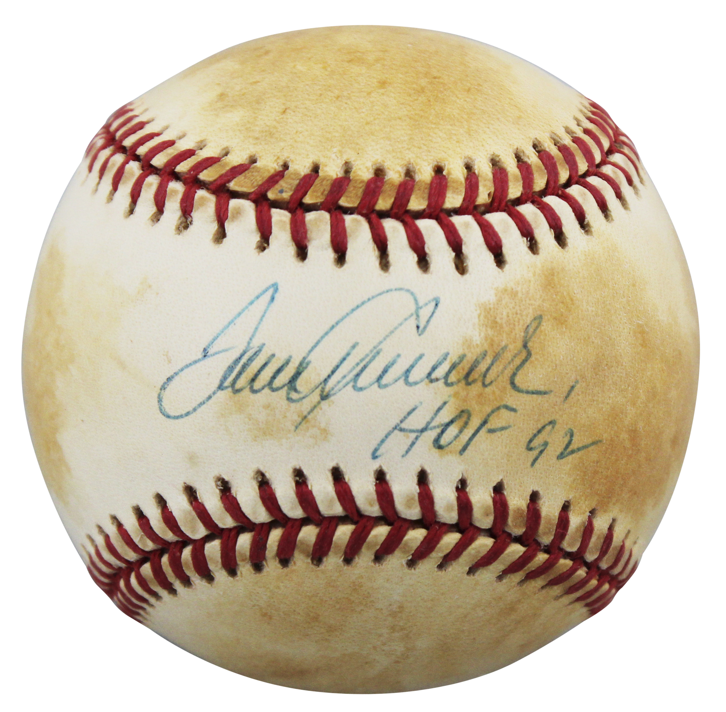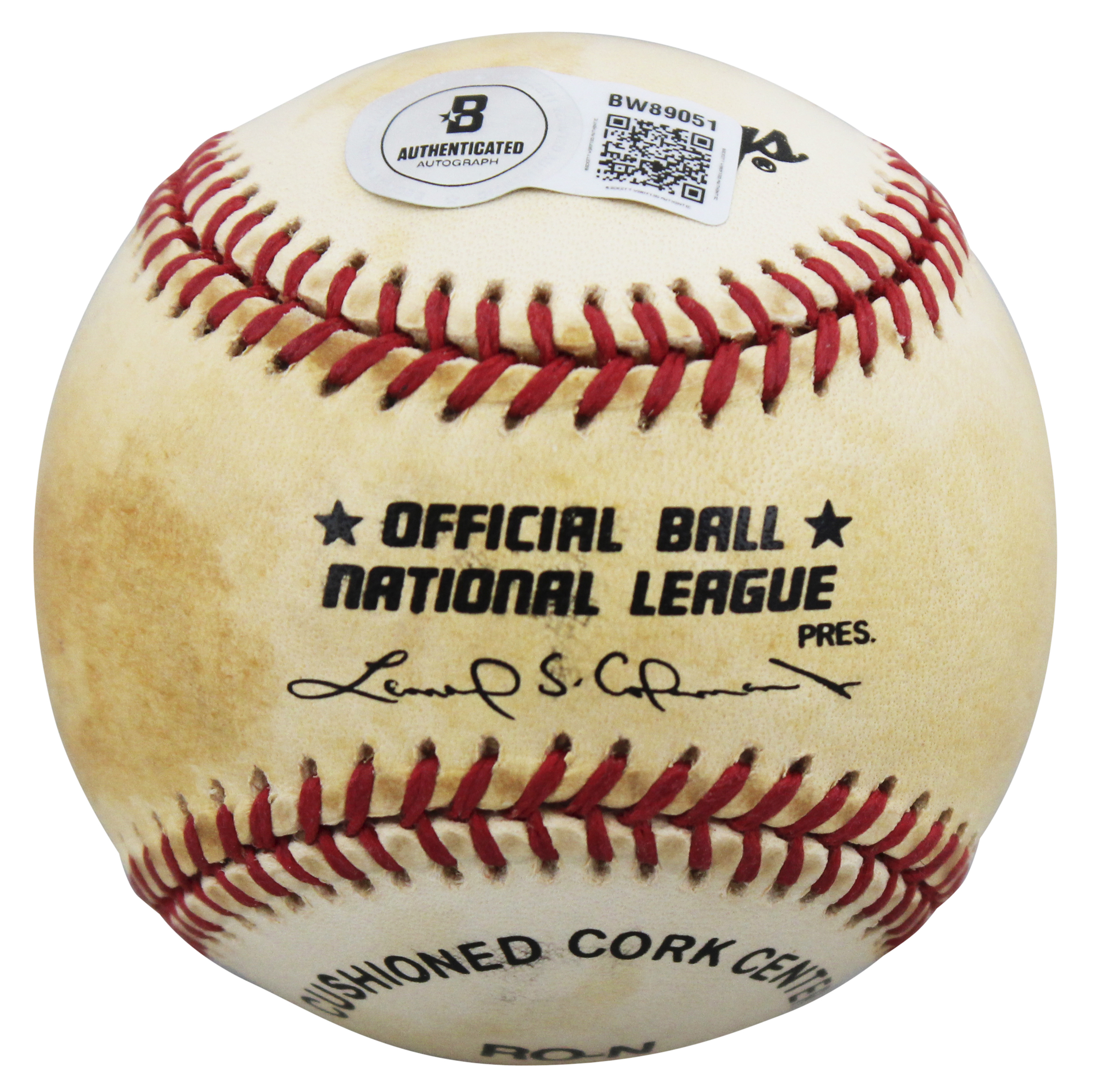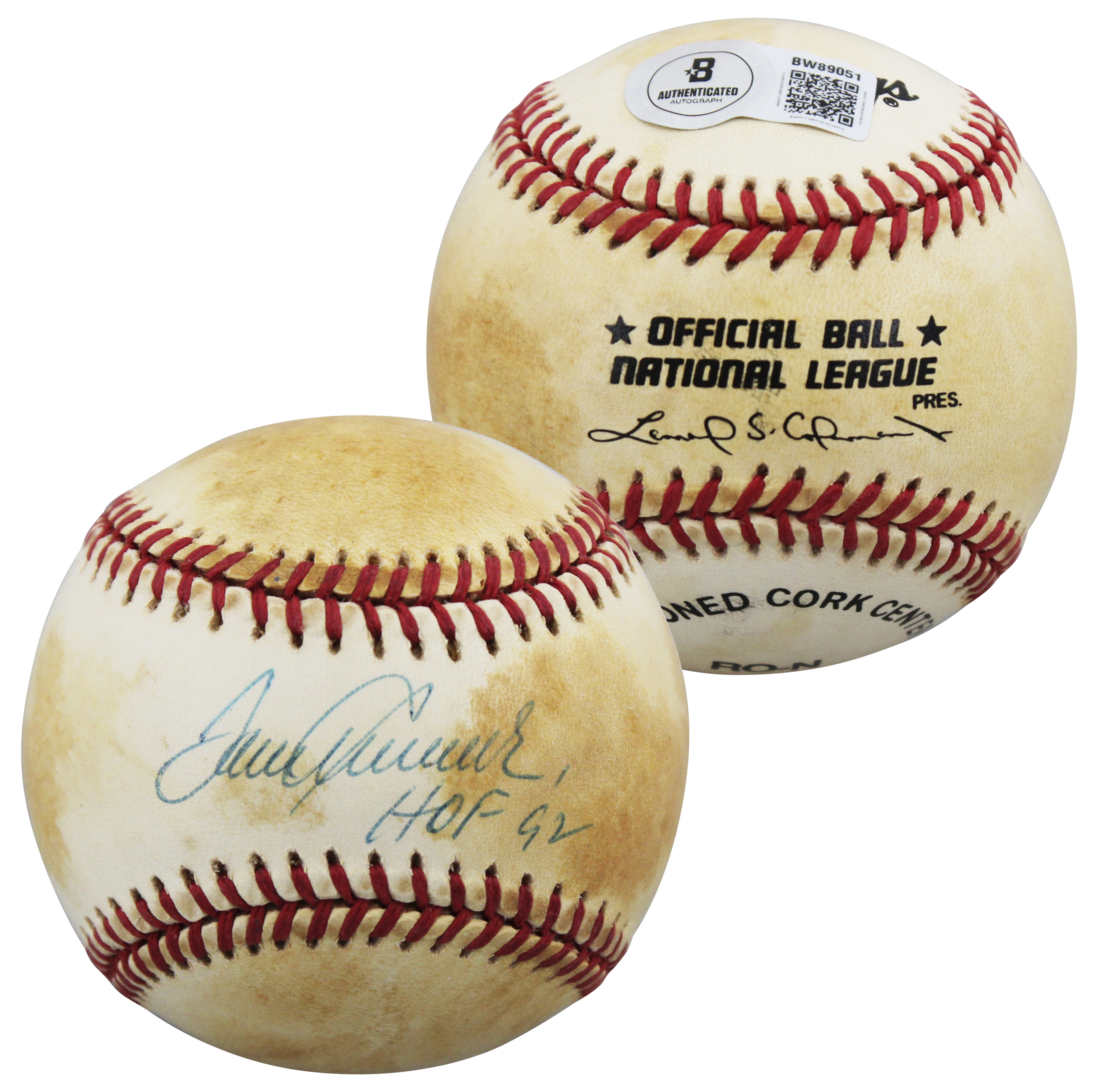 This Autographed Leonard Coleman Baseball with the inscription of "HOF 92" has been Personally Signed by Tom Seaver of the New York Mets. This item is 100% Authentic to include a hologram by Beckett Authentication Services. This item will come with an affixed Beckett Authentication Services (BAS) authentication sticker, which includes a scannable QR code to verify authenticity. Please note that Beckett no longer provides serial-numbered COA cards, and the attached BAS sticker will serve as the complete authentication for this item. The authenticity can be verified on Beckett Authentication Services website. This baseball has some toning due to age. Please refer to pictures for item's condition prior to purchase.