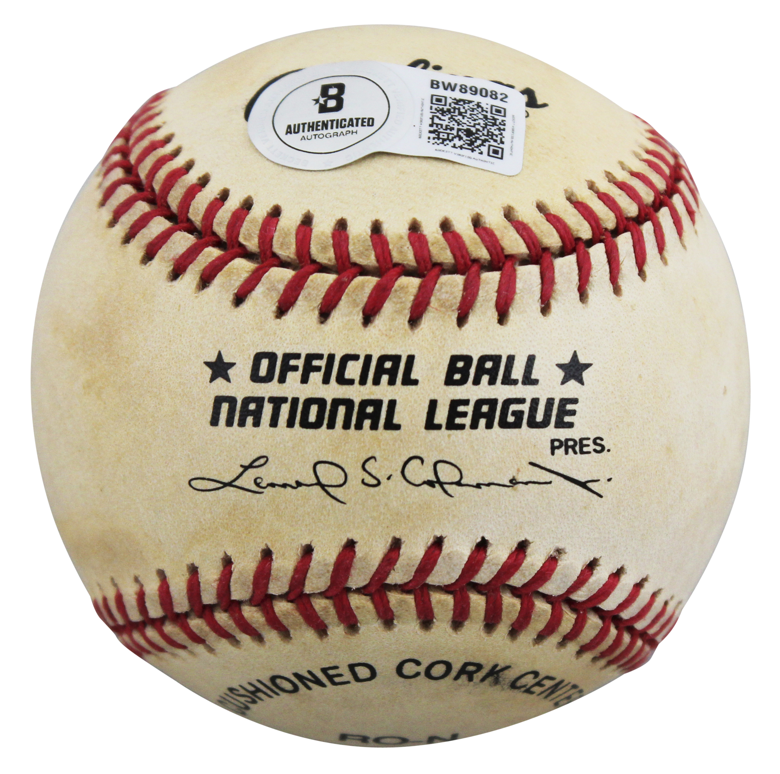 This Autographed Leonard Coleman Baseball has been Personally Signed by Fernando Valenzuela of the Los Angeles Dodgers. This item is 100% Authentic to include a hologram by Beckett Authentication Services. This item will come with an affixed Beckett Authentication Services (BAS) authentication sticker, which includes a scannable QR code to verify authenticity. Please note that Beckett no longer provides serial-numbered COA cards, and the attached BAS sticker will serve as the complete authentication for this item. The authenticity can be verified on Beckett Authentication Services website. This baseball has some toning due to age. Please refer to pictures for item's condition prior to purchase.