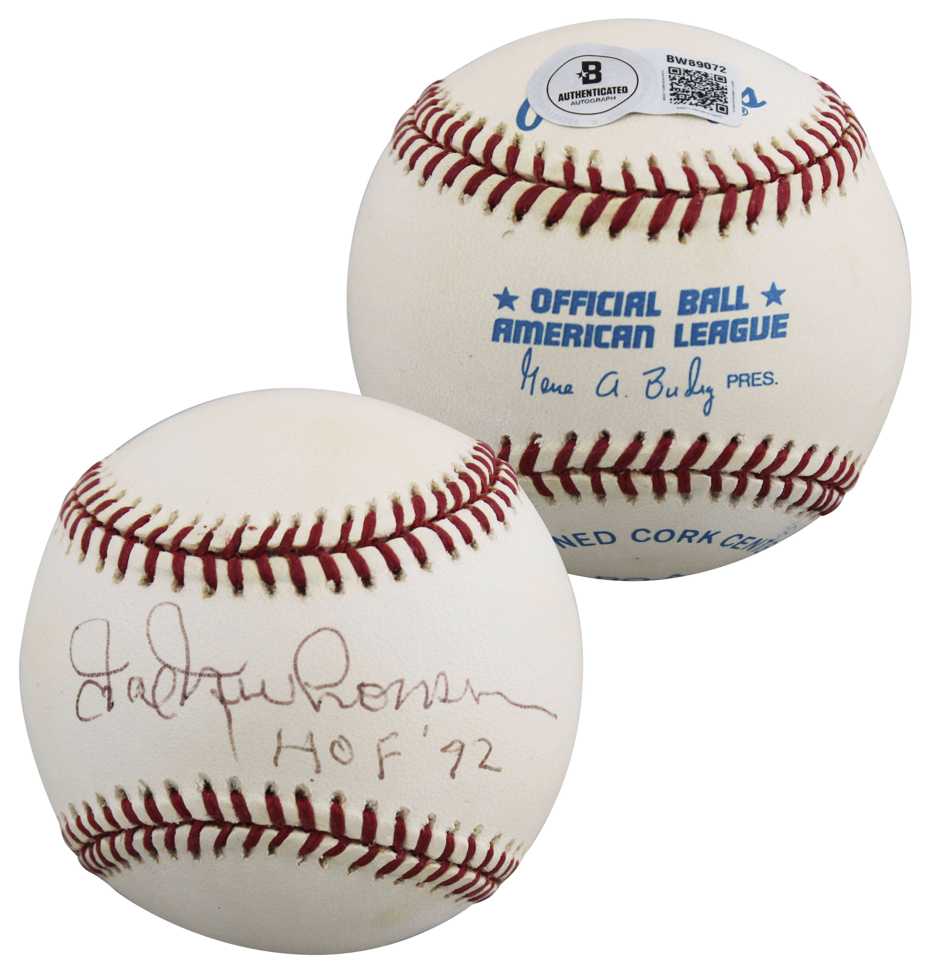 This Autographed Gene Budig Baseball with the inscription of "HOF 92" has been Personally Signed by Hal Newhouser of the Detroit Tigers. This item is 100% Authentic to include a hologram by Beckett Authentication Services. This item will come with an affixed Beckett Authentication Services (BAS) authentication sticker, which includes a scannable QR code to verify authenticity. Please note that Beckett no longer provides serial-numbered COA cards, and the attached BAS sticker will serve as the complete authentication for this item. The authenticity can be verified on Beckett Authentication Services website. This baseball has some toning due to age. Please refer to pictures for item's condition prior to purchase.