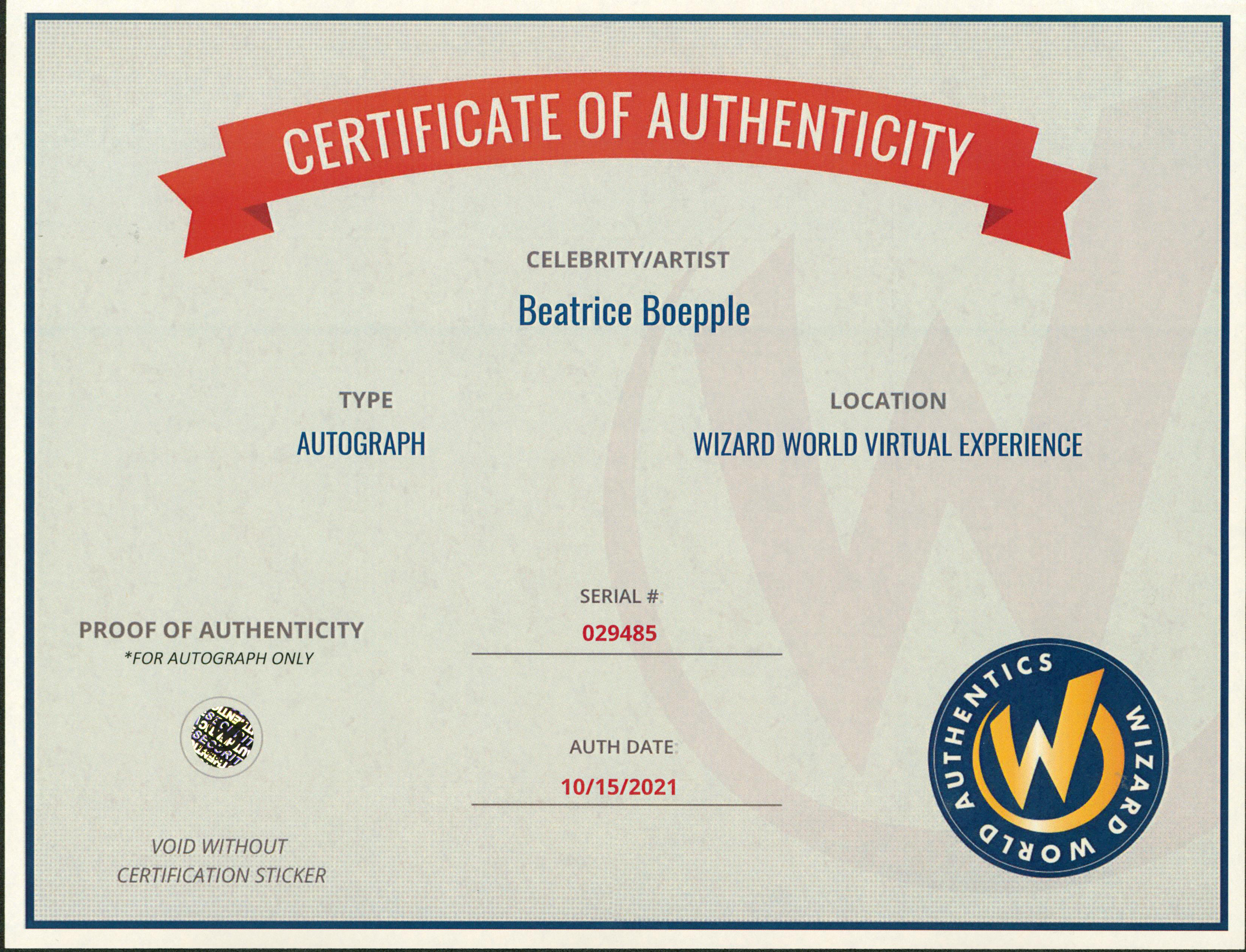 This Autographed 8x10 Photo has been Personally Signed by Beatrice Boepple of A Nightmare On Elm Street. This item is 100% Authentic to include a Certificate of Authenticity (COA) / hologram by Wizard World Authentics. A Wizard World Authentics representative was present when this item was being signed, the date of the signing is notated on the COA. The authenticity can be verified on Wizard World Authentics website.