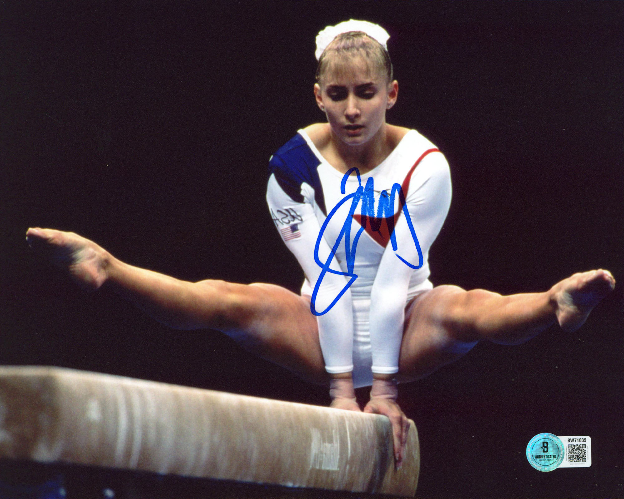 This Autographed Team USA Horizontal 8x10 Photo has been Personally Signed by Shannon Miller. This item is 100% Authentic to include a hologram by Beckett Authentication Services. This item will come with an affixed Beckett Authentication Services (BAS) authentication sticker, which includes a scannable QR code to verify authenticity. Please note that Beckett no longer provides serial-numbered COA cards, and the attached BAS sticker will serve as the complete authentication for this item. The authenticity can be verified on Beckett Authentication Services website. This photo has a slightly spotty signature.